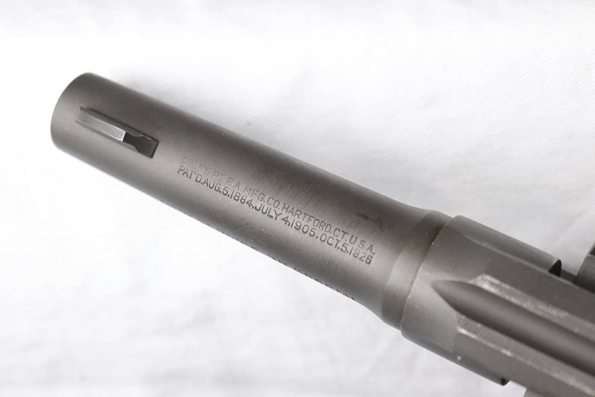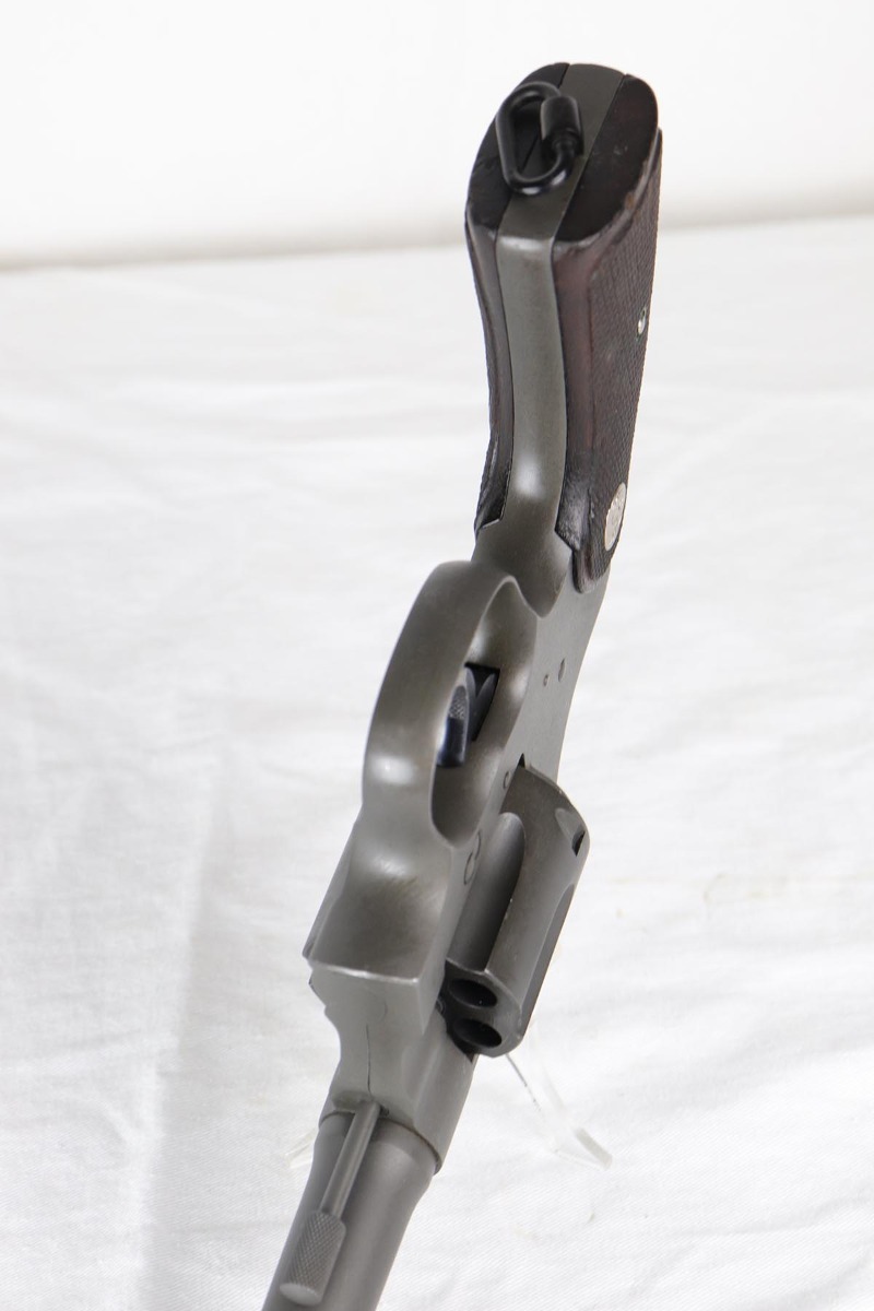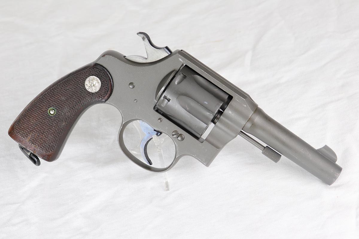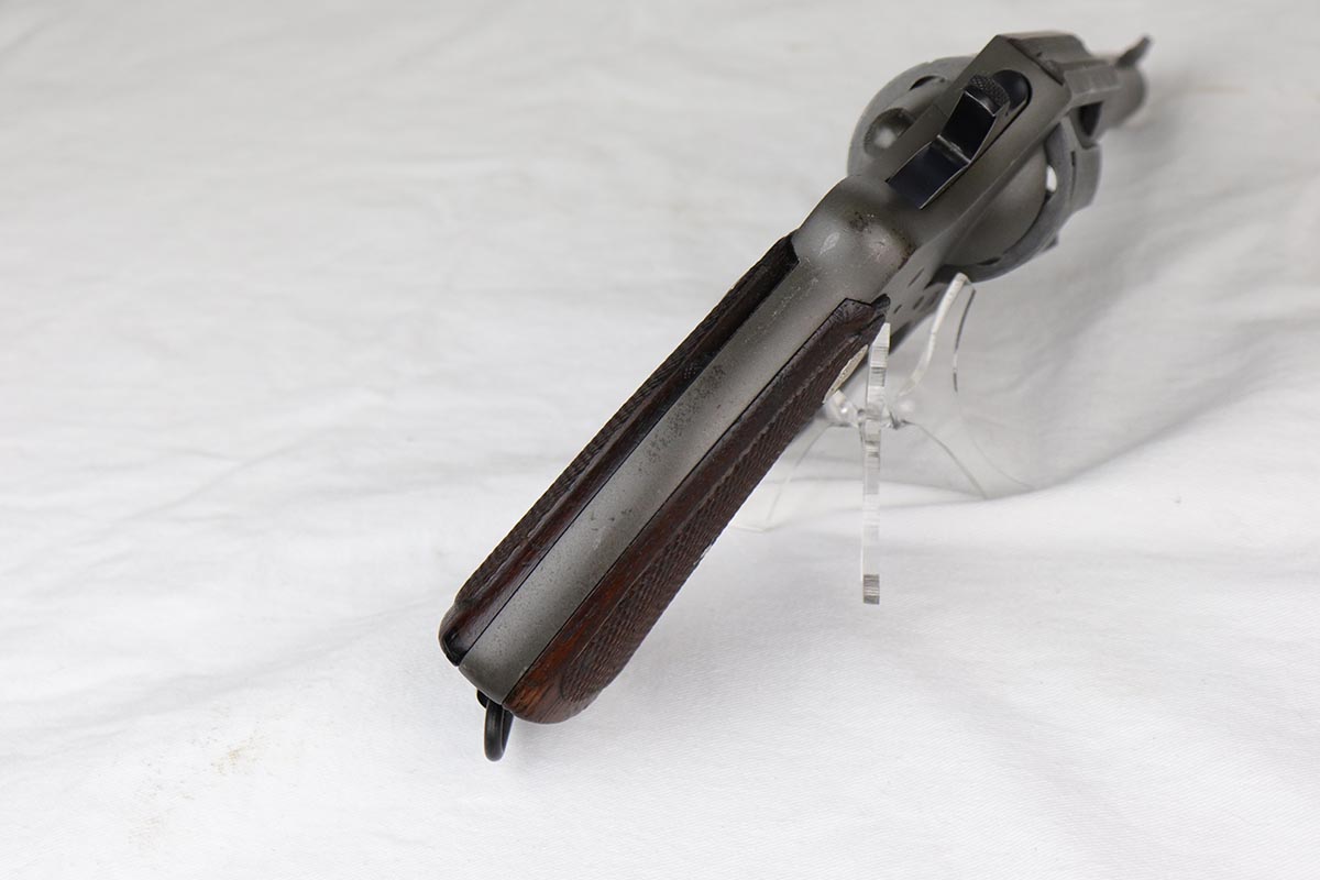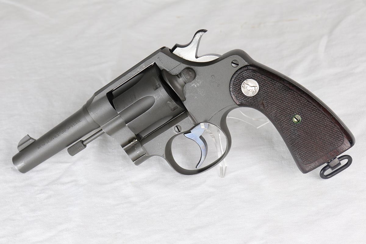 5/12/20 – This is a Colt New Service Model in .38 special that was made in 1937. It was sitting on a shelf at Colt (they were backlogged on sales) until war broke out in Europe following the British defeat at Dunkirk (If you saw “Darkest Hour” then you know how desperate things were in England). In July of 1940, The British government placed an order with Colt for “all available handguns suitable for military use”. Along with some 1200 automatic pistols, every available New Service revolver was taken off the shelf and sent to England. It is estimated that this order had 1533 revolvers – this one included. There is a parkerized 38 Special, New Service, #340680 (very close to this one) documented in Bob Murphy’s book, Colt New Service Revolvers. There is a tiny British proof on the left side of the frame. These are often found parkerized but I am not sure if that was done in the US or in England. After the war, this gun came back to the US but there are no import marks on it. This is a historical gun left over from the Battle of Britain.