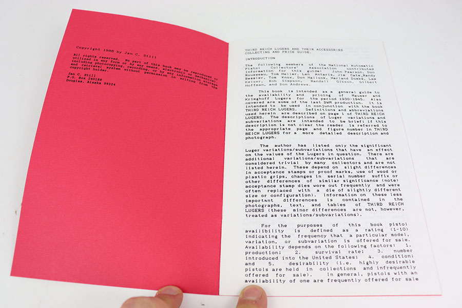 3/29/24 – This is a new condition copy of Jan C. Still’s collector resource book, “Third Reich Lugers And Their Accessories” Volume 3 of his series on WW2 Axis pistols. This book also comes with the “Collecting and Price Guide by Jan C Still.” No scratches, dings, or imperfections. Pages are white and crisp. Great WW2 Luger collector resource book, no longer in print and in new condition.