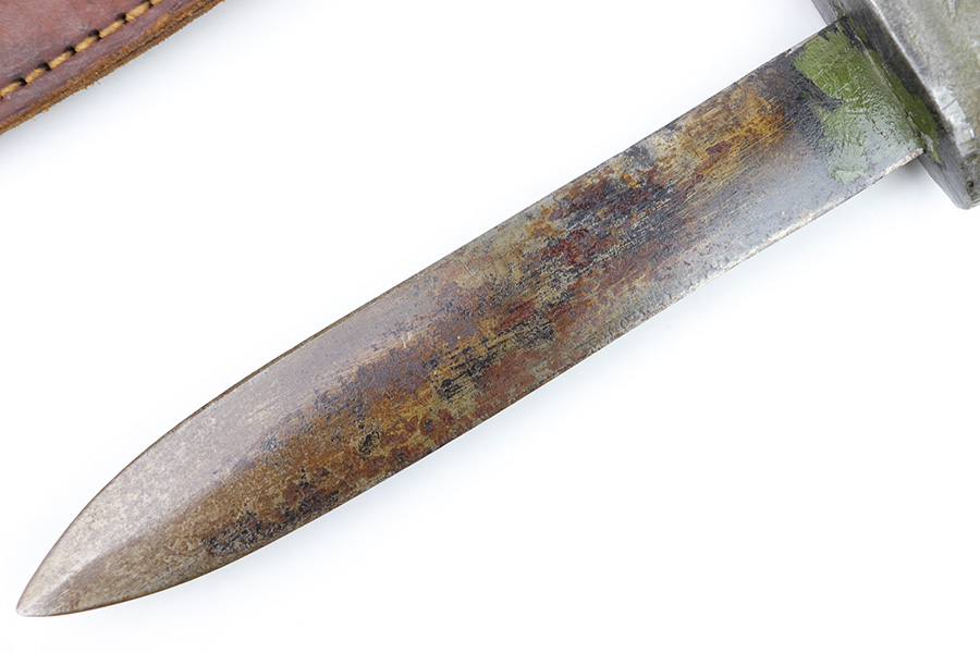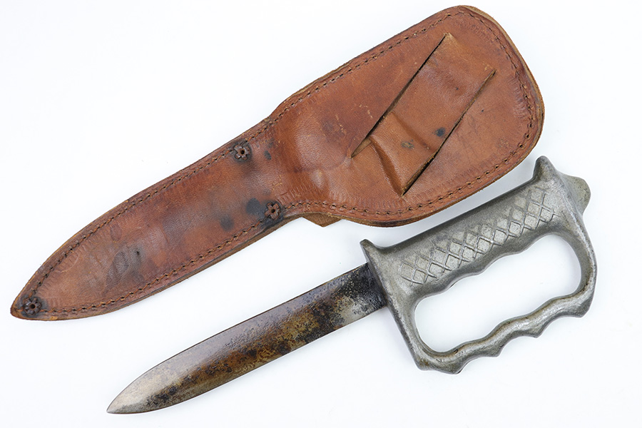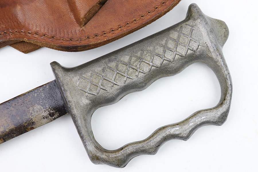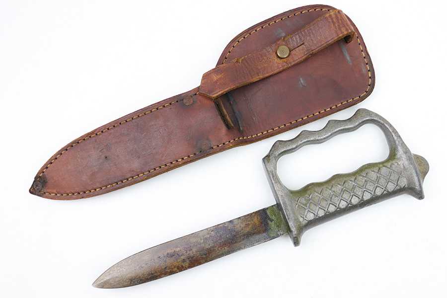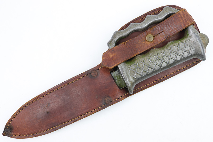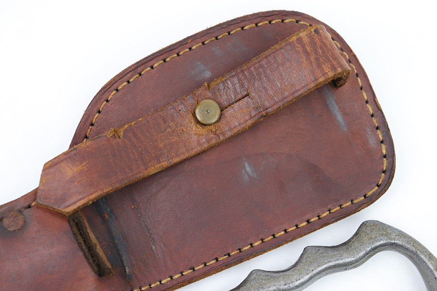 1/18/23 – This is an original WW2 era production New Zealand Commando Knuckle Knife with an original leather scabbard. These WW2 fighting knives are scarce and fairly desirable. The knife blade is worn with dark patina throughout and surface oxidation. There’s no deep rust or pitting however, and the edge is unsharpened. The base of the blade and some small portions of the handle still have traces of the original olive green paint. There appears to be a faint maker stamp on one side of the blade base, but it’s too hard to decipher. The blade is magnetic, but the handle is aluminum and non-magnetic. Comes with an original leather scabbard in great overall condition.