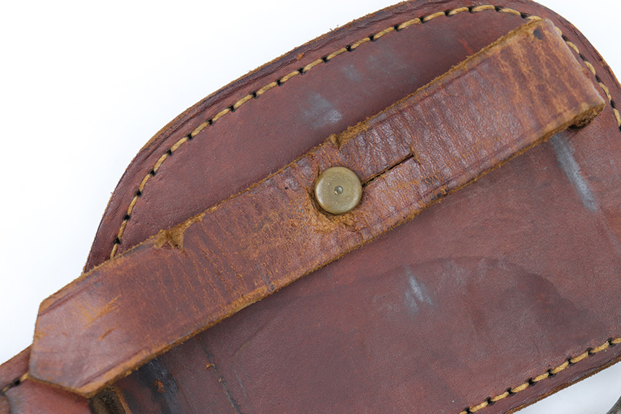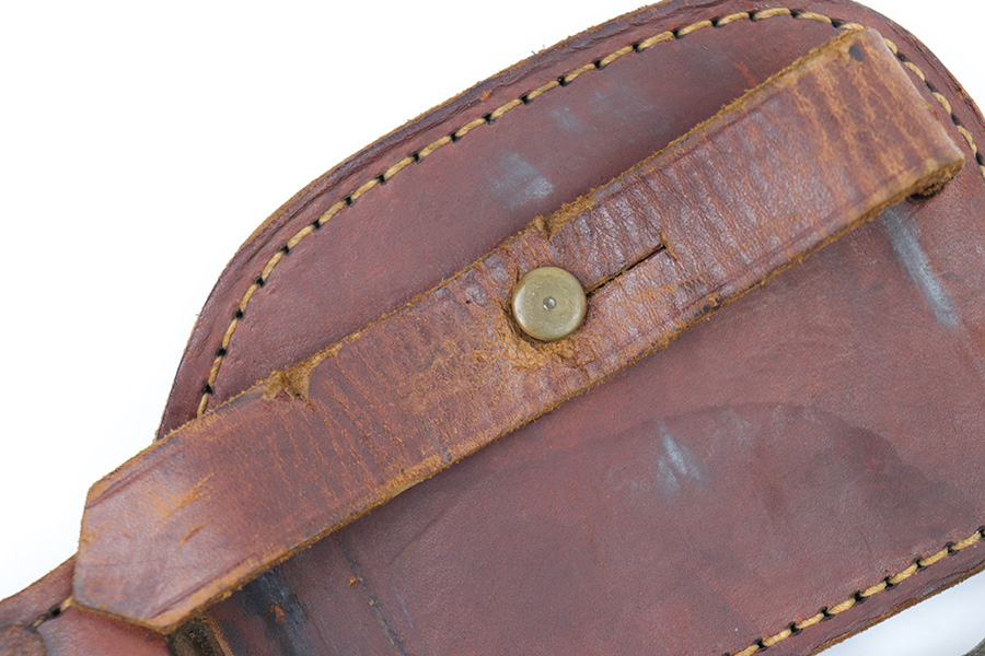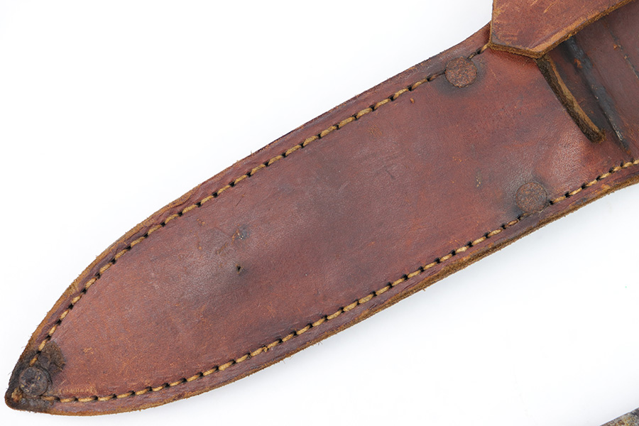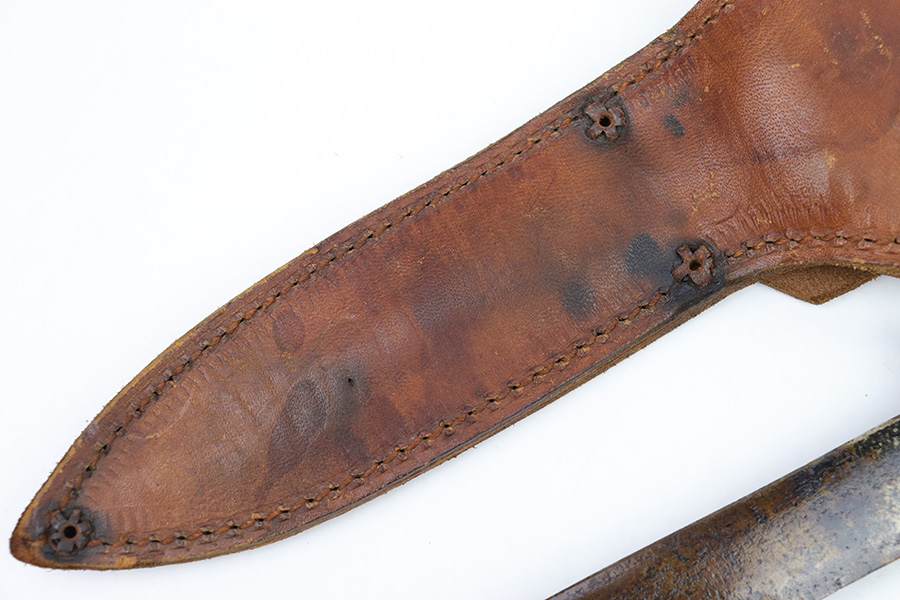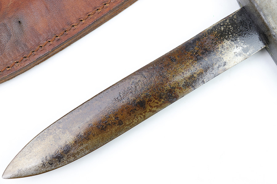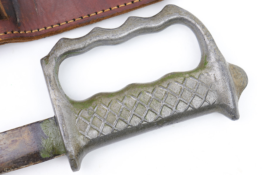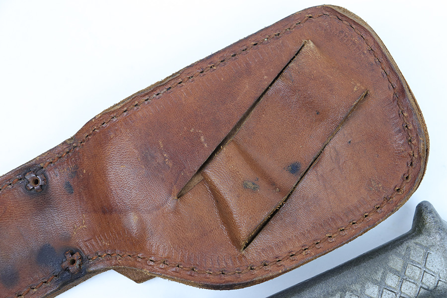 1/18/23 – This is an original WW2 era production New Zealand Commando Knuckle Knife with an original leather scabbard. These WW2 fighting knives are scarce and fairly desirable. The knife blade is worn with dark patina throughout and surface oxidation. There’s no deep rust or pitting however, and the edge is unsharpened. The base of the blade and some small portions of the handle still have traces of the original olive green paint. There appears to be a faint maker stamp on one side of the blade base, but it’s too hard to decipher. The blade is magnetic, but the handle is aluminum and non-magnetic. Comes with an original leather scabbard in great overall condition.