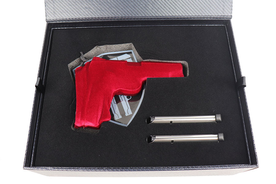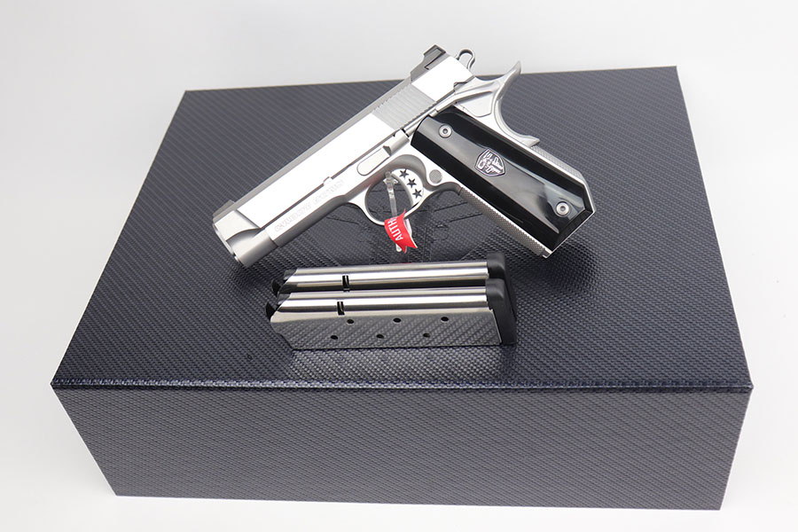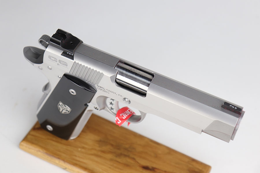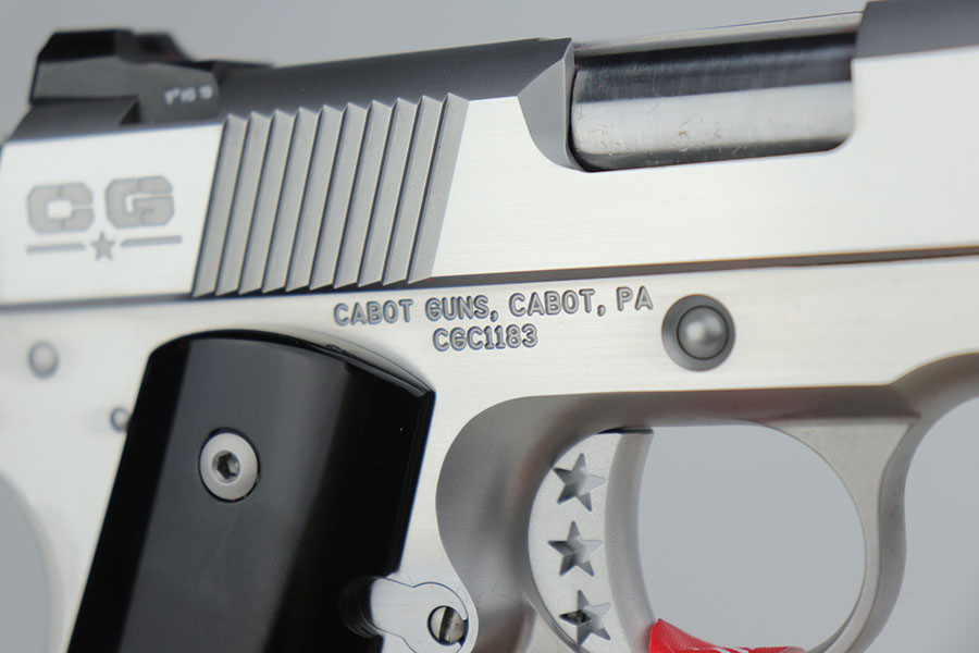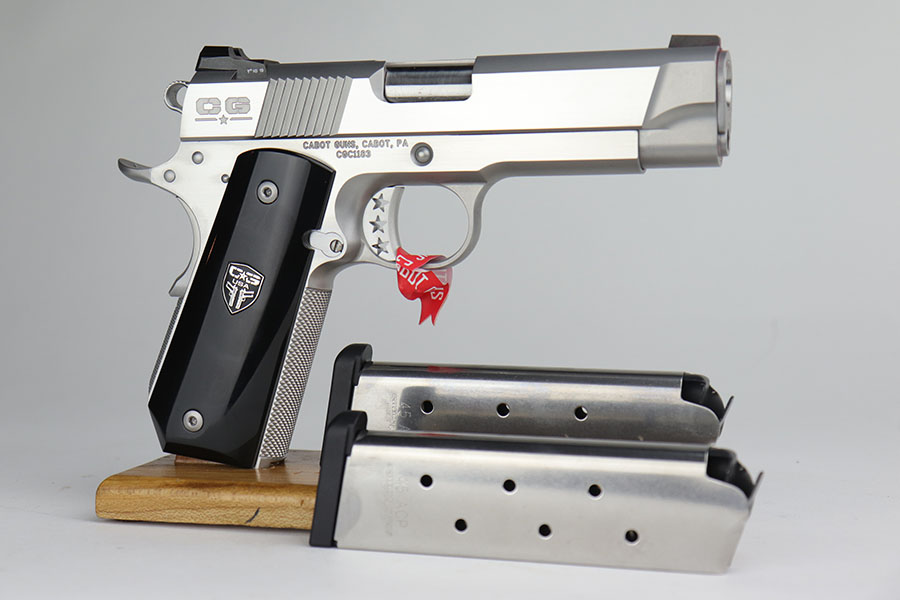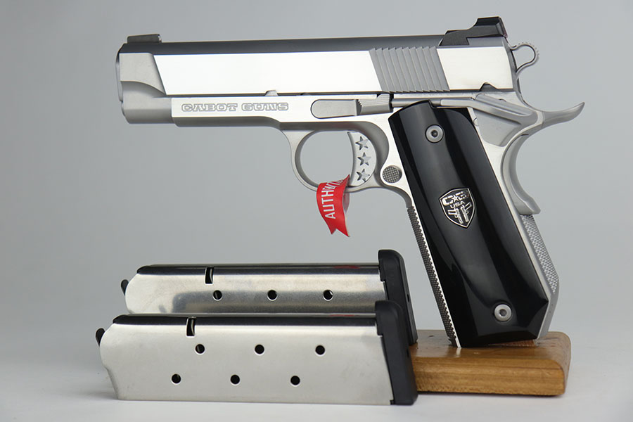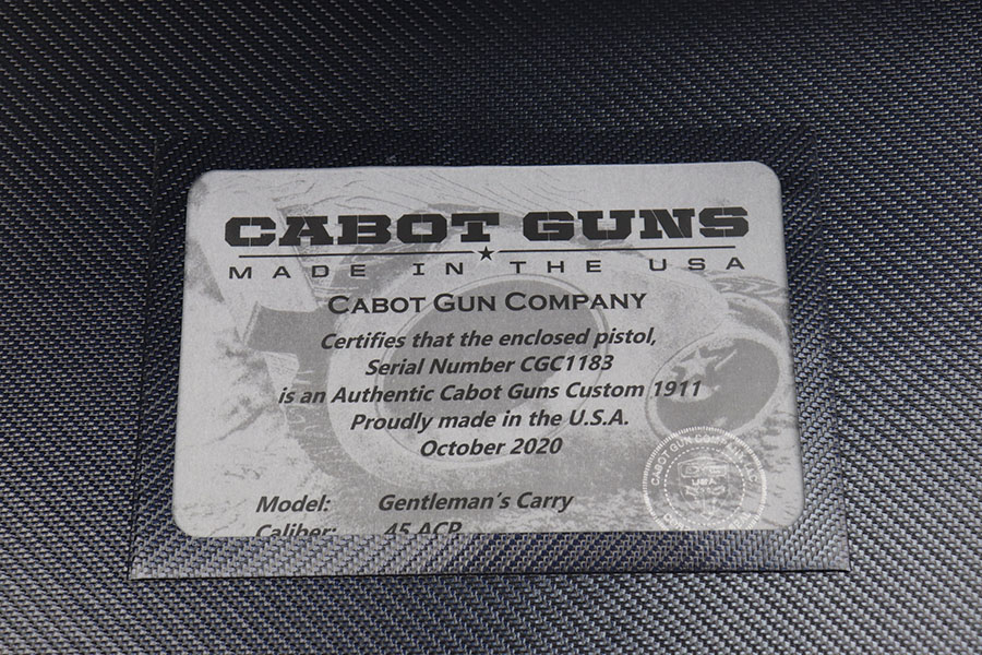 11/11/20 – This is a new in box Cabot Gentleman’s Carry 1911 that just arrived here in factory sealed packaging. It comes with the beautiful, custom Cabot case, manual, spare magazine, test cartridge, etc. Other features include stainless steel parts with hand polished flats, 4.25 inch barrel, carry cut slide, idiot scratch proof slide stop, aluminum TriStar trigger, ebony smooth grips with Cabot medallion, tritium sights and more.