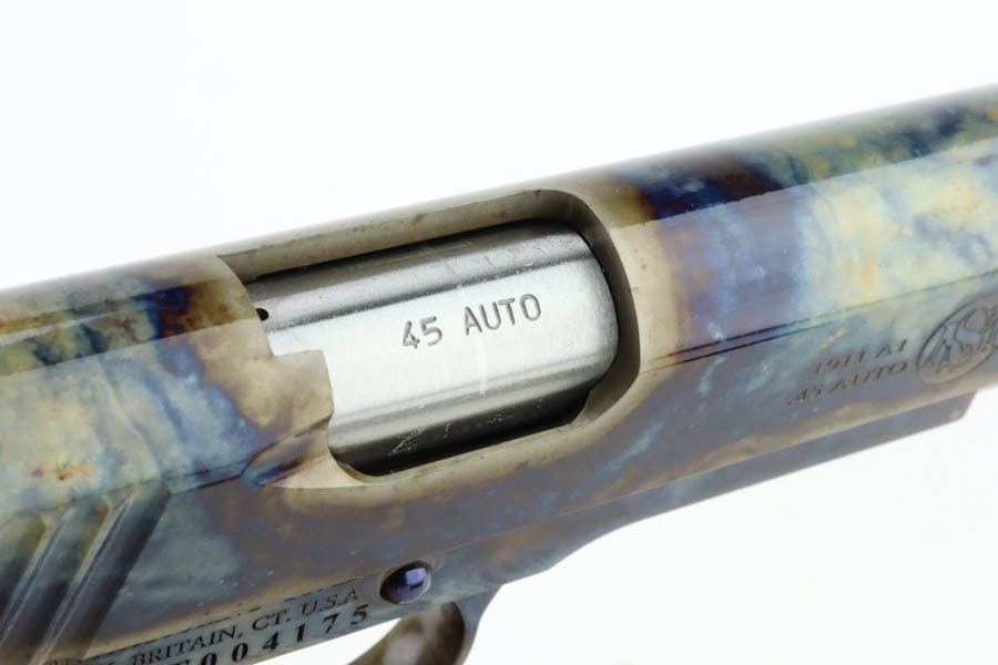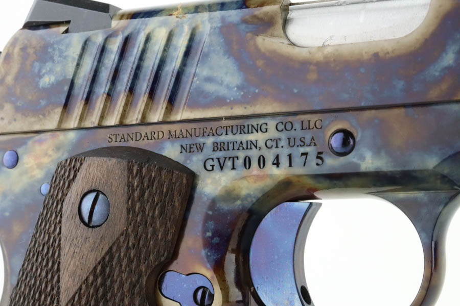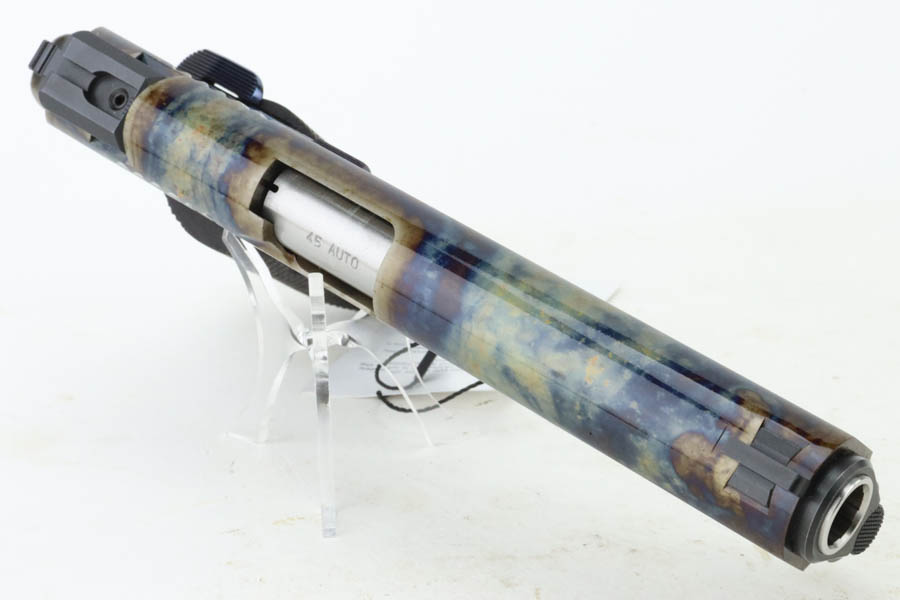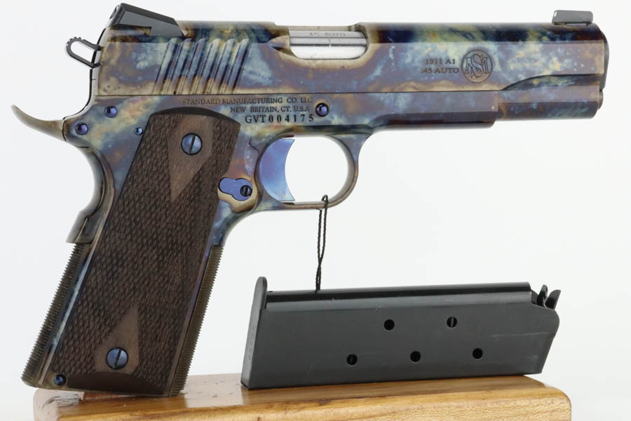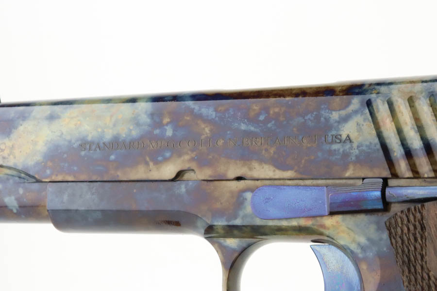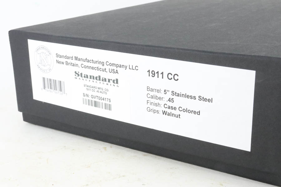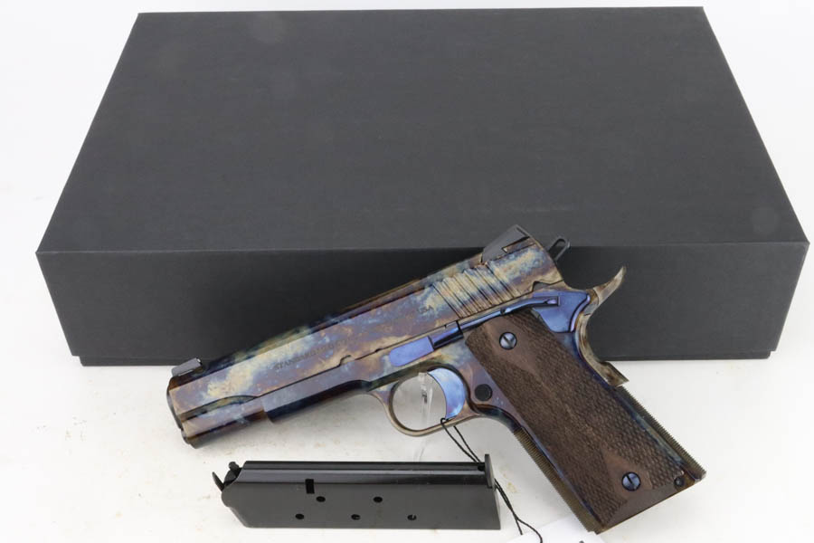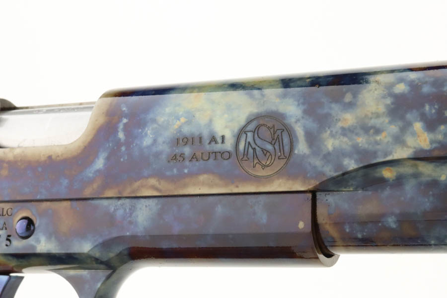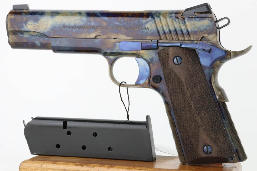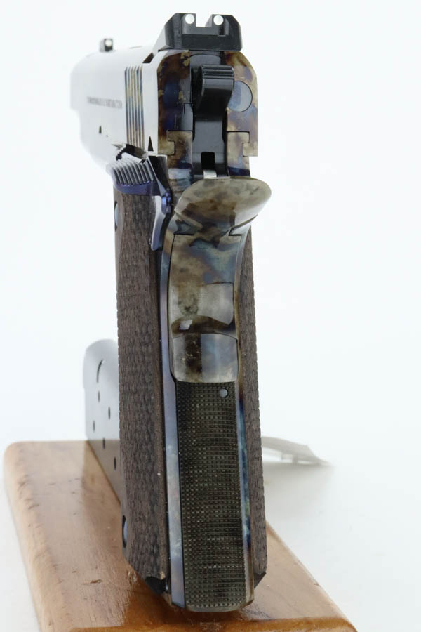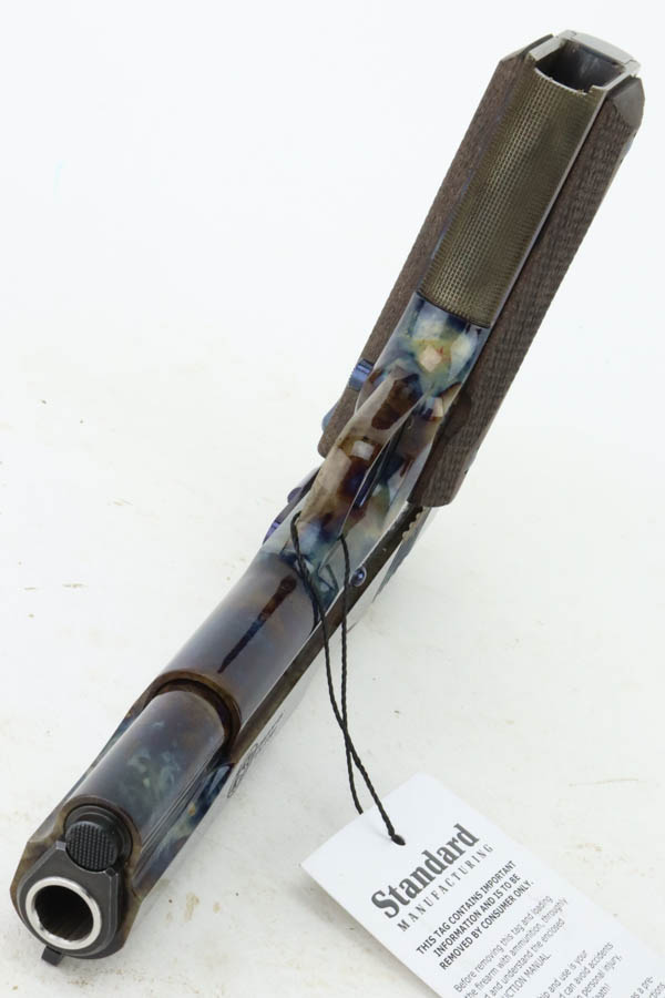 07/24/2024 – For sale is this gorgeous case colored 1911 made by Standard manufacturing. This pistol stands out from the rest as nearly every metal part has had a case colored finish applied. The trigger, hammer, slide release, plunger housing, magazine release button, and safety have an excellent fire-blued finish. The bore is mint and mirror bright. This pistol comes fresh from the Standard Manufacturing assembly line. The pistol comes with a matching box, silicone cleaning cloth, pistol locks, and a cloth cover for the pistol.
