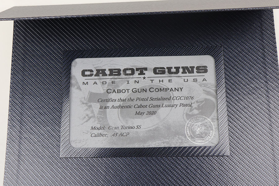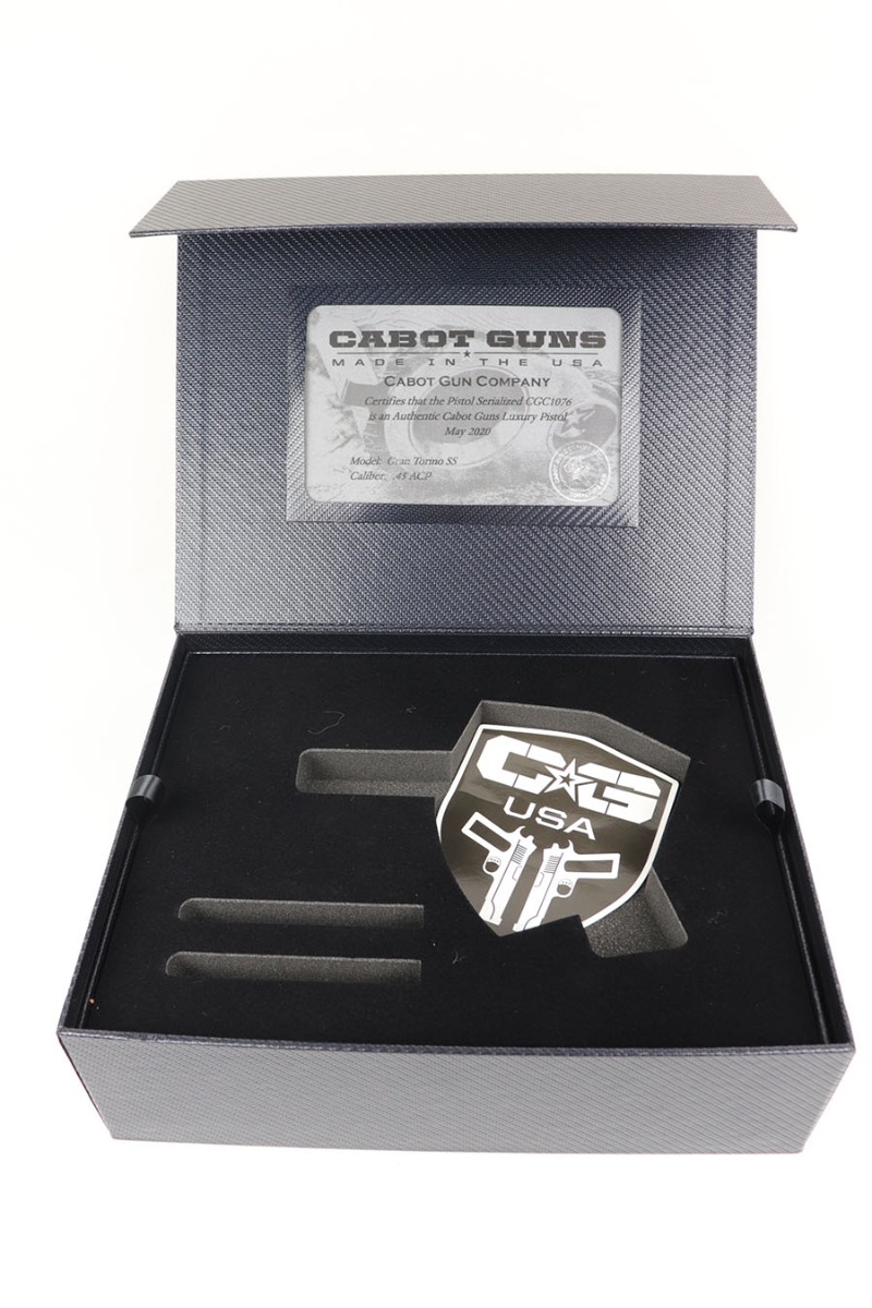 8/27/20 – This is a ‘new in box’, custom Cabot 1911 that they’ve coined the Gran Torino SS. It’s one of ONLY 7 of this model that will ever be produced. The pistol has a NM grade barrel with stainless steel frame and slide that undergoes proprietary hardening. Other features include the racing vector slide serrations, rhombus cut front strap checkering, idiot scratch proof slide stop, and carbon fiber grips. It also comes in the custom Cabot box with all the original packaging and spare magazine.