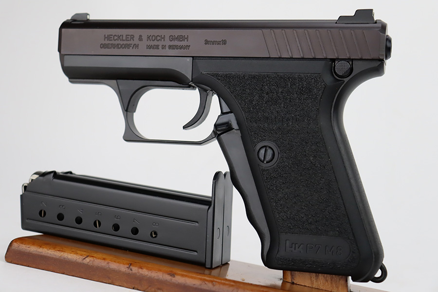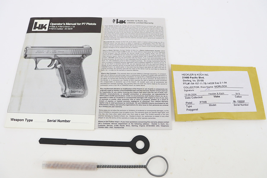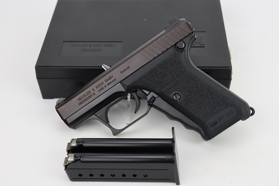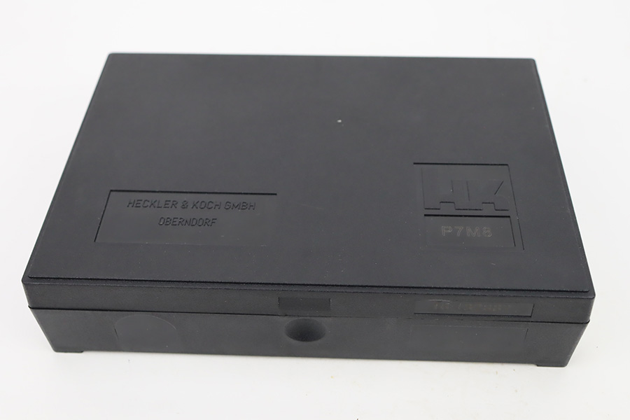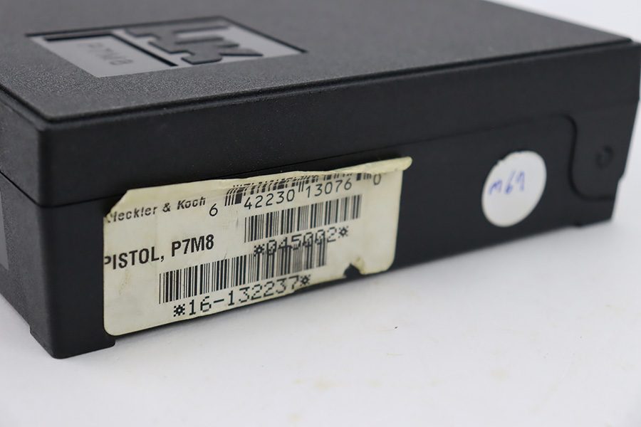 9/26/23 – This is a mint Heckler & Koch P7M8 in the original, matching box. The gun is in like-new condition with hardly any sign of use. The factory hard case is numbered and matching to the gun, and includes the original scraper, brush, warranty card, spare magazine and a 10/93 dated manual. Pistol is also date coded (AE) to 2004. FFL required. NOTE: The box has the original matching HK label on it, but the serial stamped in the plastic is off by several thousand.