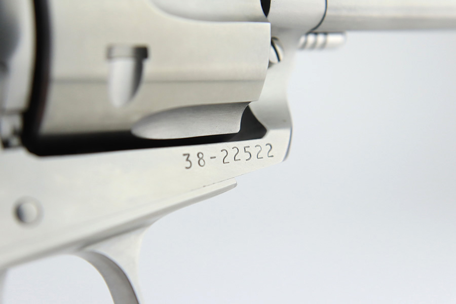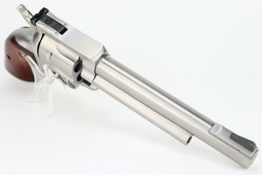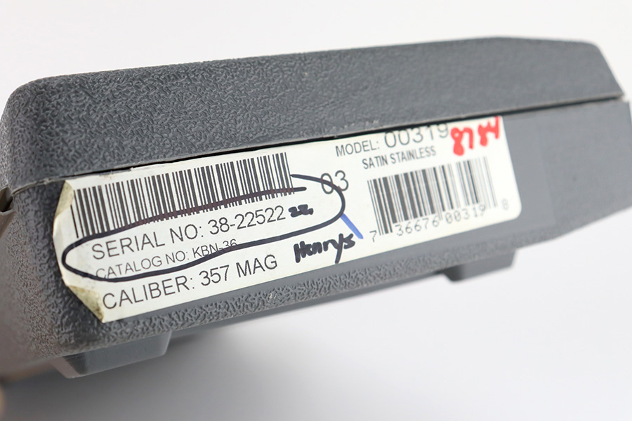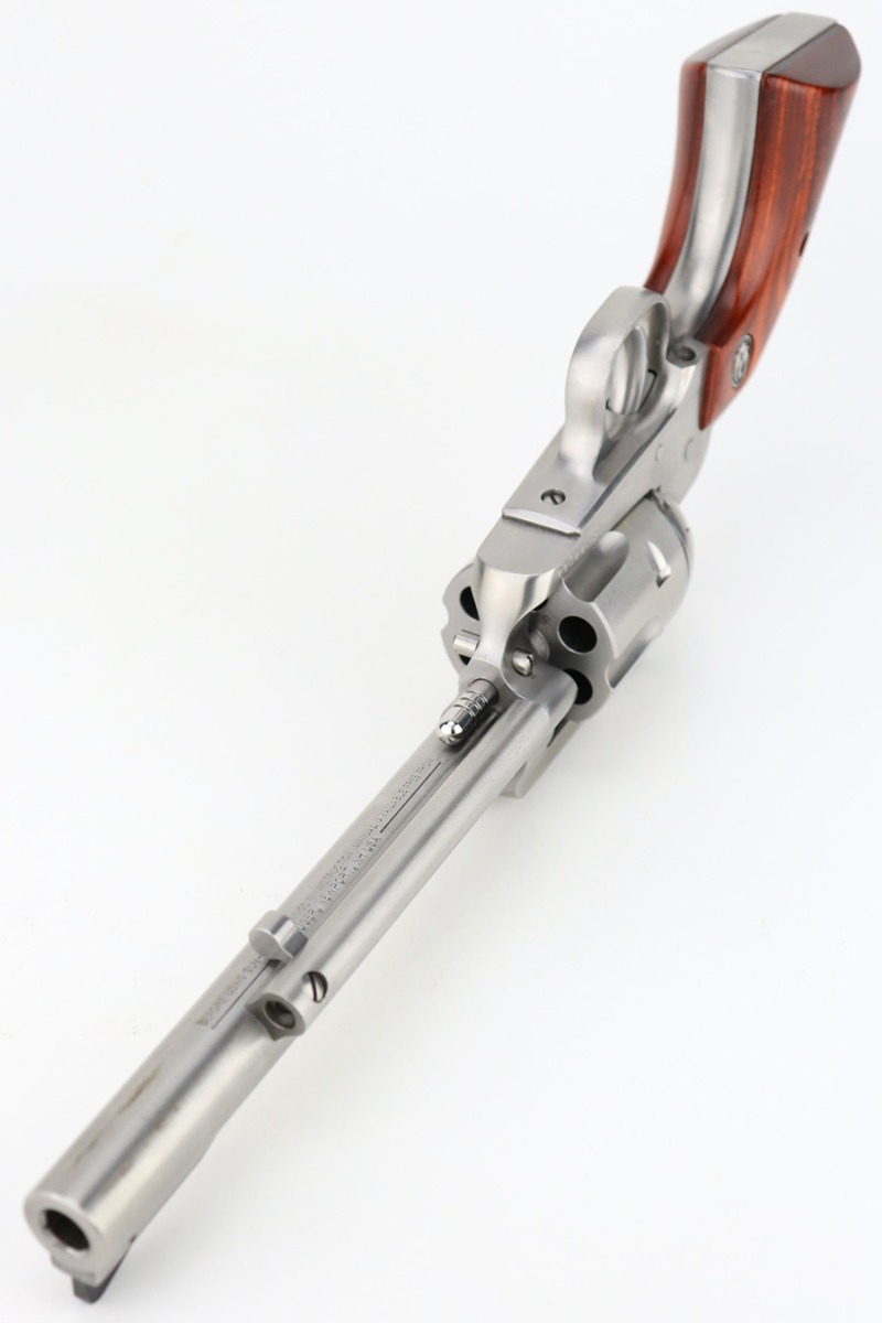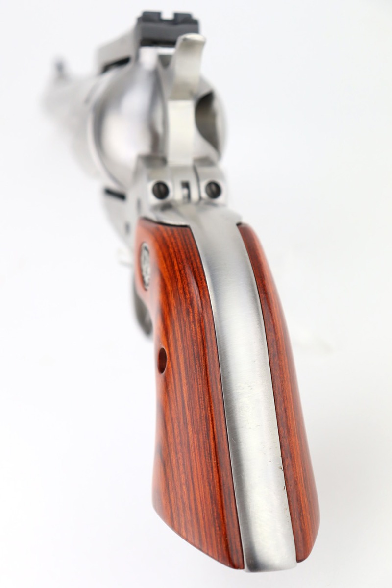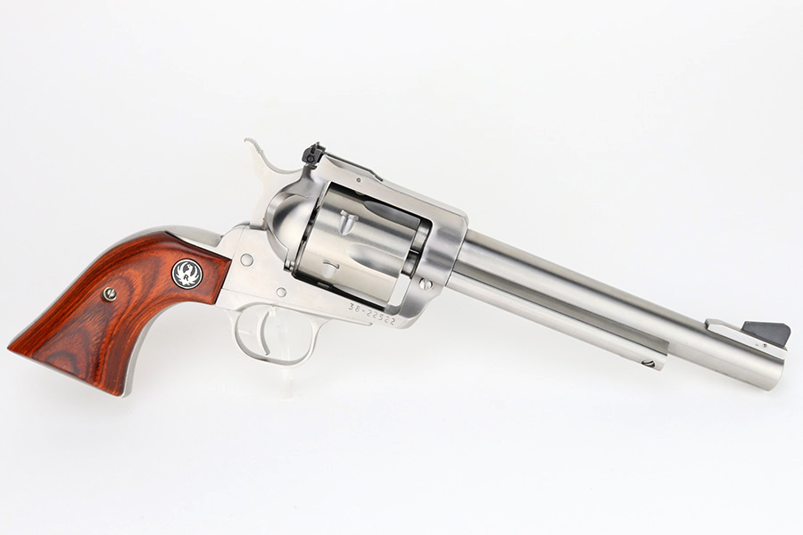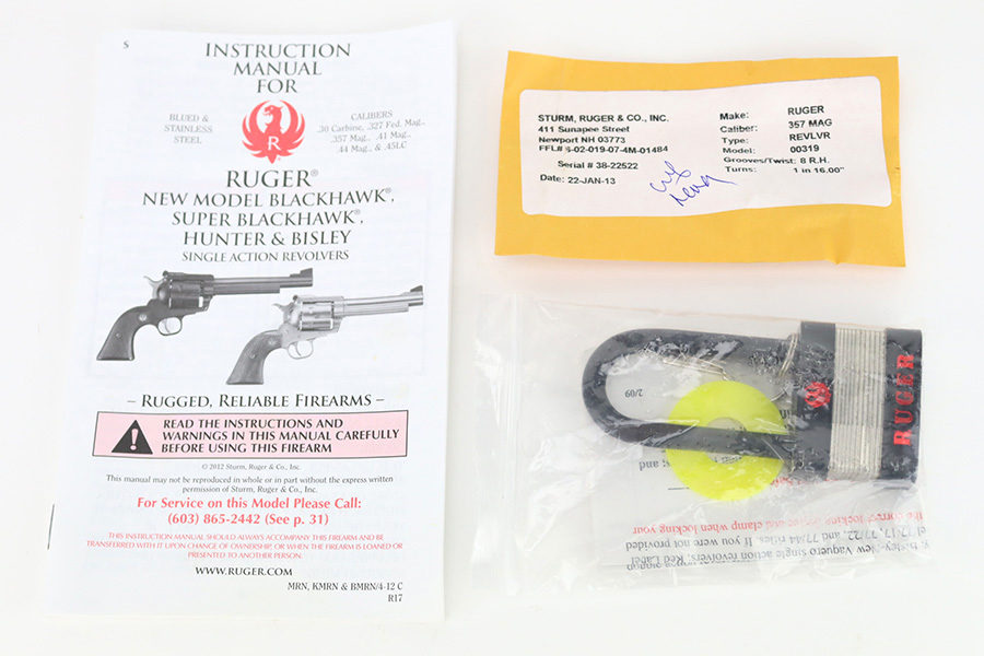 1/4/24 – This is a Ruger New Model Blackhawk Revolver, manufactured in 2013 and chambered in .357 Magnum. It has a really nice stainless finish with a 6.5″ barrel. It comes with its original matching-numbered hard case, owners manual, and gun lock. It is pristine, unfired condition with just a couple of very light scuffs on the underside of the barrel and an extremely light roll mark on the cylinder. Fitted with excellent wood grips. Mint bore.