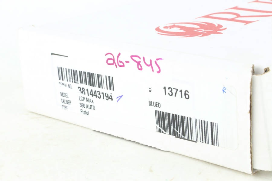 10/25/24 – This is a new-in-box Ruger LCP Max pistol, chambered in .380 ACP. Comes in its original box with all of its extras. The gun is in like-new condition with no signs of use or wear. All-black finish. Manufacturer SKU 13716.