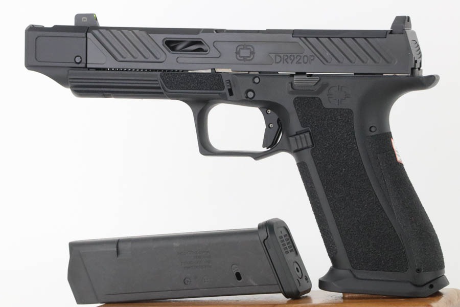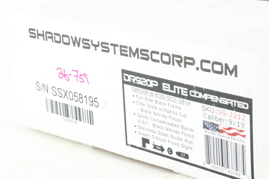 10/25/24 – This is a new-in-box Shadow Systems DR920P Elite Compensated pistol, chambered in 9mm. Comes in its original box with all of its extras. The gun is in like-new condition with no signs of use or wear. Manufacturer SKU DR920P-B-EOD-SCD-SENP. Full size black frame, elite slide with optics cut, black nitride finish, spiral compensated barrel (4.63″ black nitride finish), stainless steel guide rod, green tritium front sight.