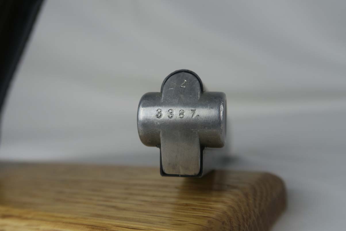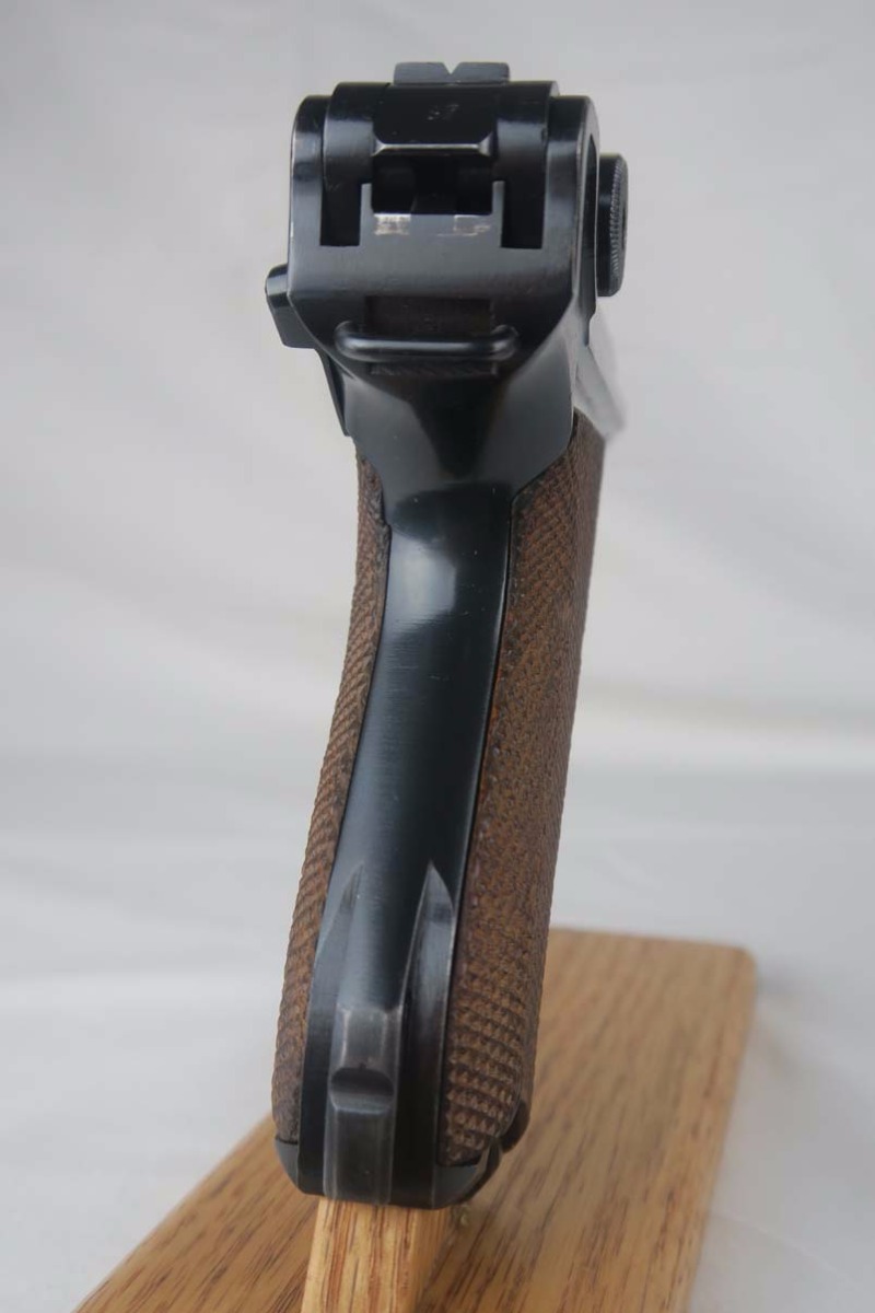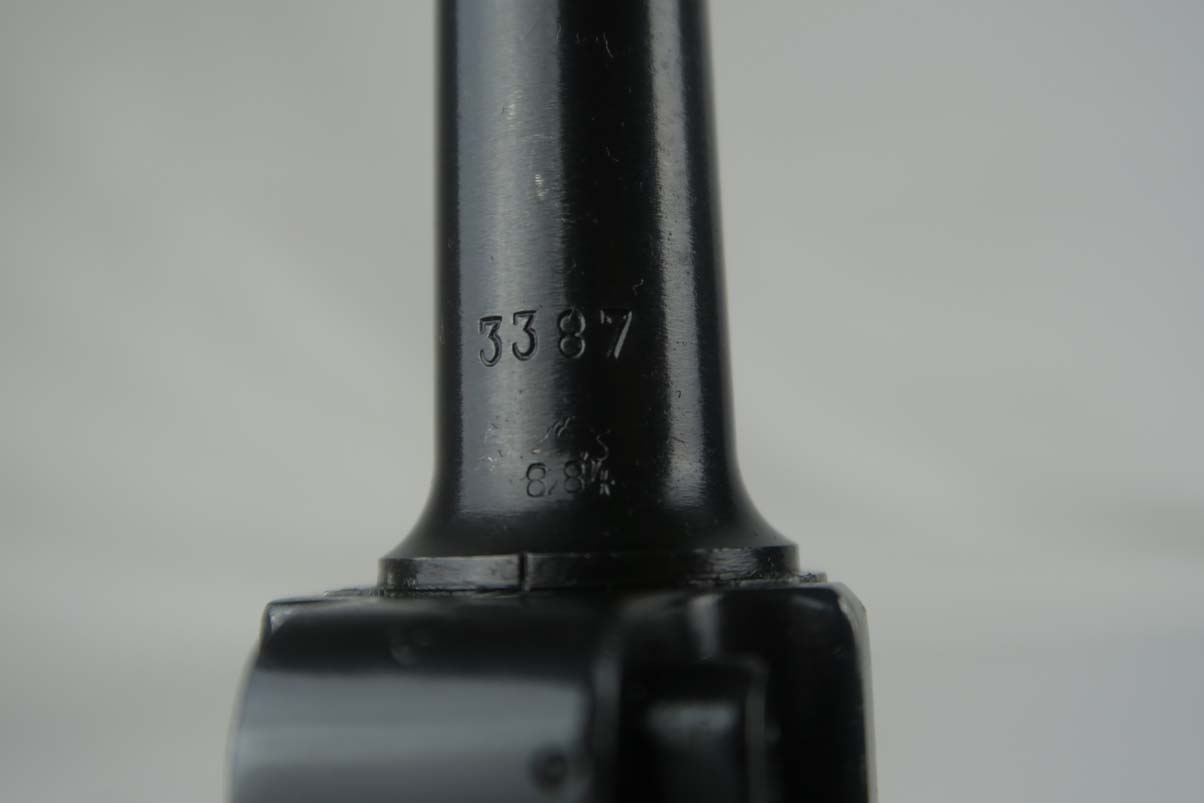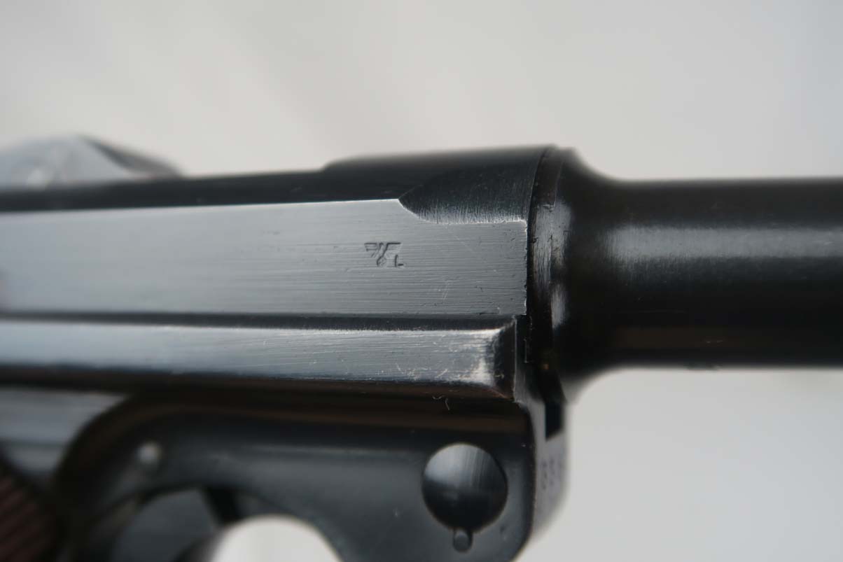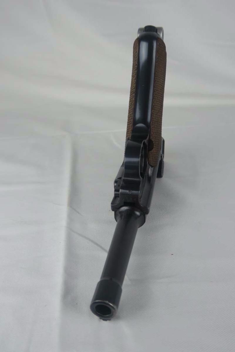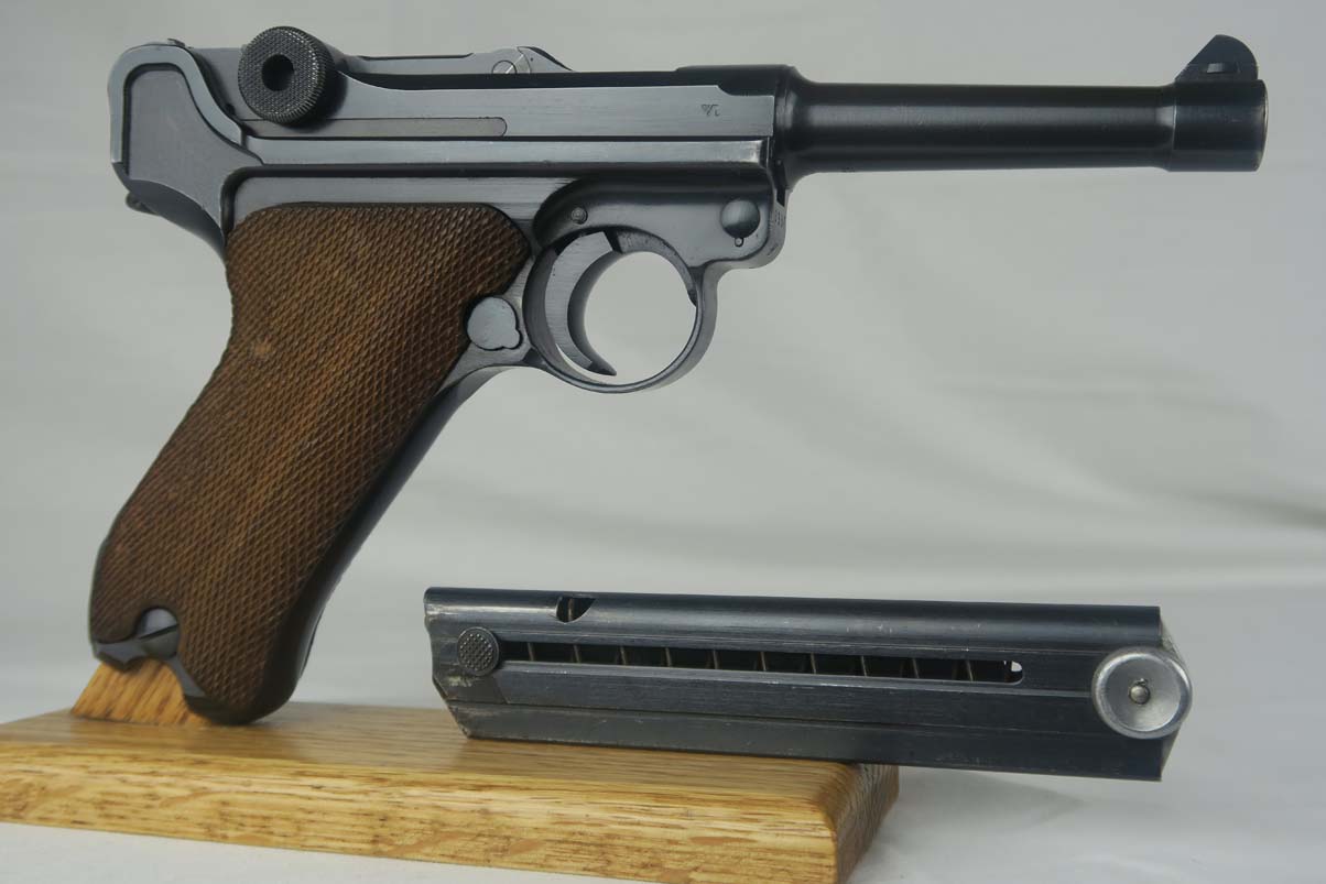 4/11/17 – This is a nice 1942 dated luger, produced by Mauser and issued to the German police.  These pistols are fairly rare, with only 4,700 produced in this year, and only about 24,000 police Mauser banner lugers produced overall.  This pistol shows about 96-97% of its original bluing, with nearly all the wear found on the left side of the pistol (muzzle, barrel, sideplate).  Police numbered magazine is matching to the gun.  Small parts are blued as they should be.  Unmarked grips.  Excellent bore.