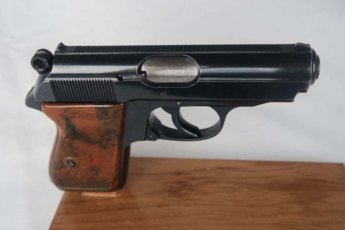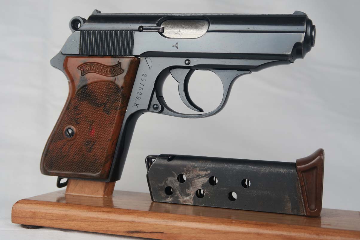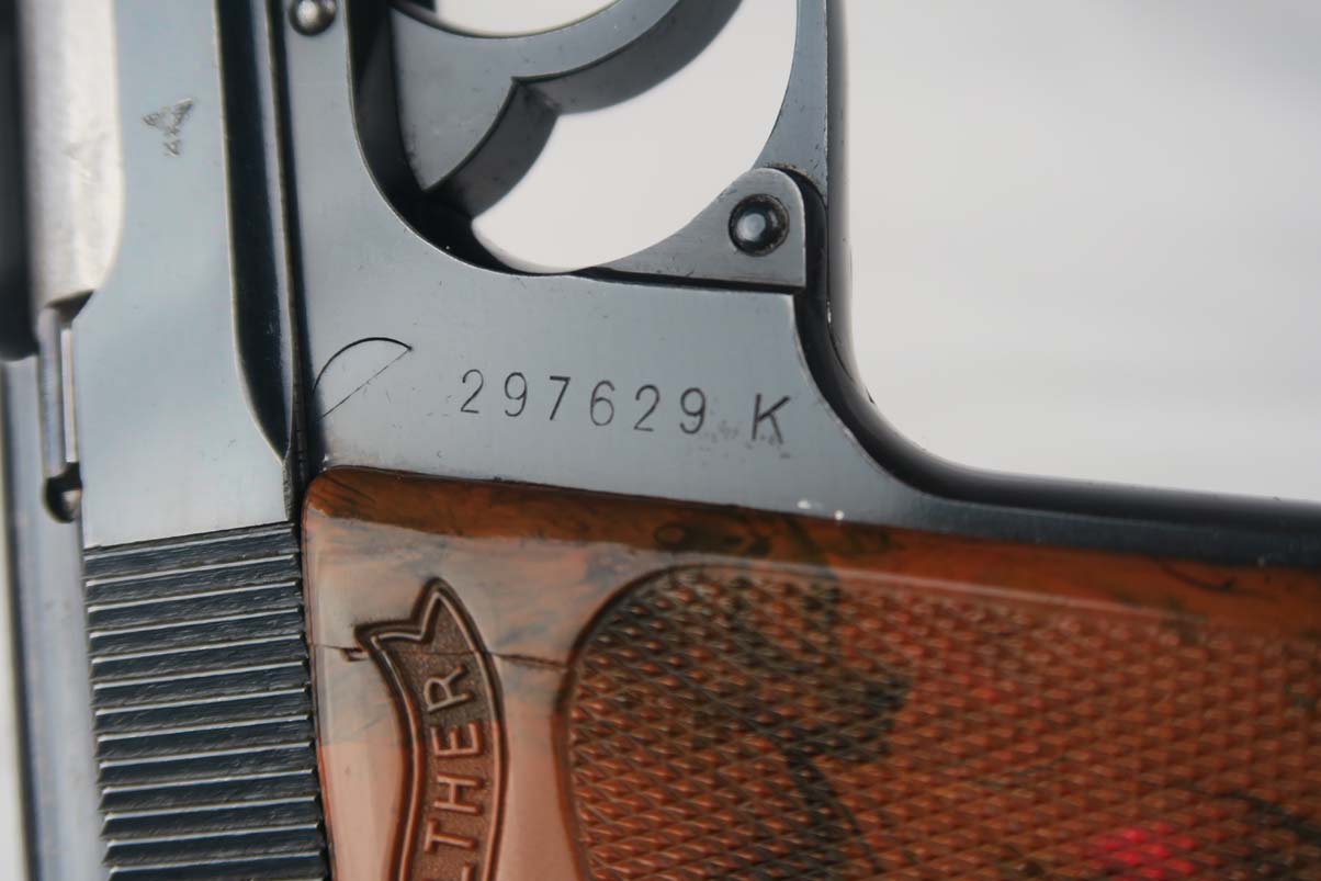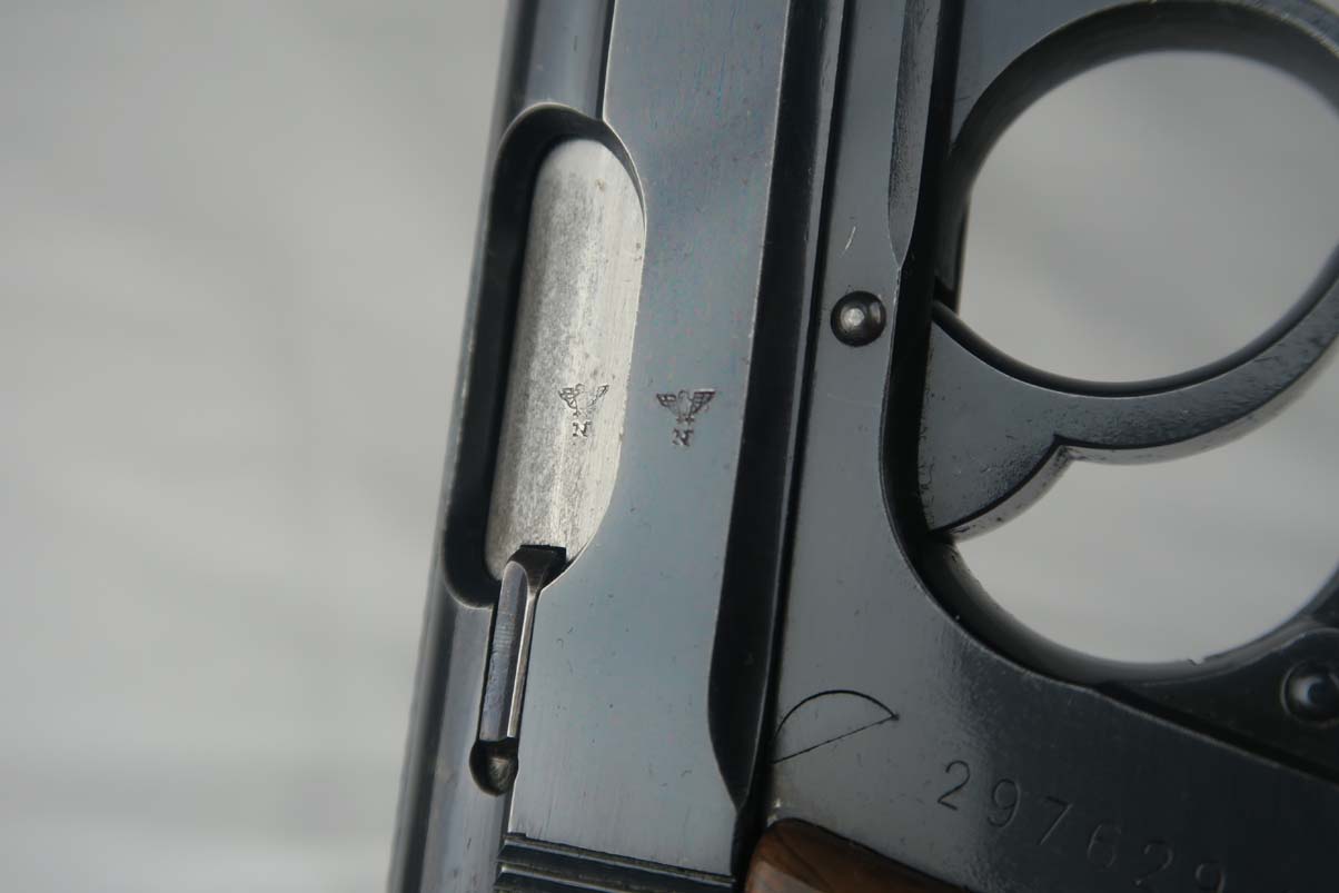 4/19/17 – This is a nice Walther PPK produced for the commercial market during WWII, with about 96% of its original bluing remaining. The wear can mainly be found on the left side of the slide near the muzzle, with other very minor spots of wear on the right side of the slide. Beautiful front strap, and nice finger extension magazine that is correct for the pistol. Manufactured around 1940 after the switch from Crown/N proofs on the slide/frame to Eagle/N proofs. Correct one-piece grip has a small crack in the right side. Perfect bore.