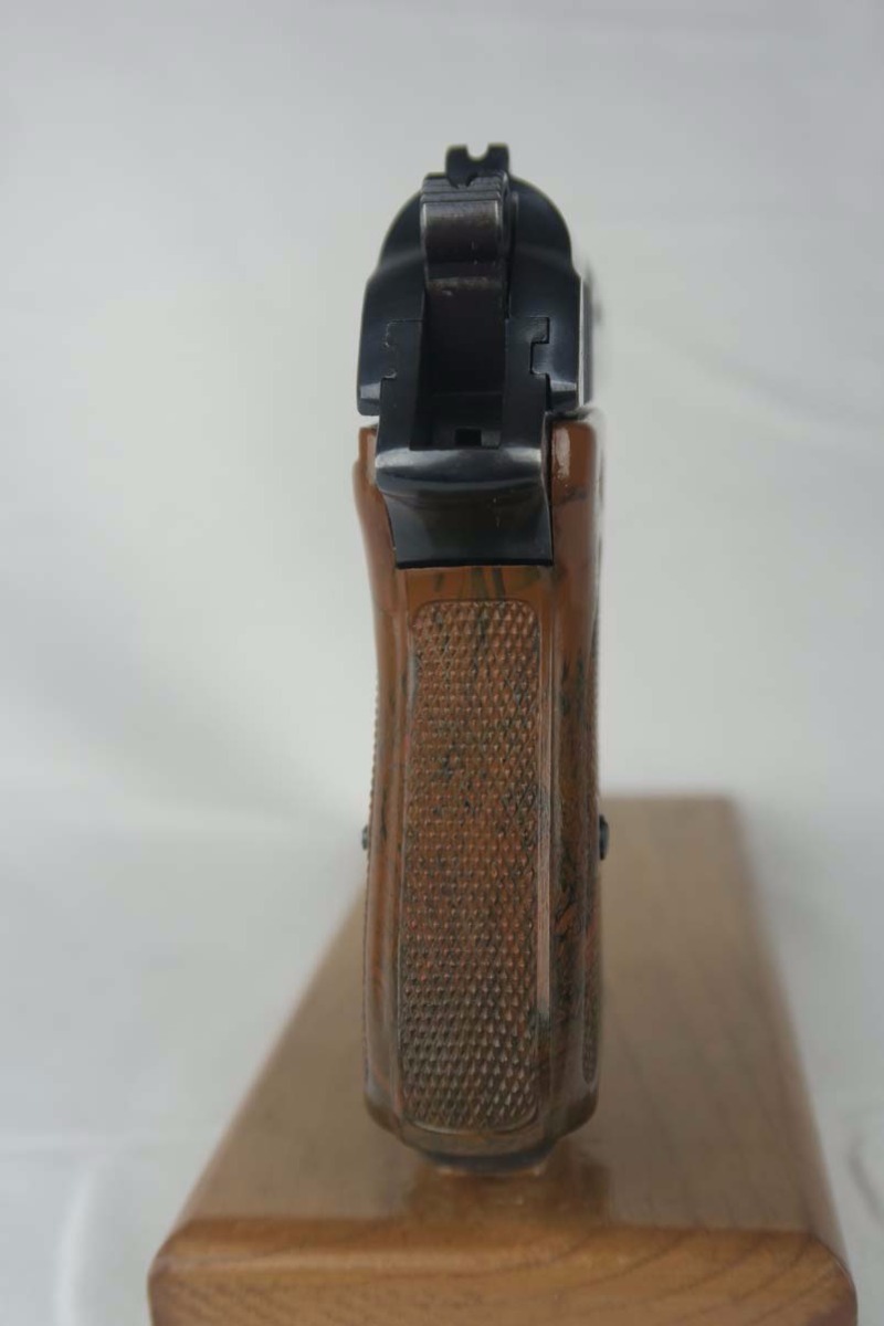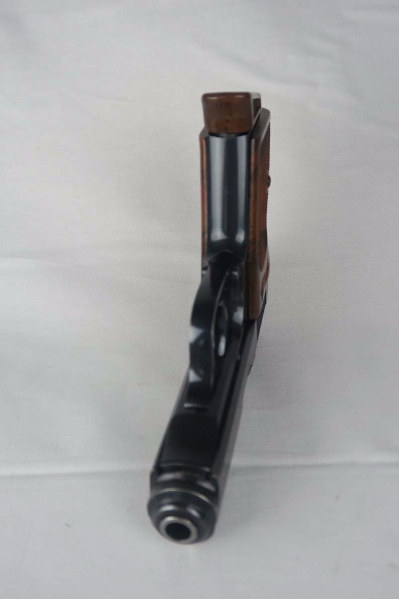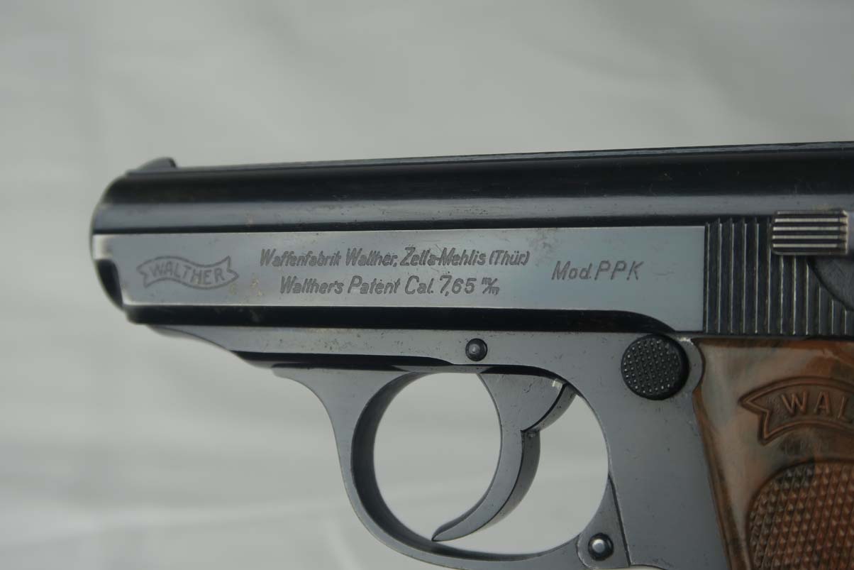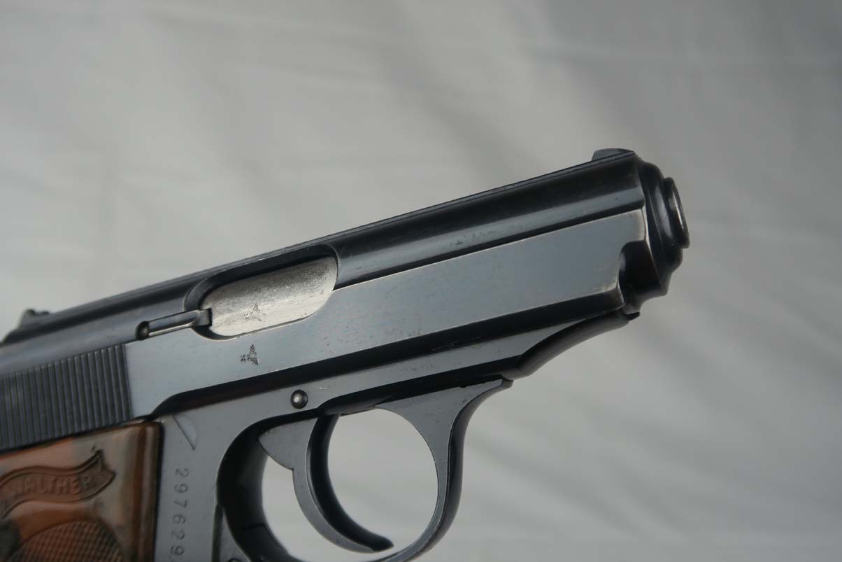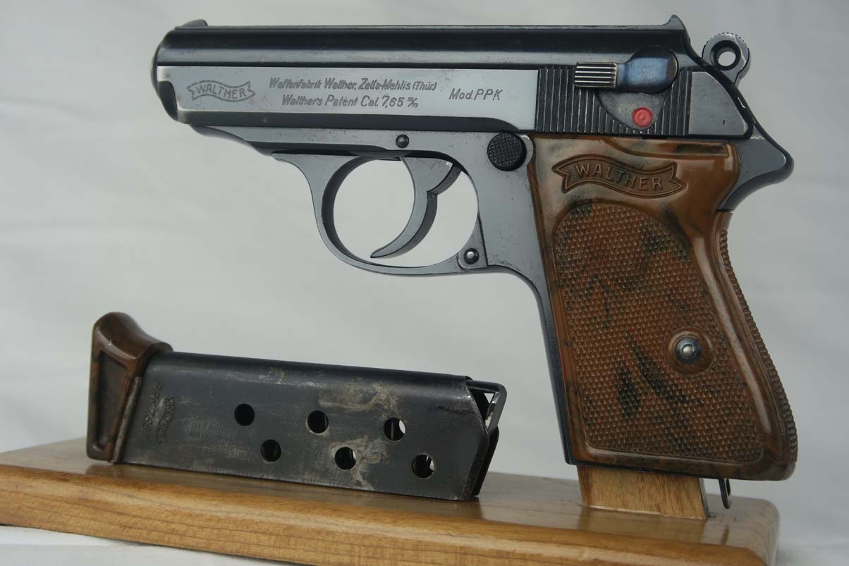 4/19/17 – This is a nice Walther PPK produced for the commercial market during WWII, with about 96% of its original bluing remaining. The wear can mainly be found on the left side of the slide near the muzzle, with other very minor spots of wear on the right side of the slide. Beautiful front strap, and nice finger extension magazine that is correct for the pistol. Manufactured around 1940 after the switch from Crown/N proofs on the slide/frame to Eagle/N proofs. Correct one-piece grip has a small crack in the right side. Perfect bore.