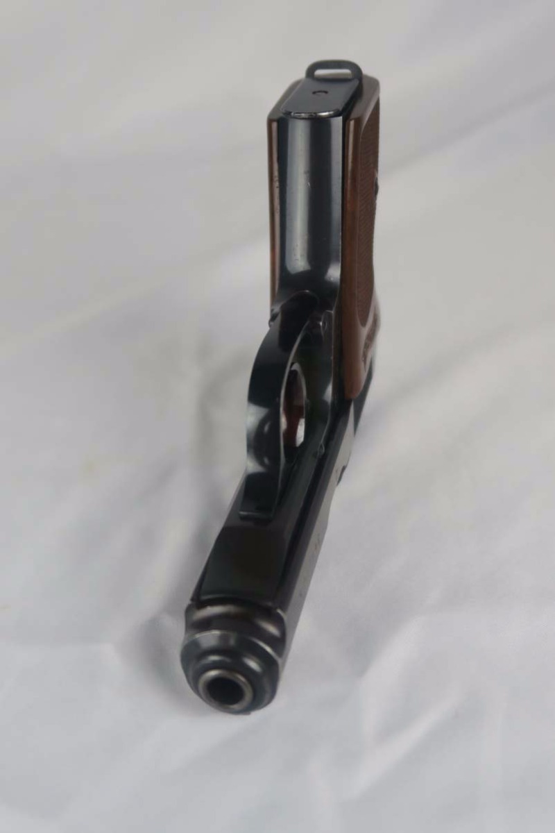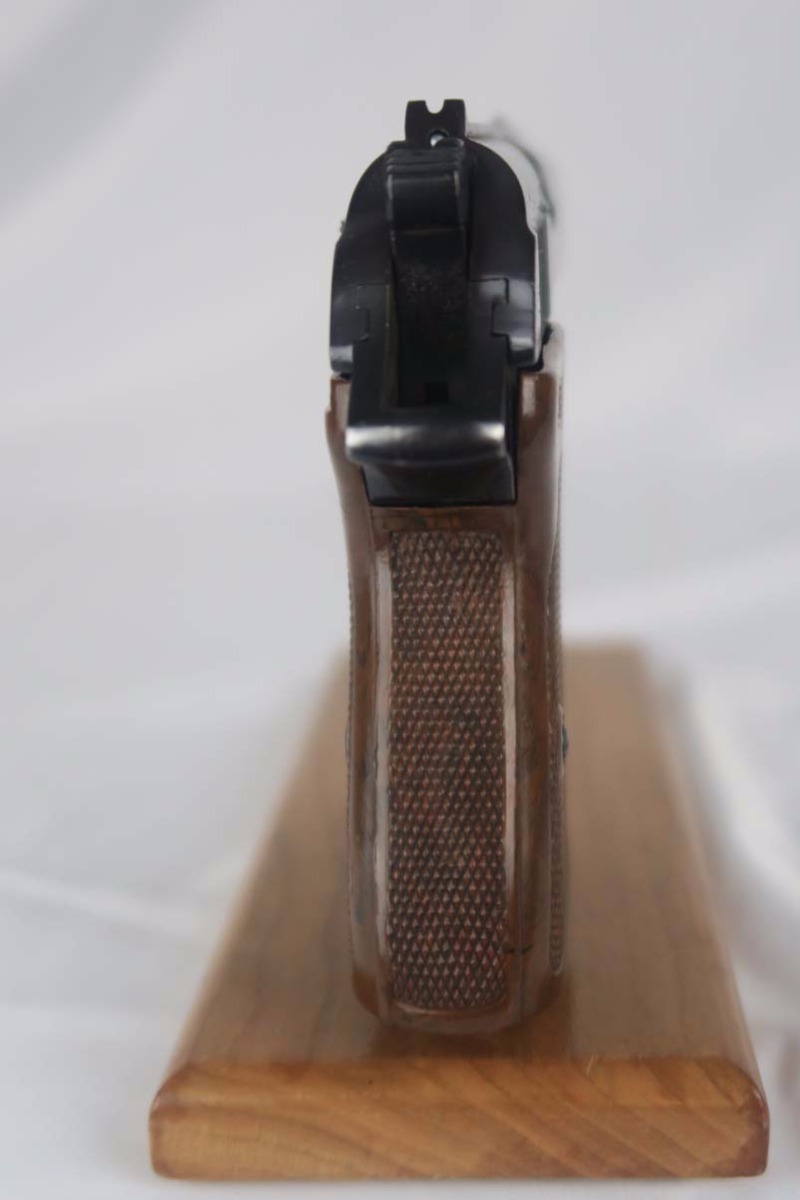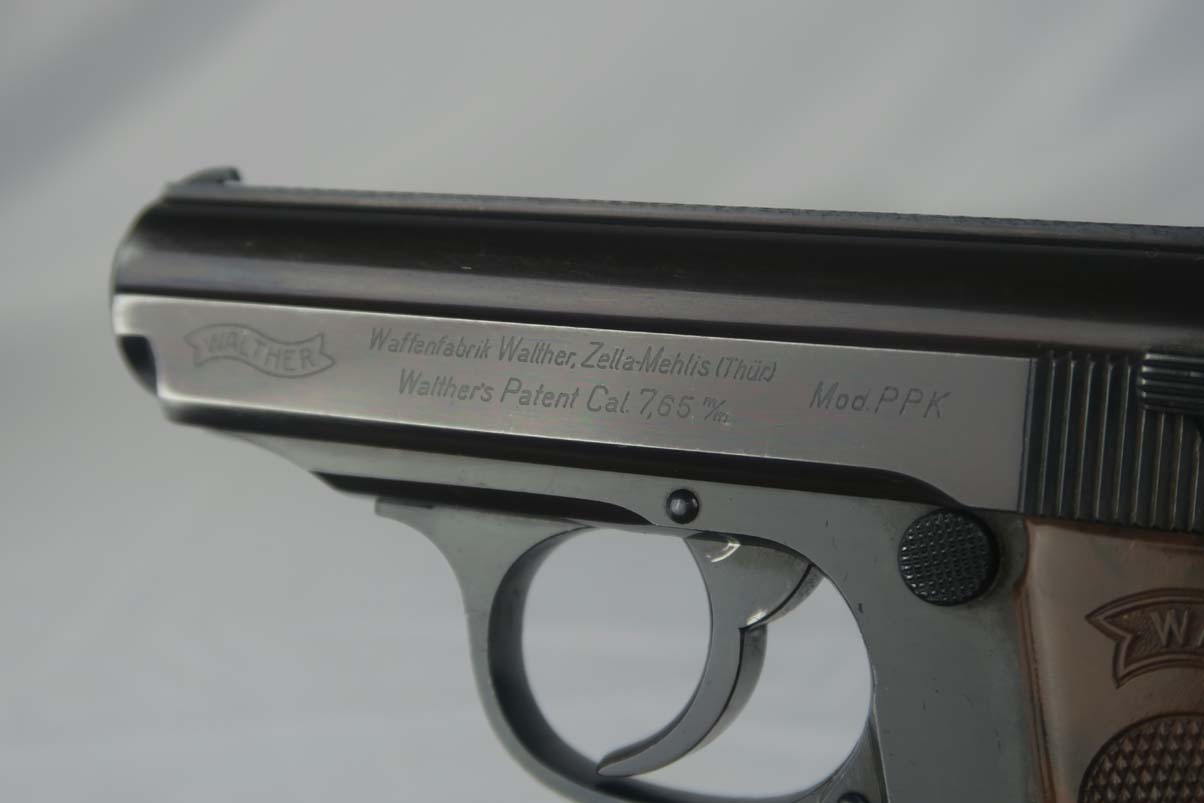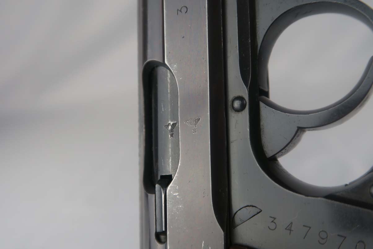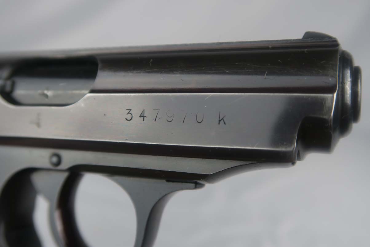 5/9/17- This is a very nice Walther PPK produced for the commercial market during WWII. The serial dates the pistol to around 1941, after the switch to Eagle/N proofs. It has proper later features that include the 60 degree safety. The finish rates at about 97%, with muzzle wear on both sides of the slide. Excellent chocolate-colored grip has no major cracks or chips. Early banner magazine is odd in that it was improperly stamped as 9mm and then restamped. Near-mint bore.