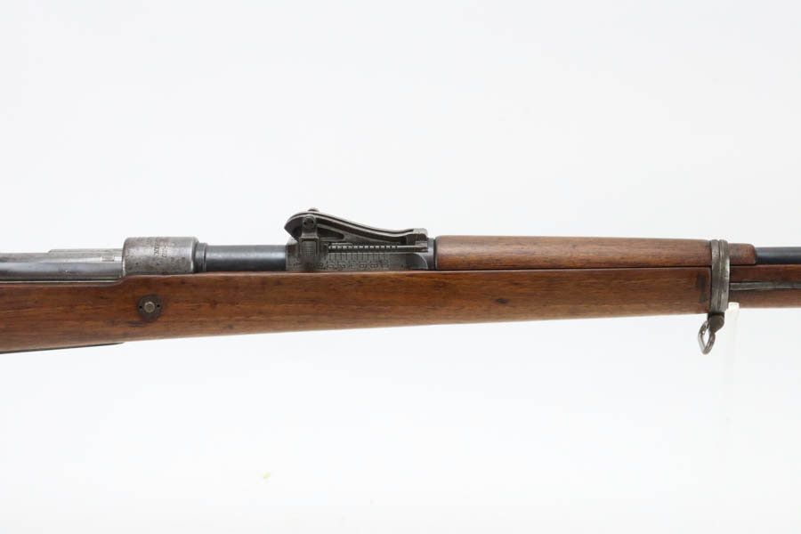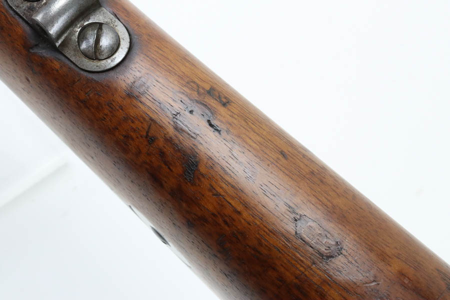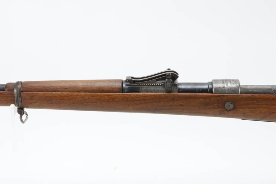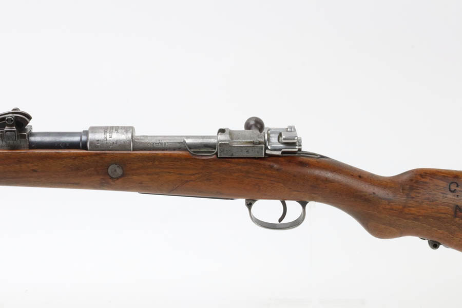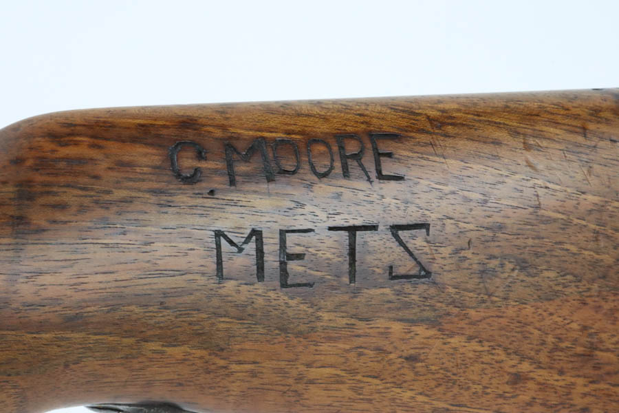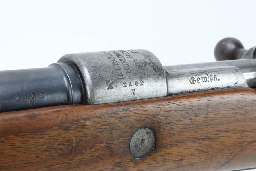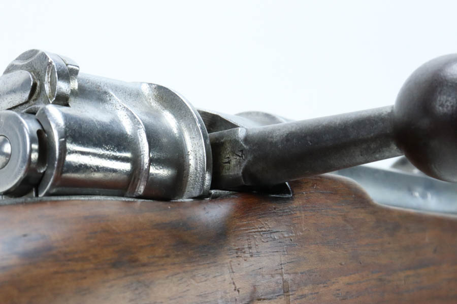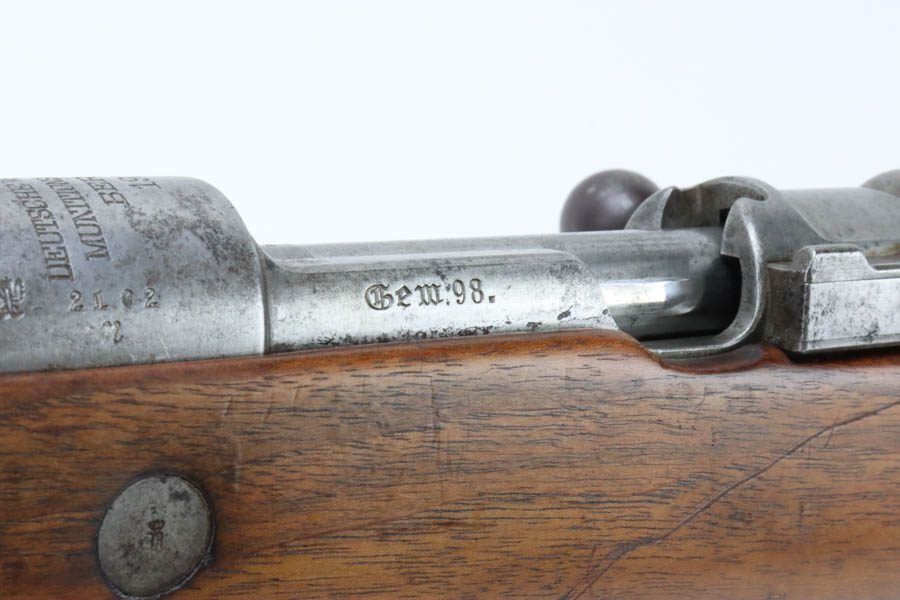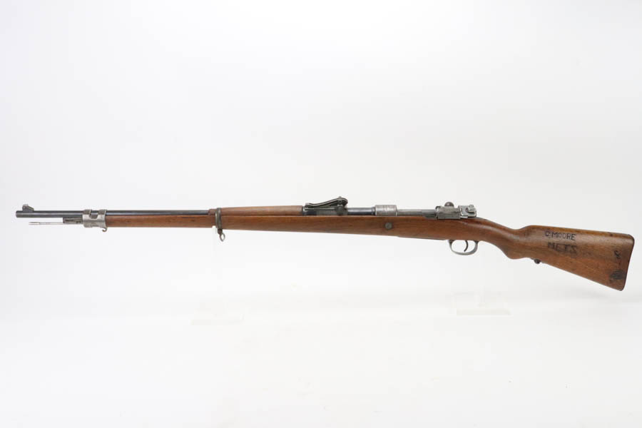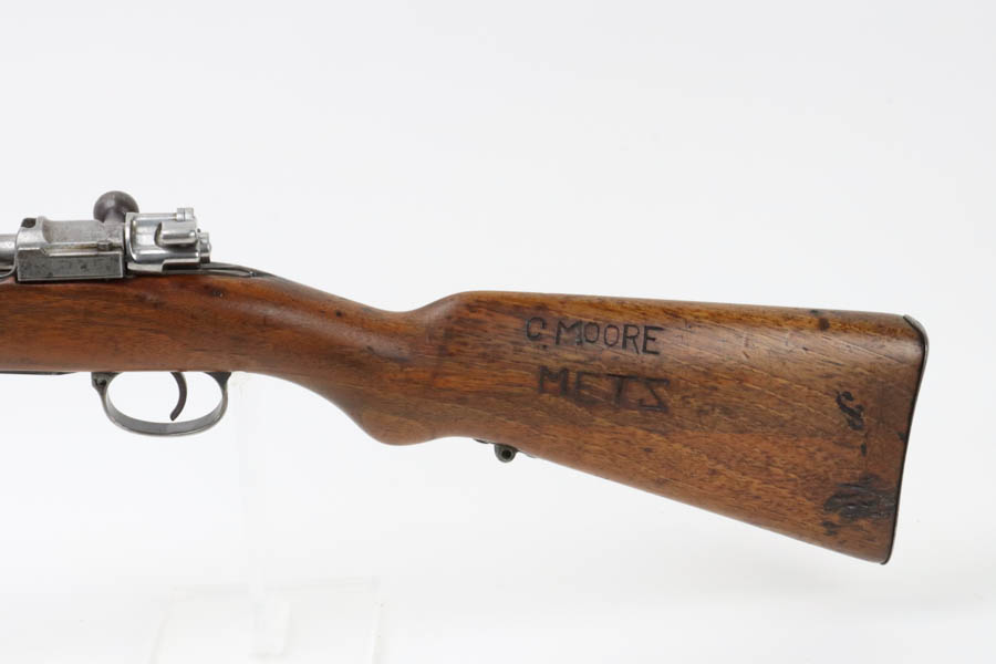 06/07/2024 – For sale is a Gewehr 98 Mauser made by DWM in 1915. This rifle is in an overall 90% condition. The receiver and bolt have some freckling and patina. The barrel still retains a nice bluing. The rifle is nearly matching throughout down to the action screws but the cocking piece is unnumbered and the cleaning rod is mismatched. The stock has been sanded and “C. Moore METS” was etched into the left side. The bore is fairly bright with great rifling but it has been counter-bored for about 1.5 inches from the muzzle.