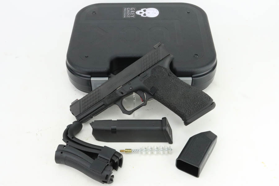 06/27/2024 – For sale is a Grey Ghost Precision custom Glock 17. The pistol has a custom stippling to the frame and slide, and the barrel, recoil buffer, trigger, and slide are made by Grey Ghost Precision. The bore is mirror bright with great rifling. The only spot of wear is on top of the chamber where the slide rubs against it while reciprocating. The pistol comes with a Glock case with Grey Ghost’s sticker and the typical Glock accessories. There is only one 17 round magazine.
