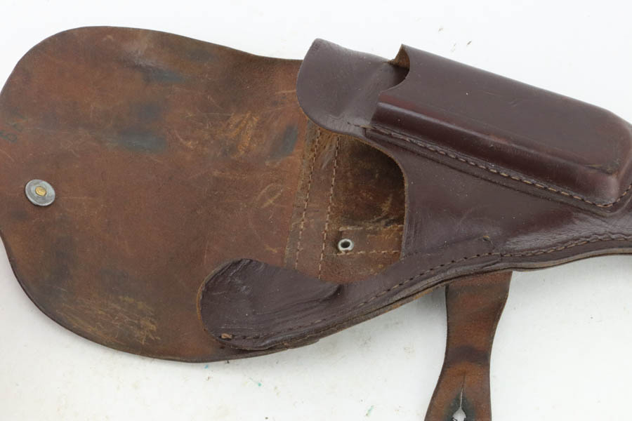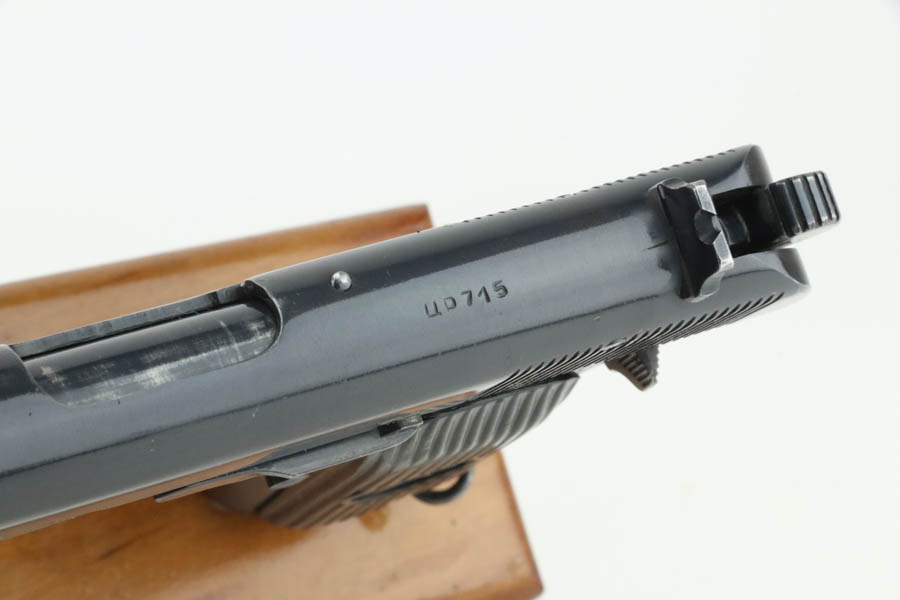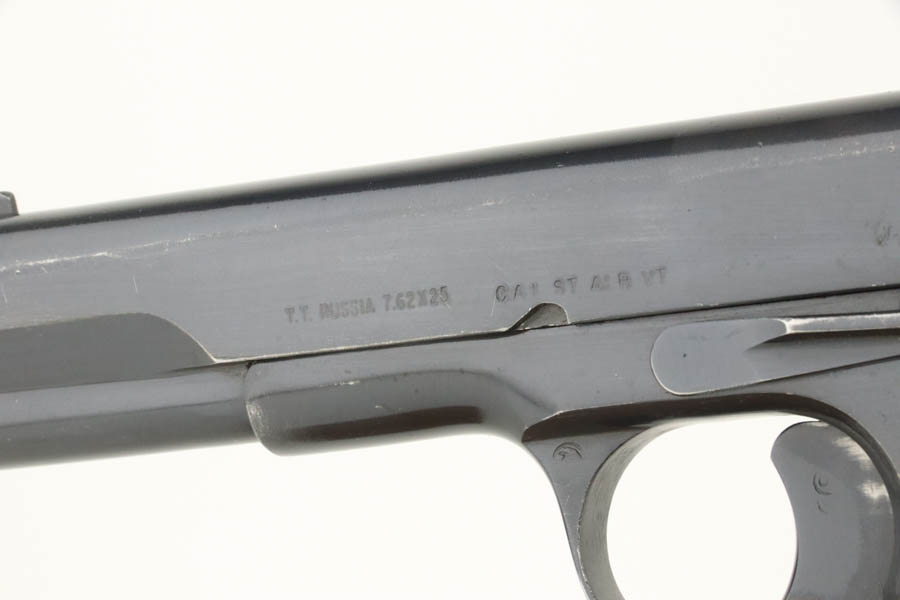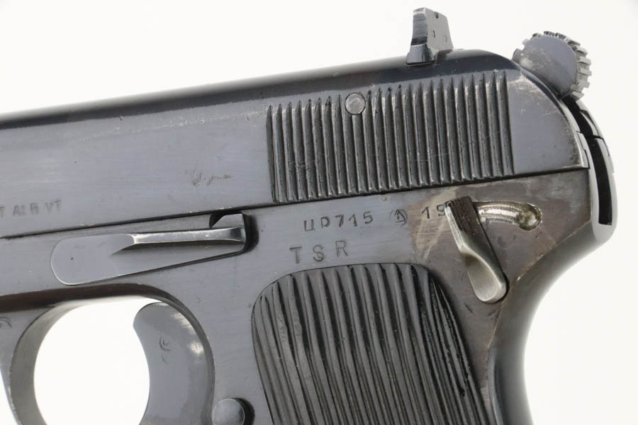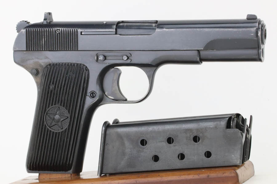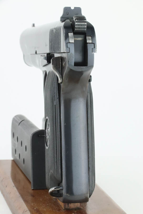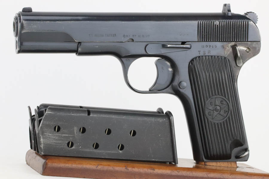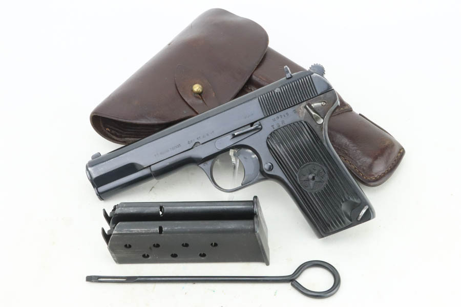 09/13/2024 – For sale is a TT-33 Tokarev made at the Izhevsk Arsenal during WW2. The pistol is in great condition with a nice blued finish throughout but looks to be an old refinish. There are spots of finish loss on the slide, mainly towards the muzzle, and few spots around the back of the frame where the safety was added on. The bore is bright on the lands but there are pitting visible within the grooves. There is an import mark on the side of the frame. The onemagazine is post war and unmarked and the other is mismatched. The holster is in good condition and comes with a cleaning rod.