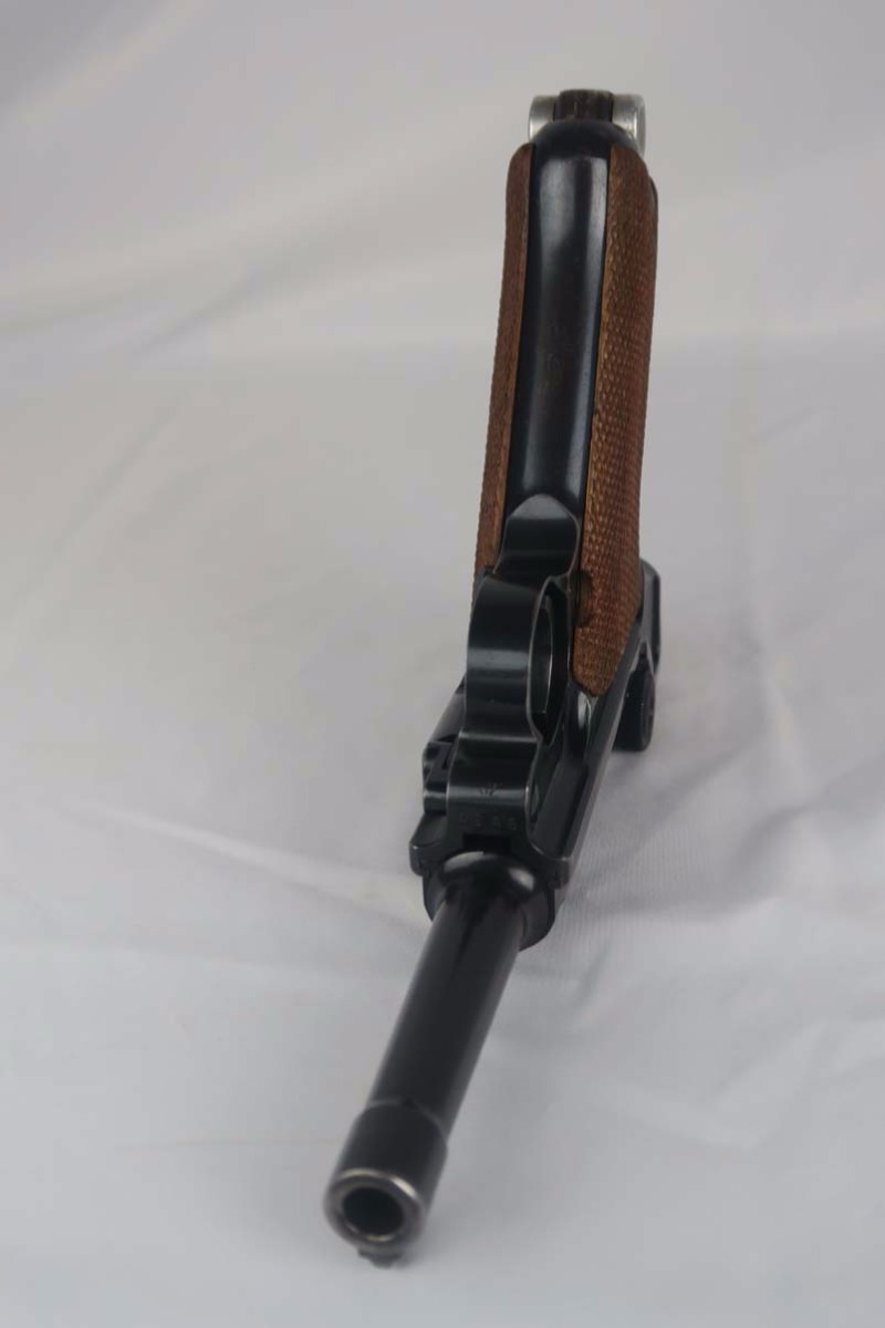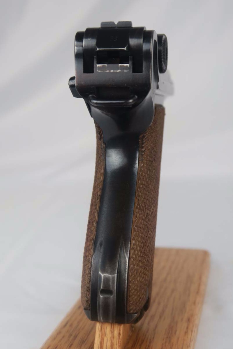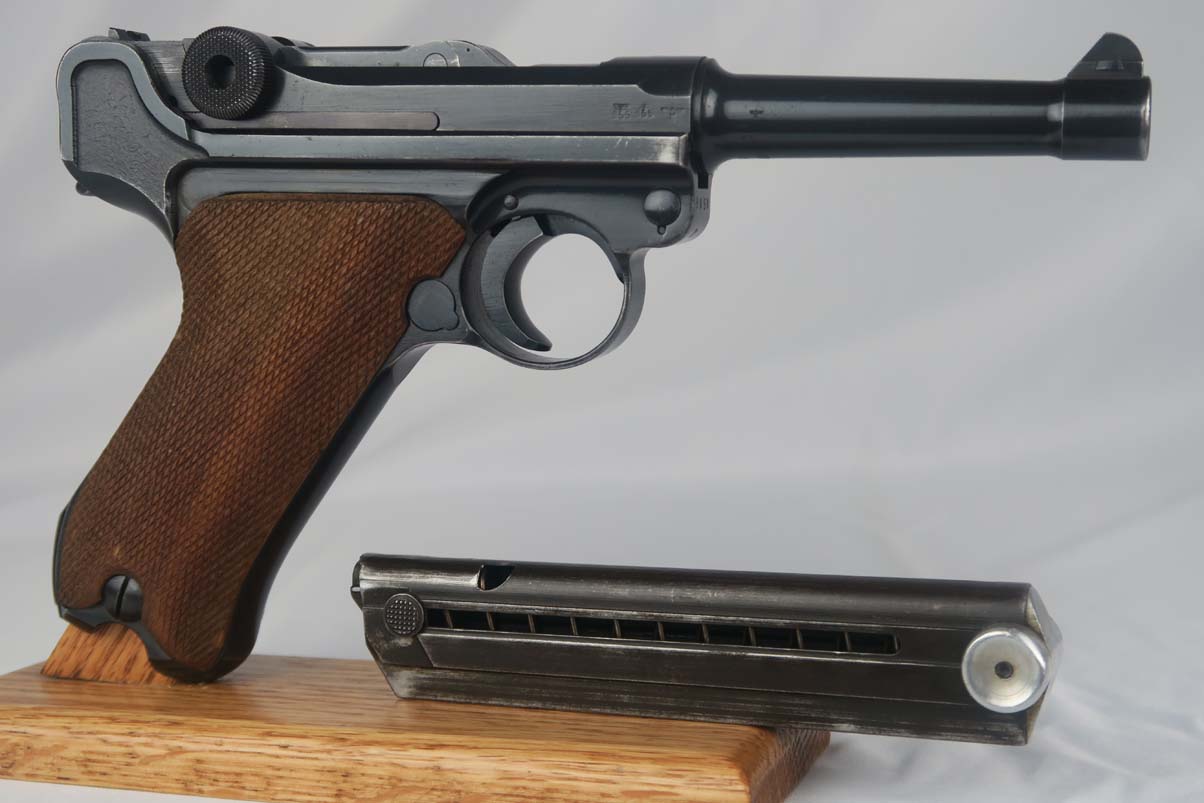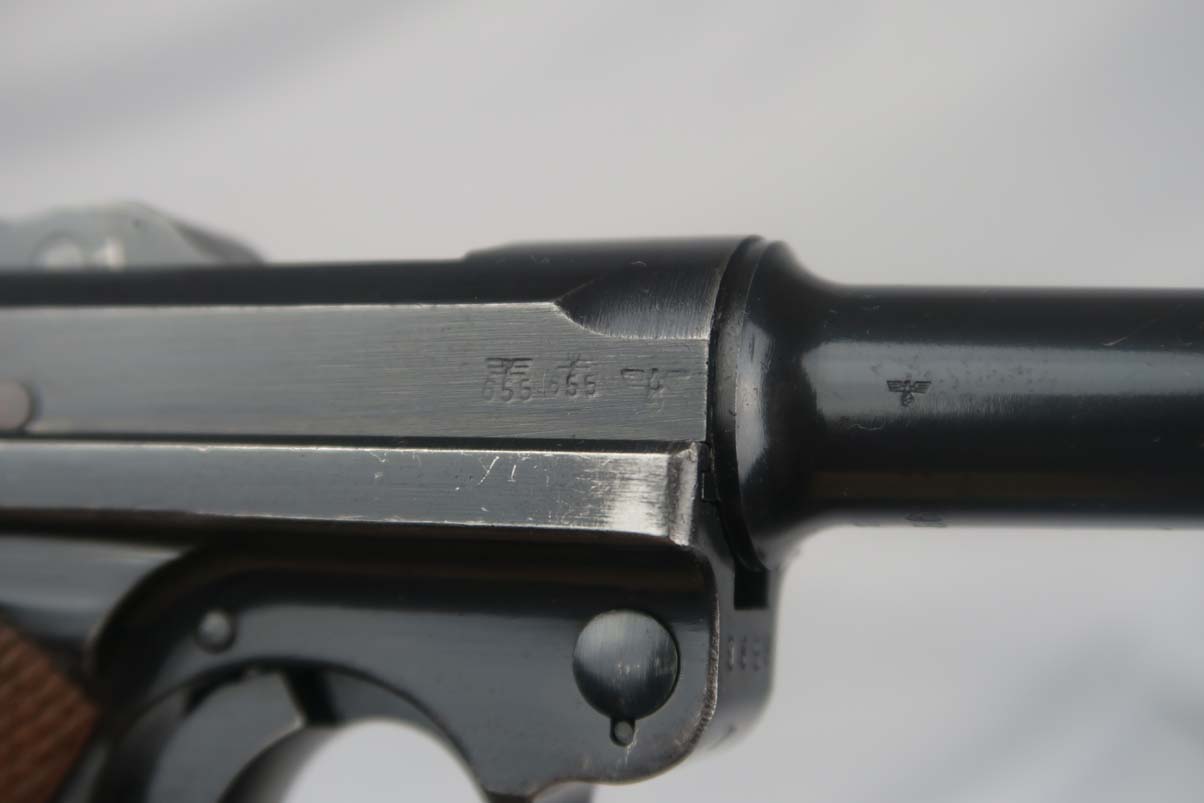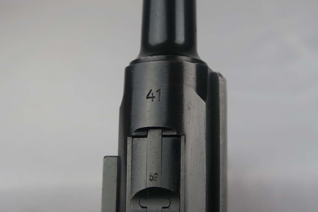 5/5/17 – This is a 1941 Mauser luger from World War II. It has all matching parts, including the grips. The original finish is about 95-96% with wear on the muzzle and sideplate, and a very nice front strap. It has a rare fxo E/77 magazine with blank bottom, and the grips are numbered to the pistol. Bore is in good condition with no major flaws.