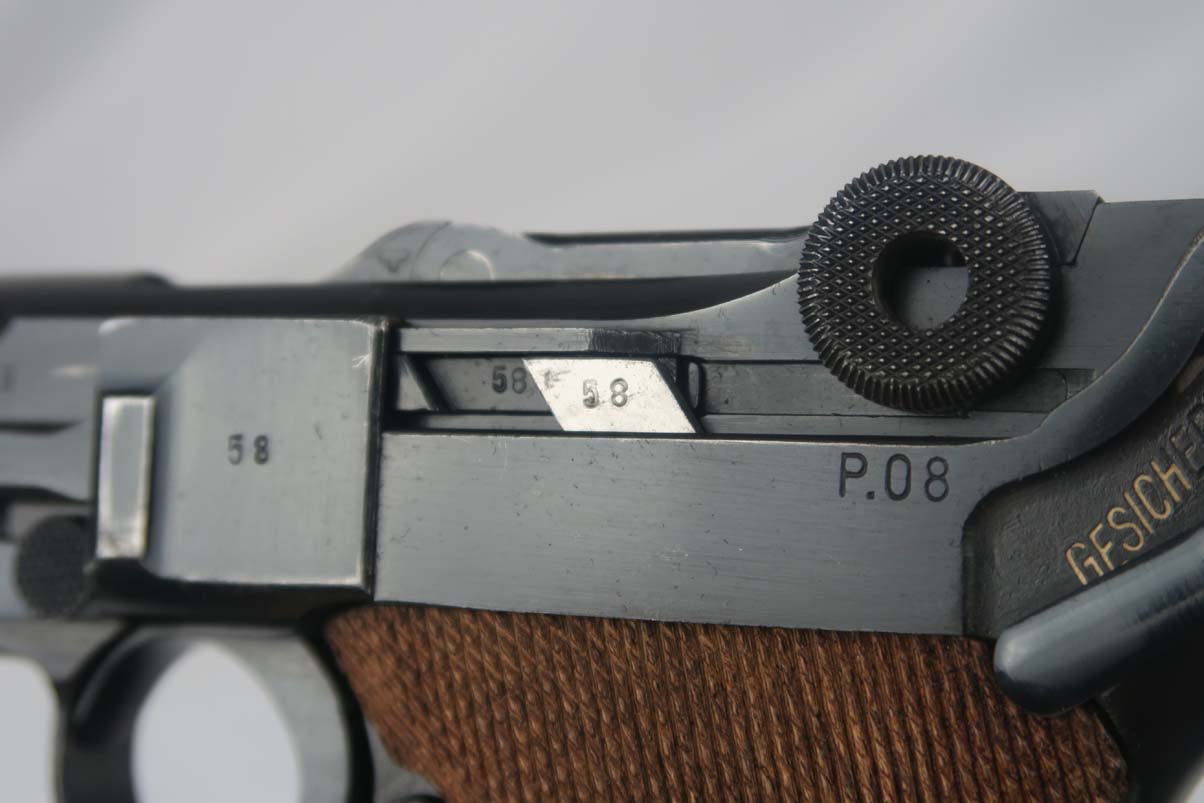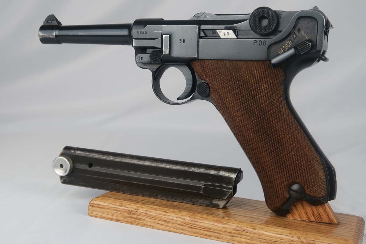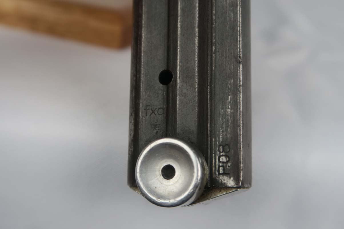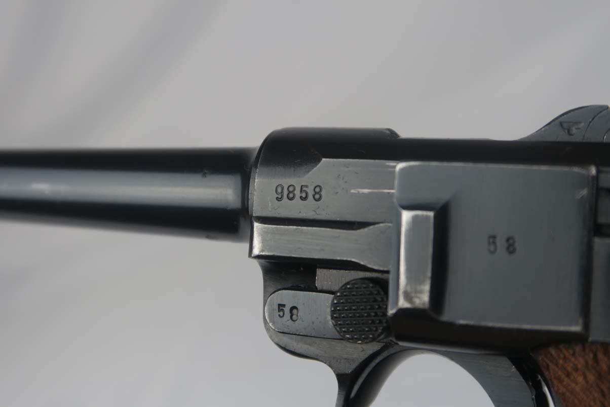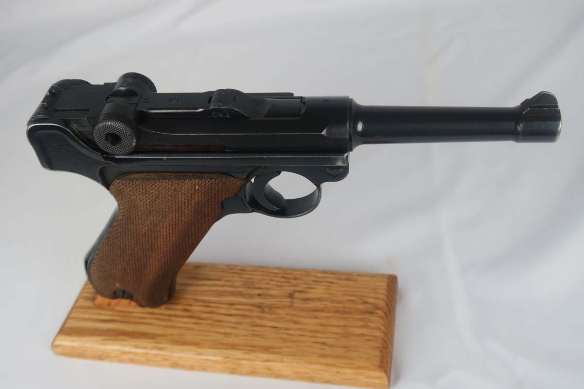5/5/17 – This is a 1941 Mauser luger from World War II. It has all matching parts, including the grips. The original finish is about 95-96% with wear on the muzzle and sideplate, and a very nice front strap. It has a rare fxo E/77 magazine with blank bottom, and the grips are numbered to the pistol. Bore is in good condition with no major flaws.