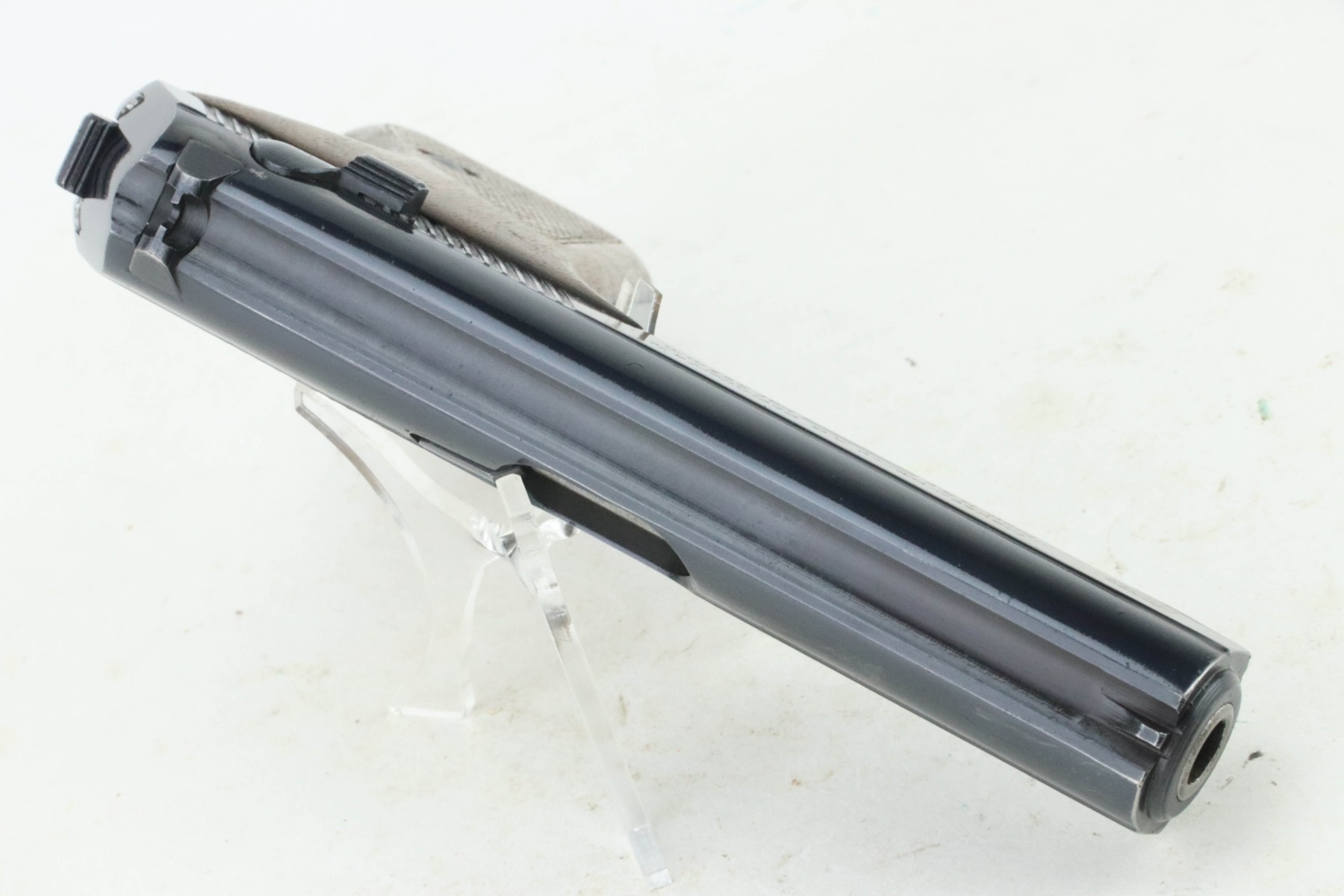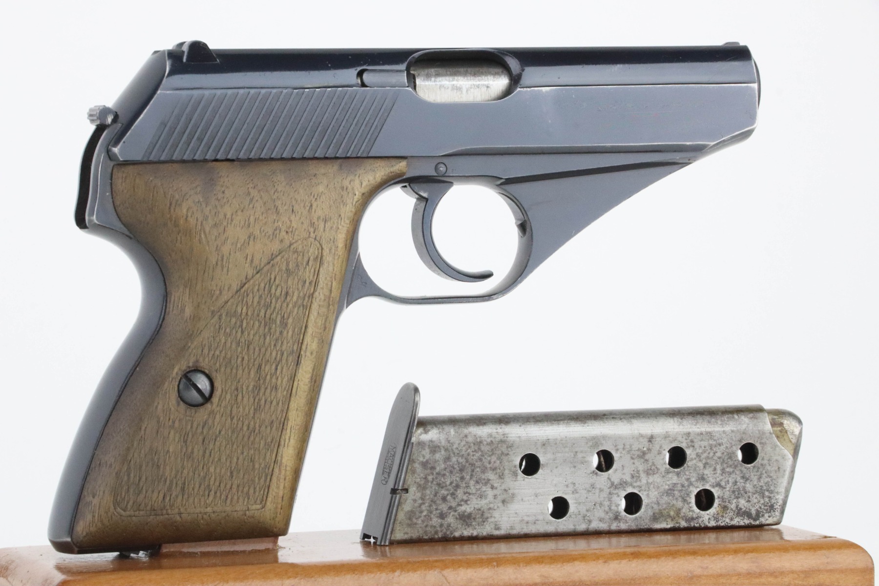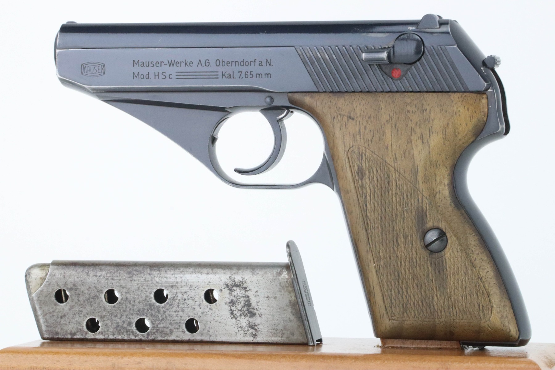 09/09/2024 – For sale is a Mauser HSc pistol made in 1943. The pistol is in great condition with a nice military blued finish with minor edge wear visible throughout the slide. There is some wear to the front and back of the grip as well. The bore is very bright with great rifling. The pistol has matching numbers on the frame, slide, and barrel. The grips are in great condition with no cracks or breaks. The pistol comes with a holster that has some wear around the edges. The inside has 75635 written and what looks like a name.