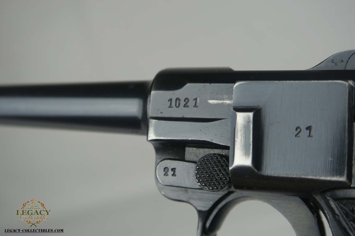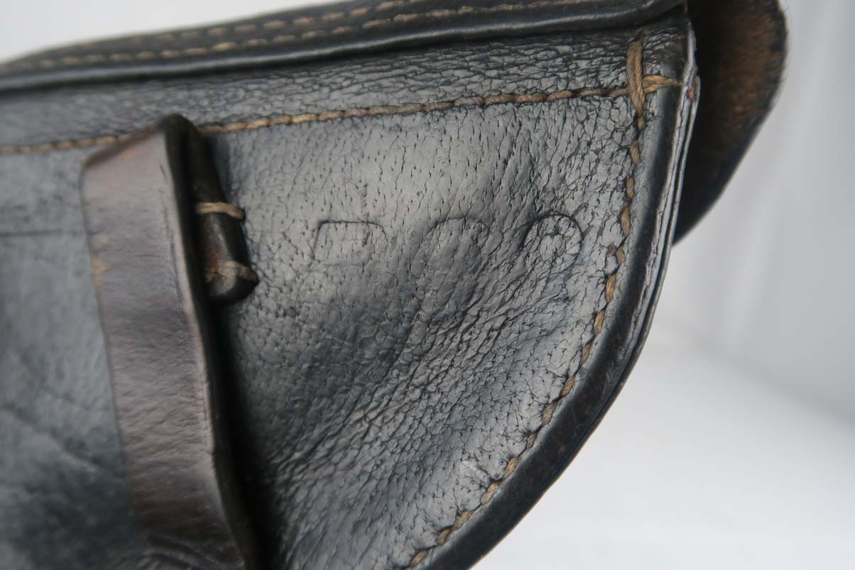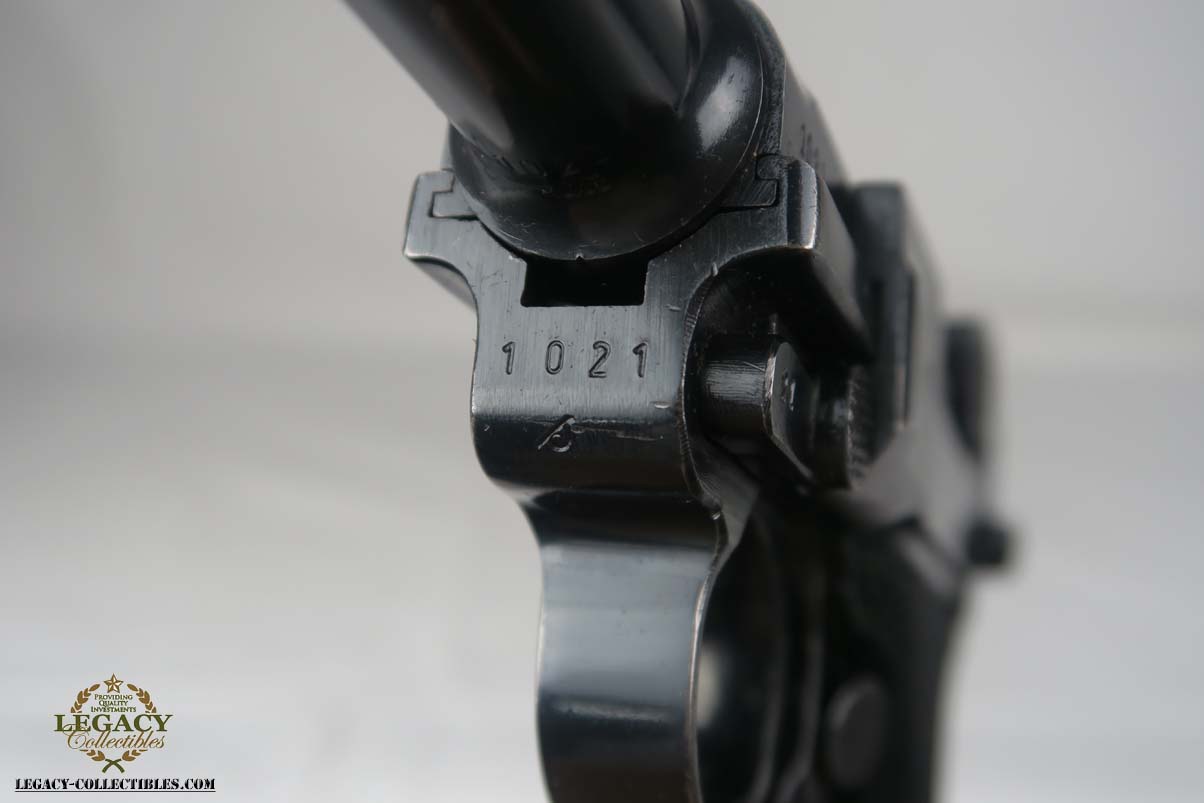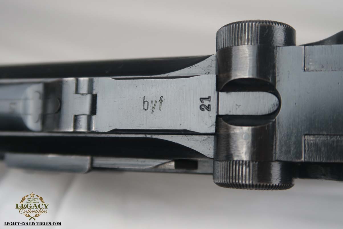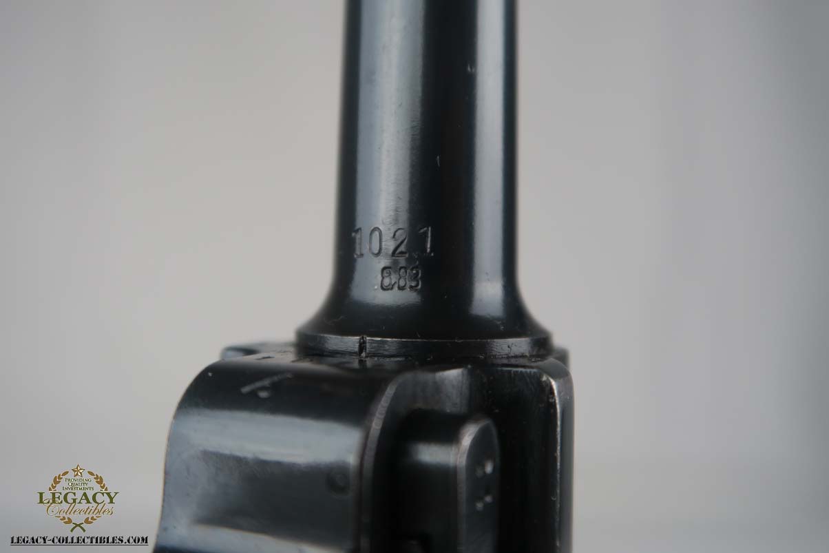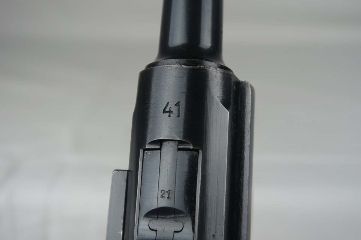4/24/17 – This is a full black widow luger rig, including spare magazine, luger tool and a rare pigskin holster that is dated 1941.  The original finish on the luger is about 95-96%, with the wear found on all the high edges – likely from being stored in/with the holster.  All numbered parts are matching all the way down to the levers, hold open and firing pin.  Proper fxo magazine and black wartime bakelite grips.  Proper luger tool is proofed E/655, as is the frame of the pistol.  Rare pigskin black holster is P.08 marked as well as ‘bdq’ maker-marked, and dated ’41’.  Bore is very nice, strong grooves – I’d rate it a 7 or 8 out of 10.