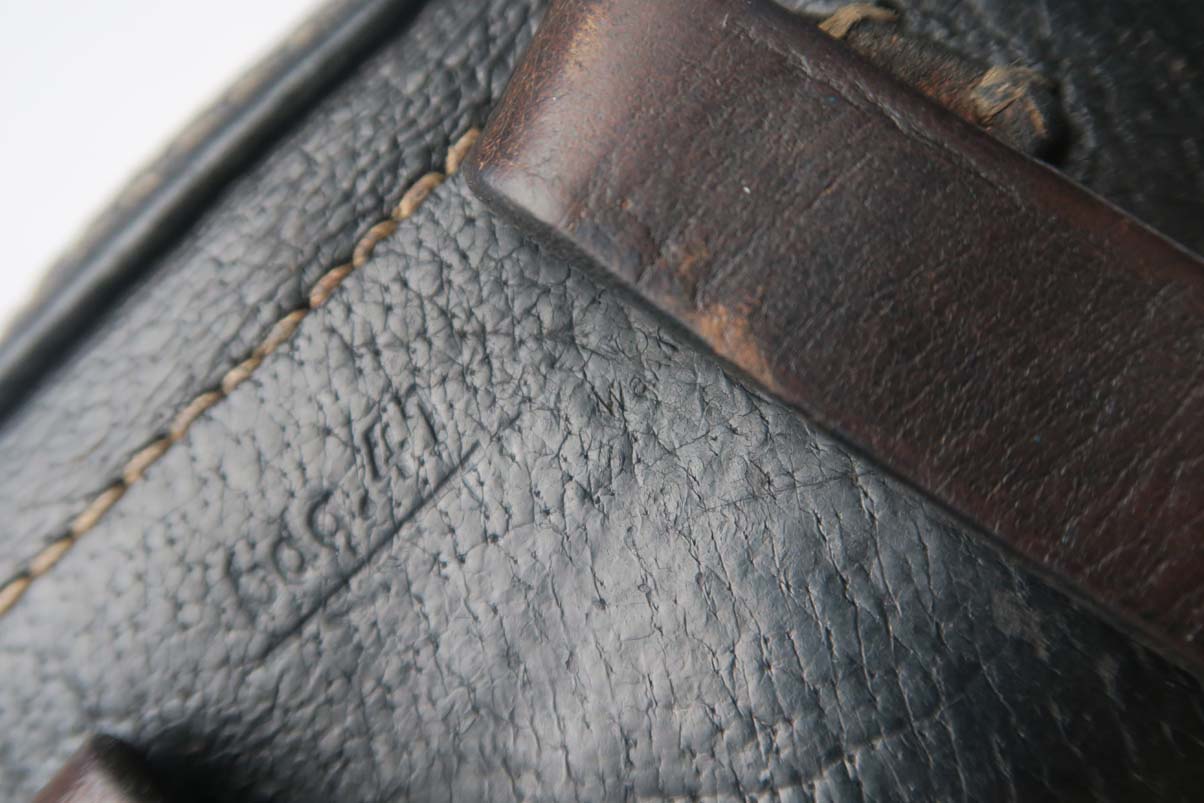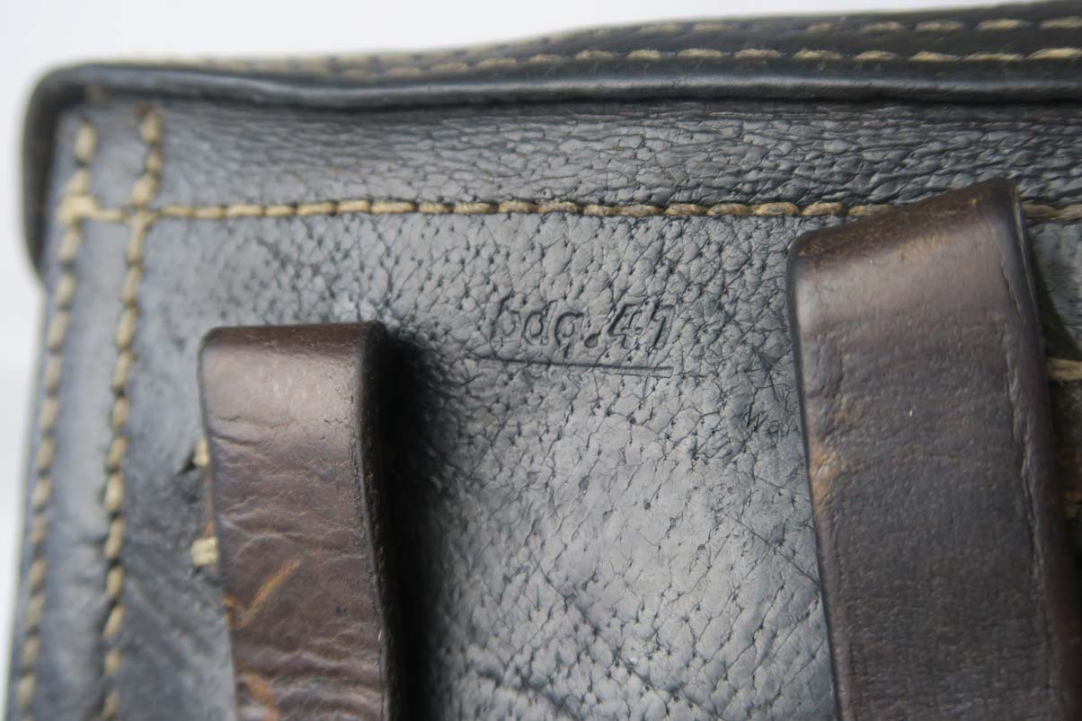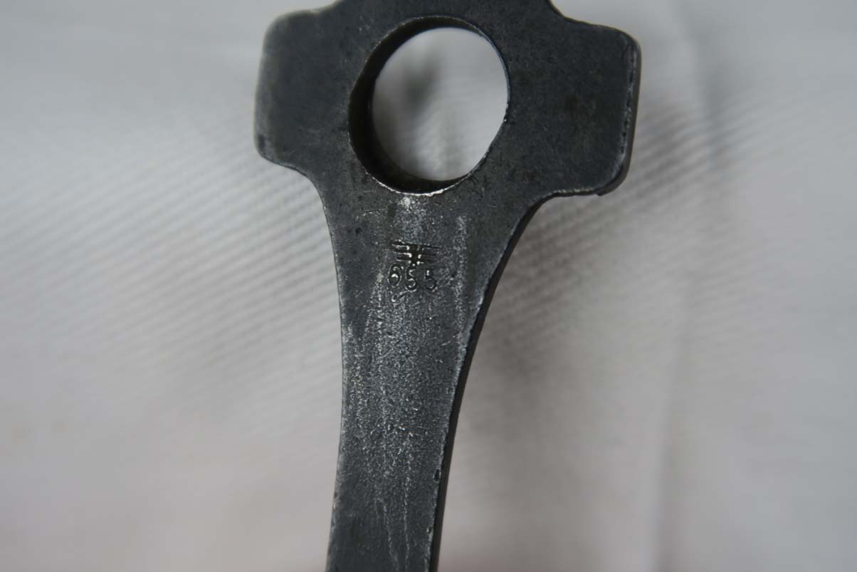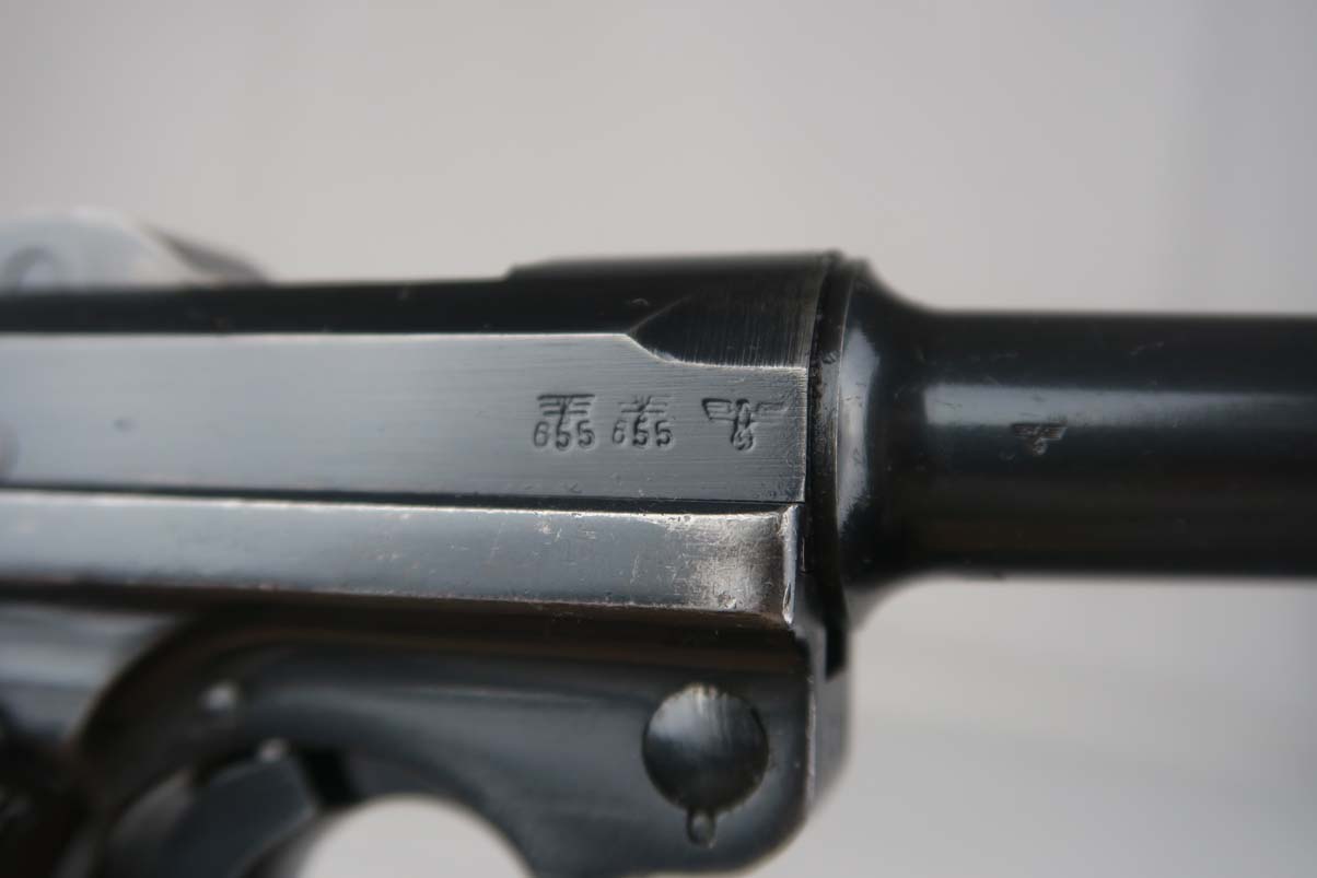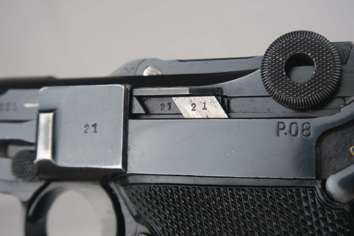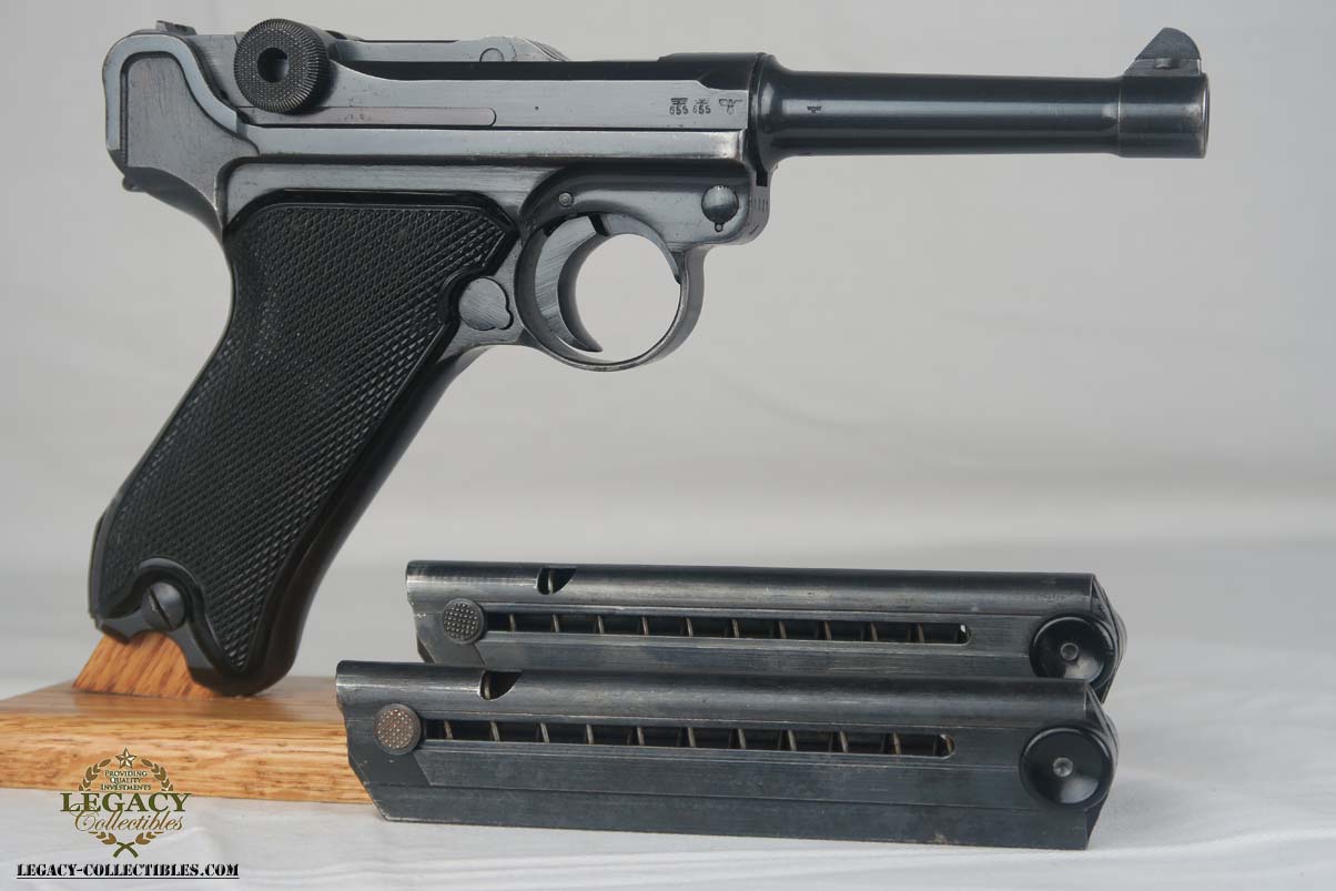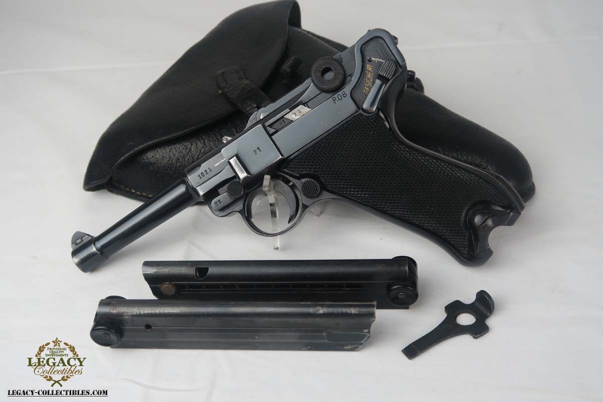 4/24/17 – This is a full black widow luger rig, including spare magazine, luger tool and a rare pigskin holster that is dated 1941.  The original finish on the luger is about 95-96%, with the wear found on all the high edges – likely from being stored in/with the holster.  All numbered parts are matching all the way down to the levers, hold open and firing pin.  Proper fxo magazine and black wartime bakelite grips.  Proper luger tool is proofed E/655, as is the frame of the pistol.  Rare pigskin black holster is P.08 marked as well as ‘bdq’ maker-marked, and dated ’41’.  Bore is very nice, strong grooves – I’d rate it a 7 or 8 out of 10.