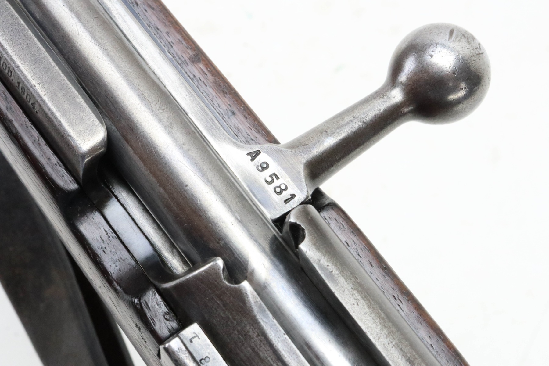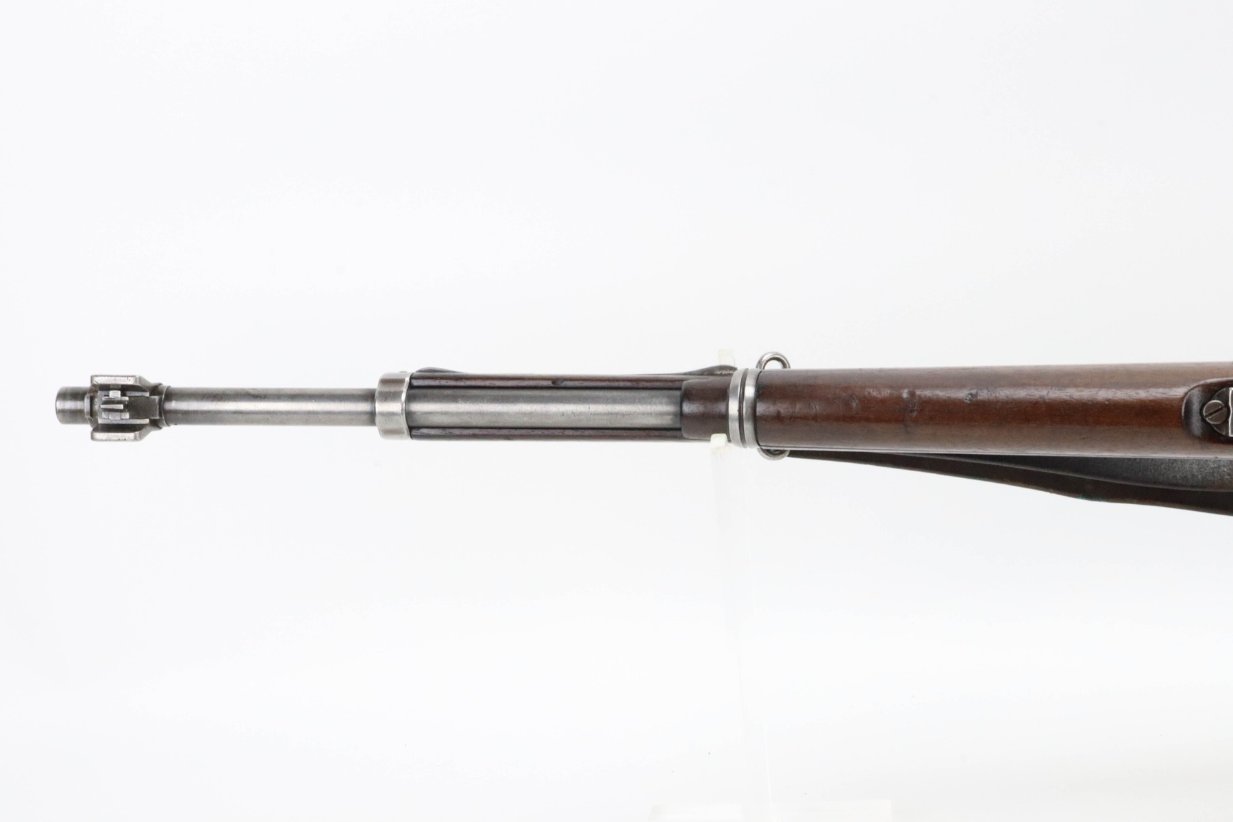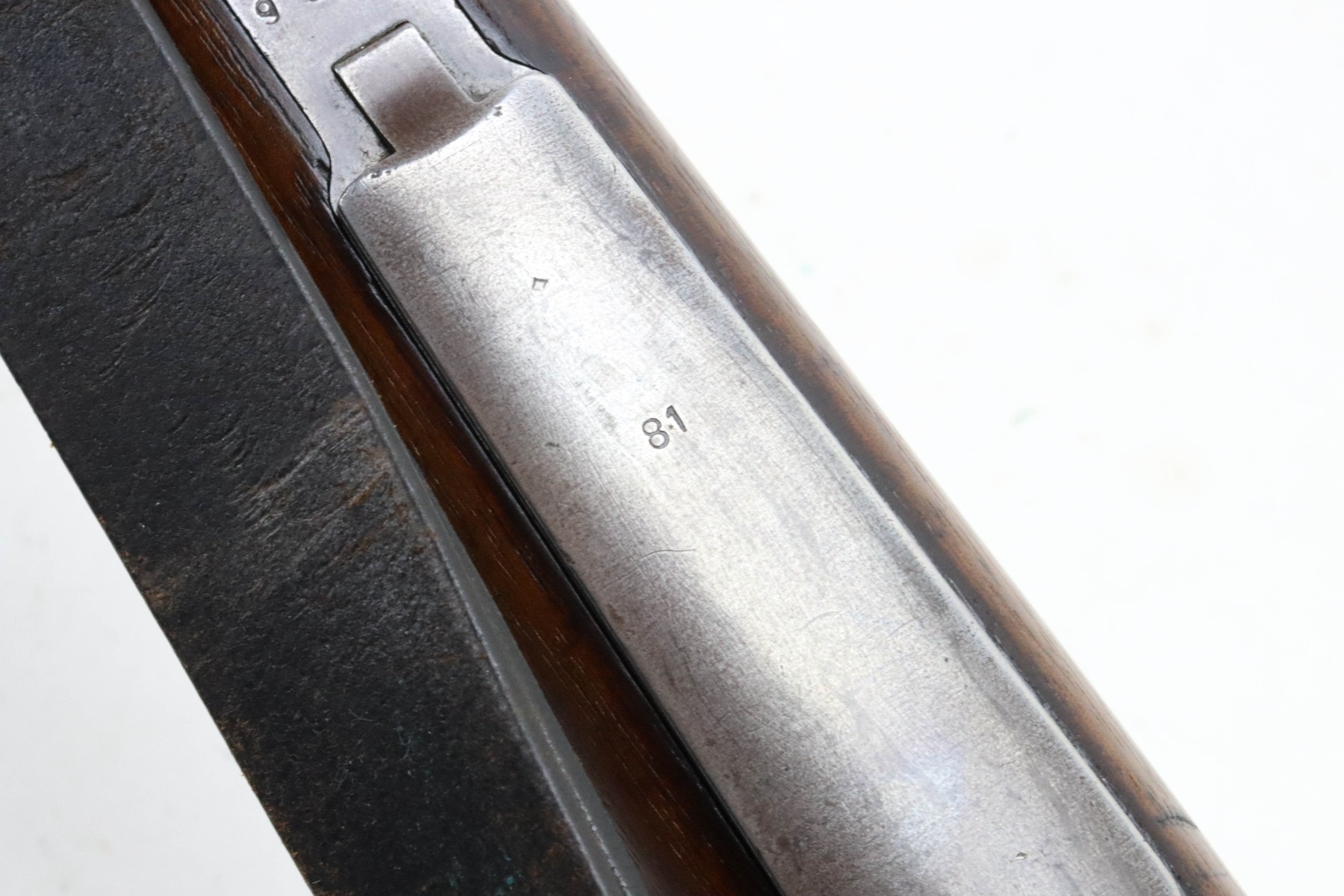 09/10/2024 – For sale is a Portugese Mauser Vergueiro rifle chambered in 8×57 Mauser. The rifle uses a Mannlicher bolt derived from the Gewehr 1888 and Mannlicher-Schönauer along with a Mauser style magazine. This rifle was updated prior to WW2 to the 04/39 spec which rechambered the rifles from 6.5×58 to 8×57 Mauser and a vent hole was drilled into the side. The rifle is in good condition overall with the metal turning grey and dark with age and most of the original finish worn away. The stock is in great condition without any major blemishes. The rifle has matching numbers throughout. The bore is bright with good rifling but is starting to turn darker at the muzzle.