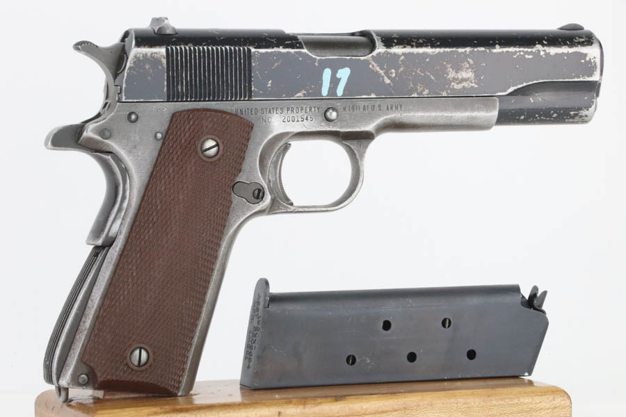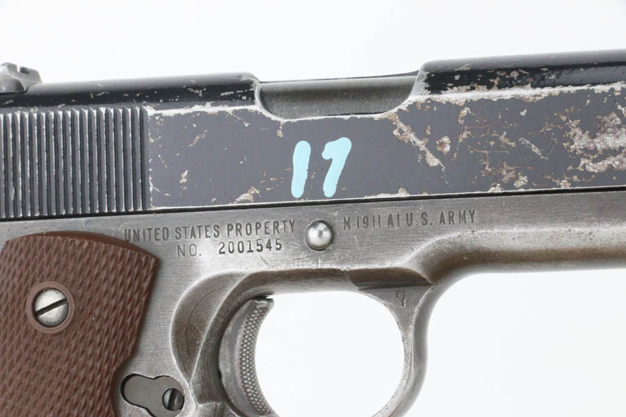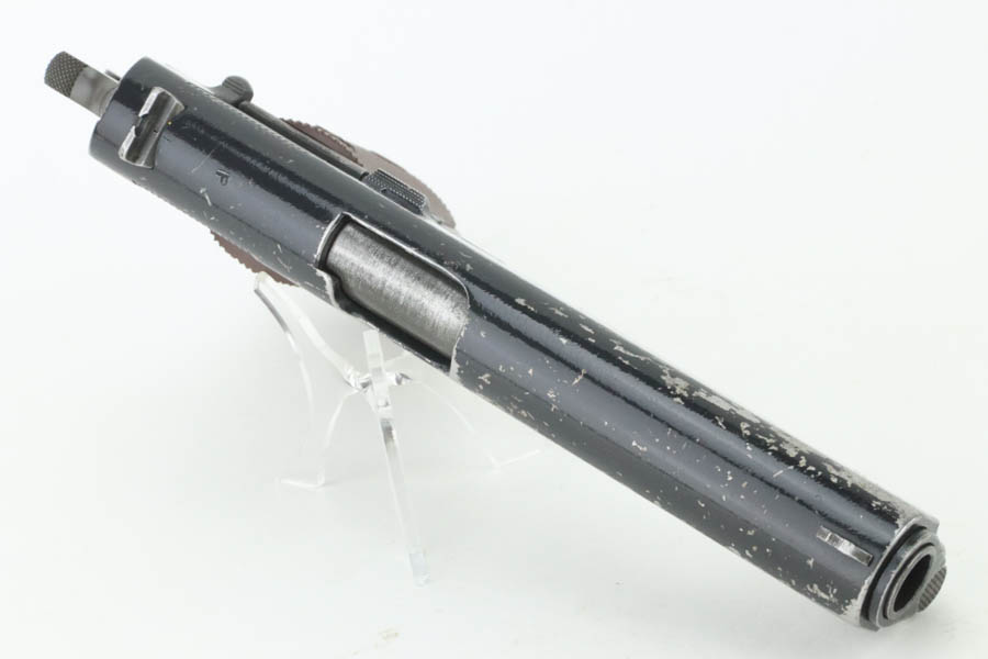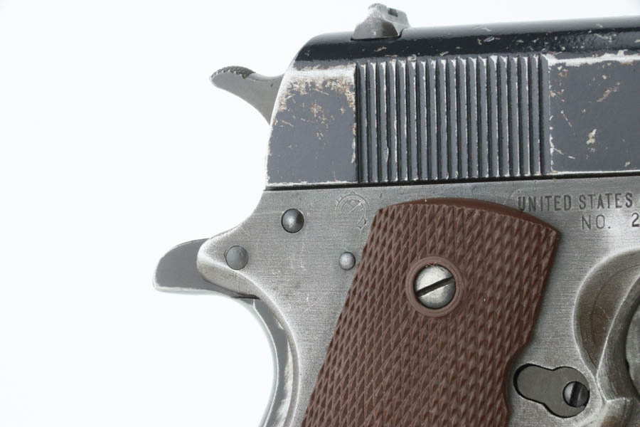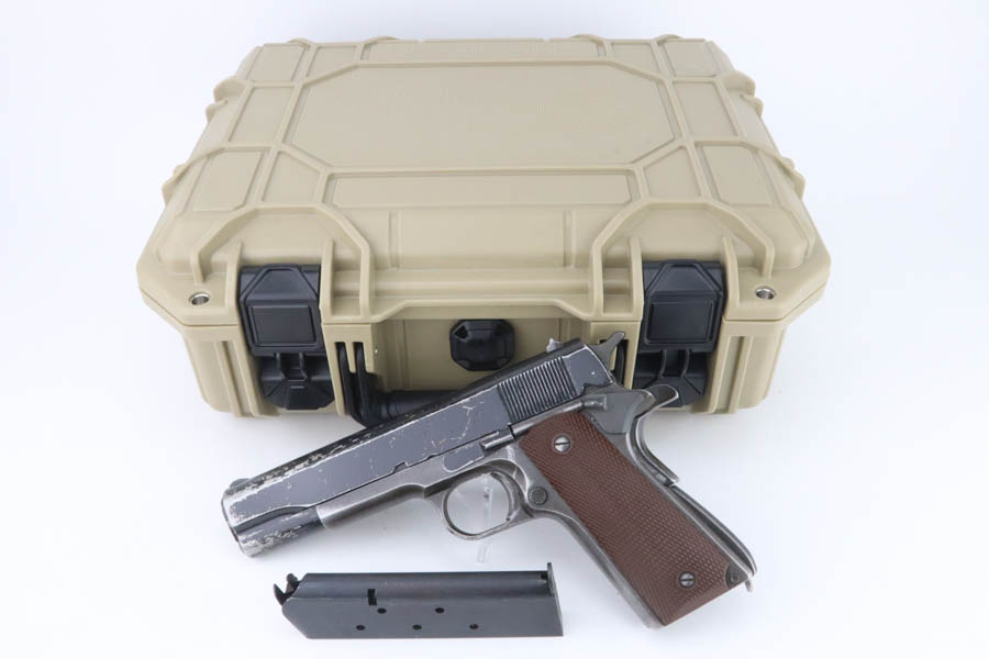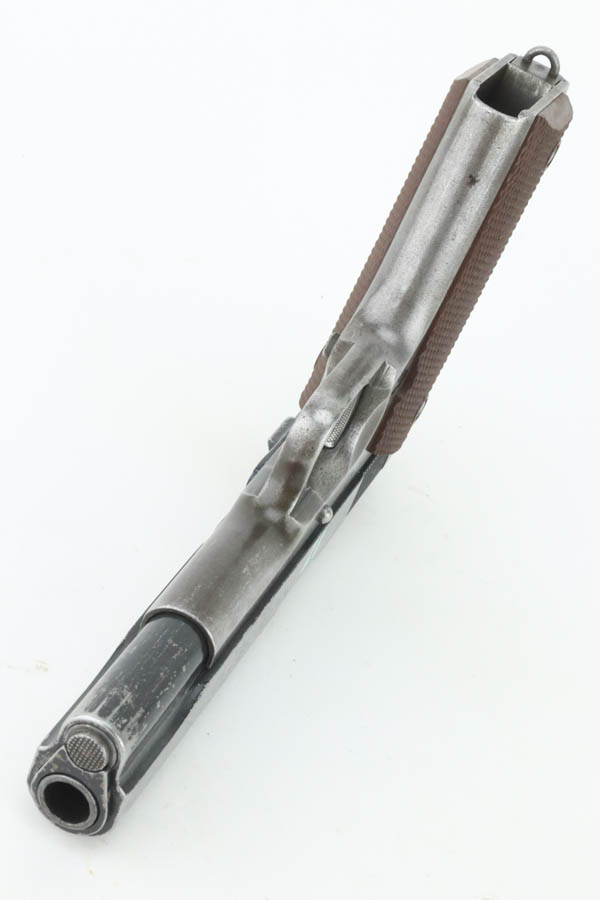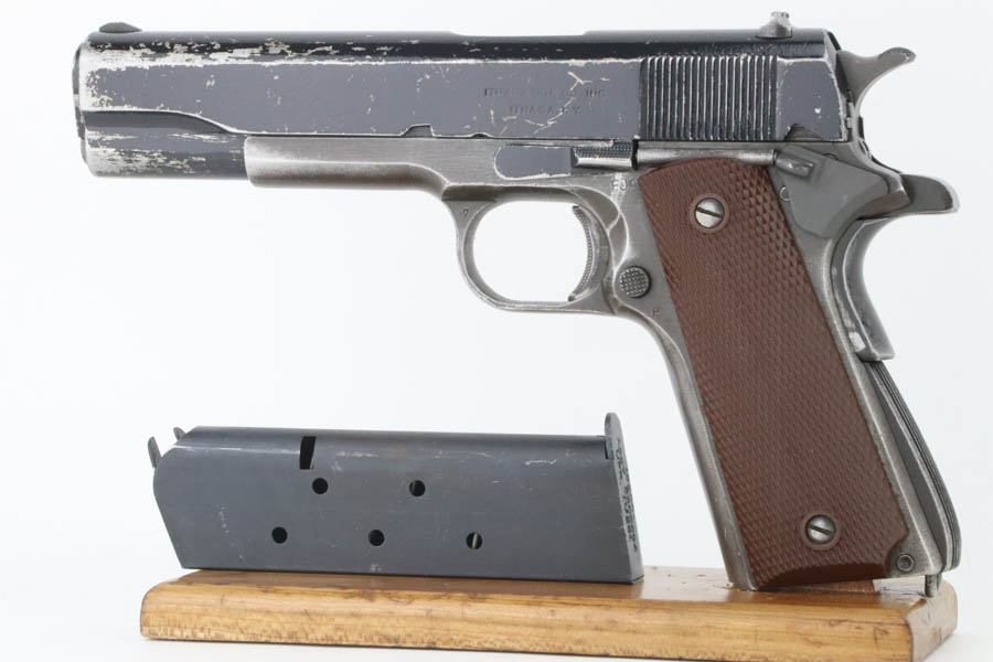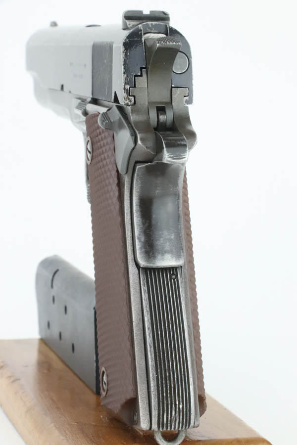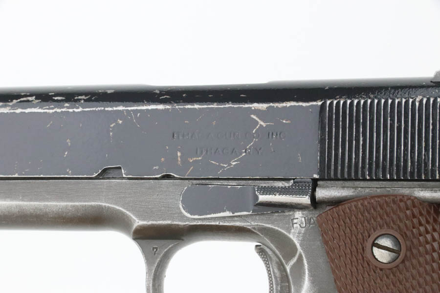 08/07/2024 – For sale is a Remington Rand Model 1911A1 with an Ithaca made slide. The pistol is unique as the slide and slide stop have a worn black enamel finish normally seen on British guns. The frame has many spots of wear, especially towards the front of the frame, the scratch from the slide release, and on the grip safety. The barrel is stamped “S P” on the left side of the lug for Springfield. The bore is very bright but is starting to become frosted. The pistol comes with a CMP case and one blued magazine.