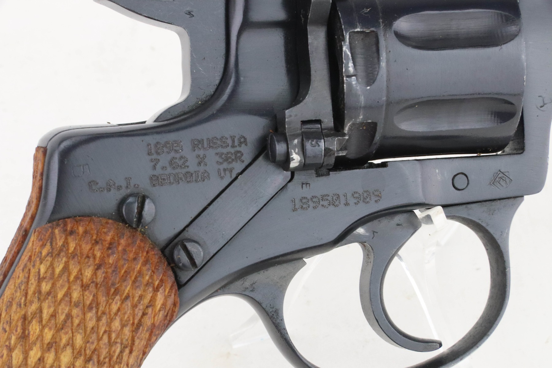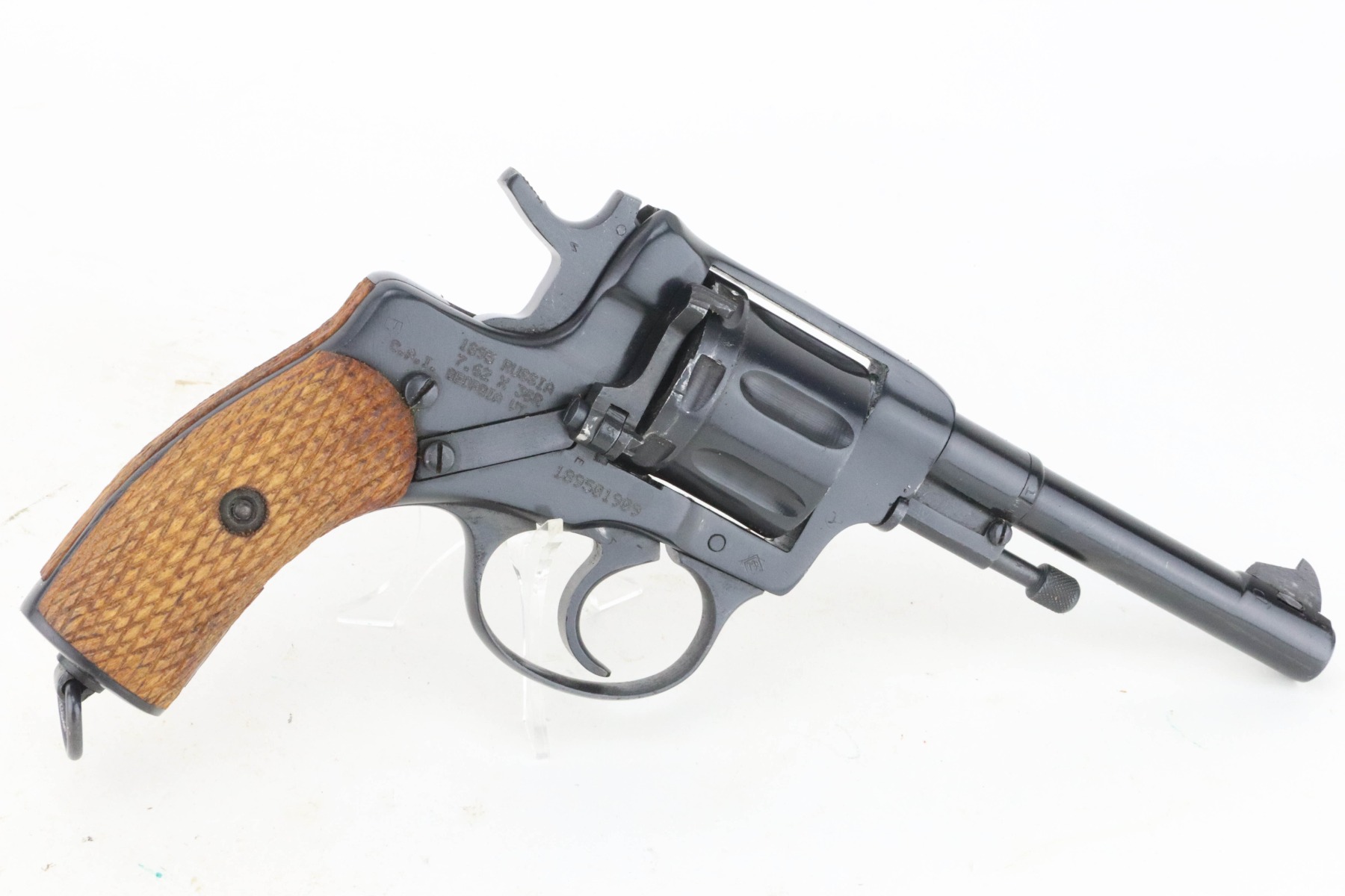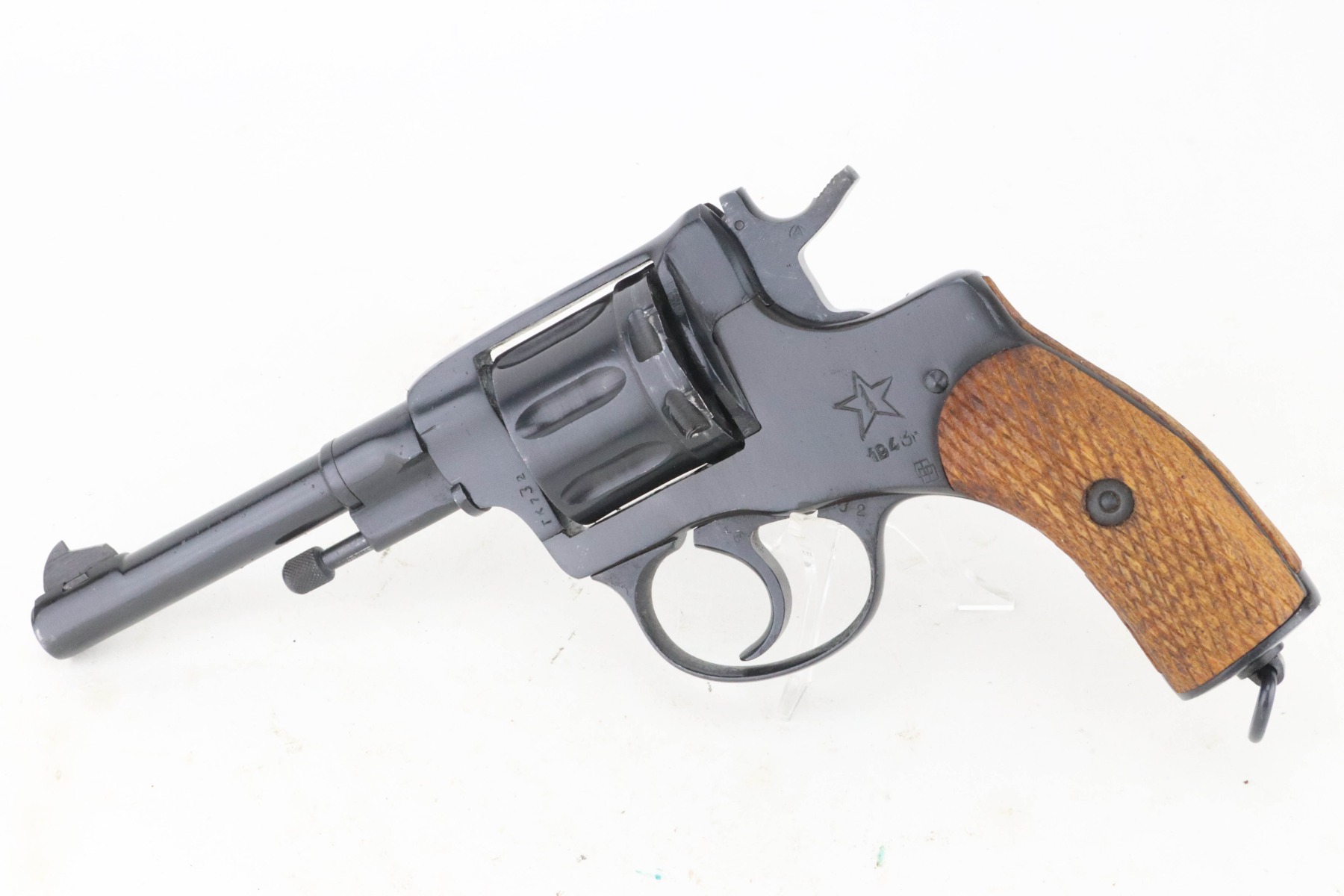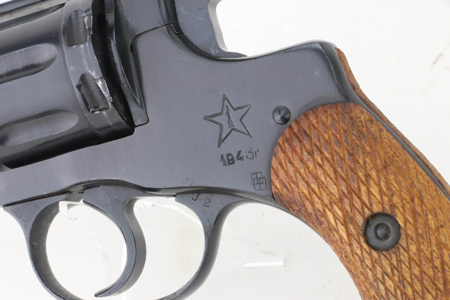 09/09/2024 – For sale is a Tula Nagant Model 1895 revolver chambered in 7.62 Nagant made in 1943. The revolver had undergone post war refurbishment and has the enamel finish applied to all the metal. The bore is very bright with good rifling. The revolver has matching numbers on the frame, cylinder, and trigger guard. The revolver comes with a post war holster.