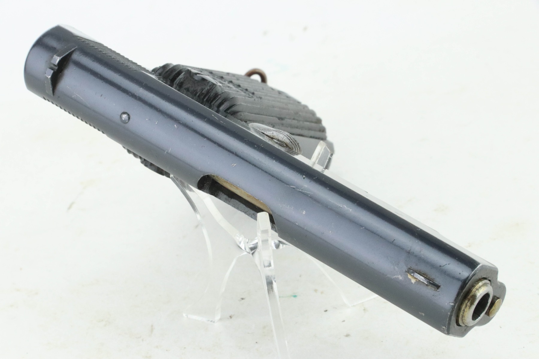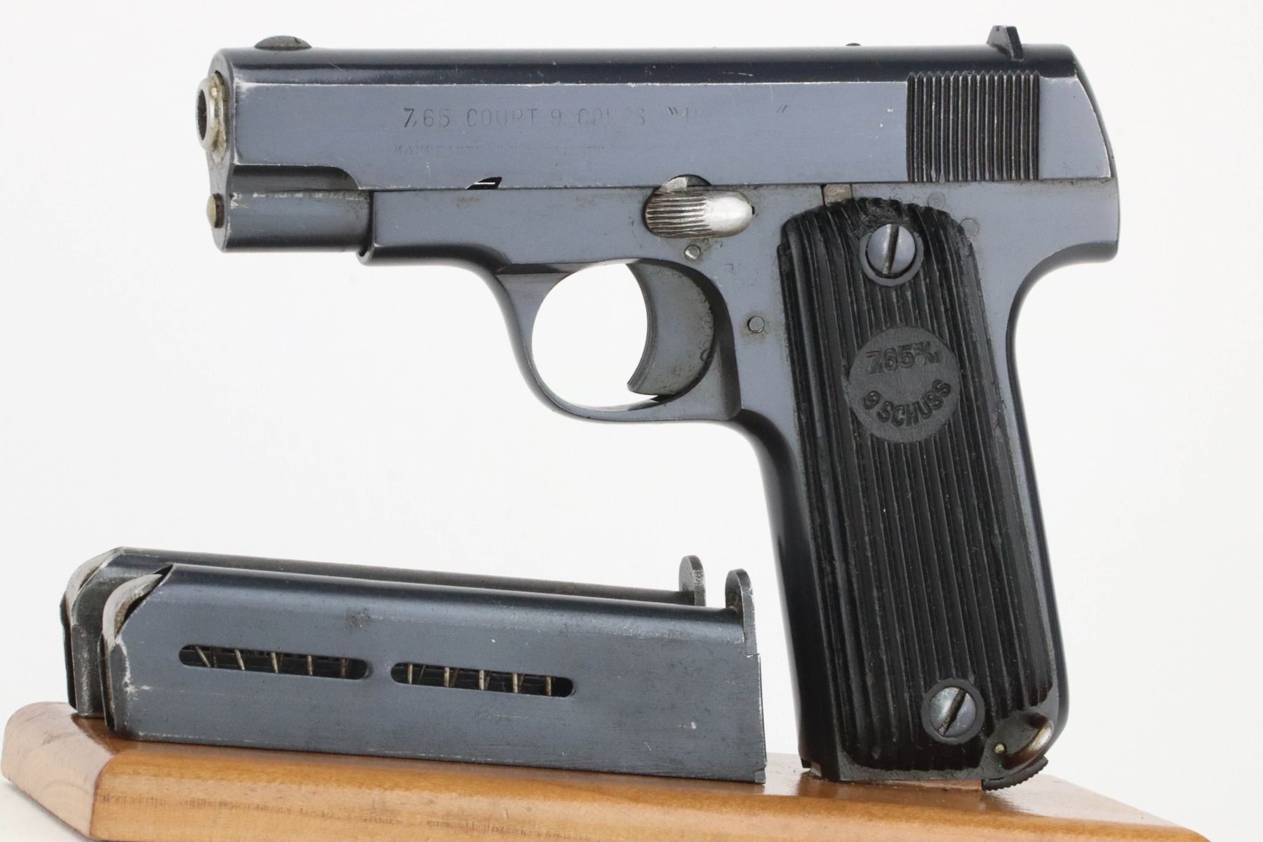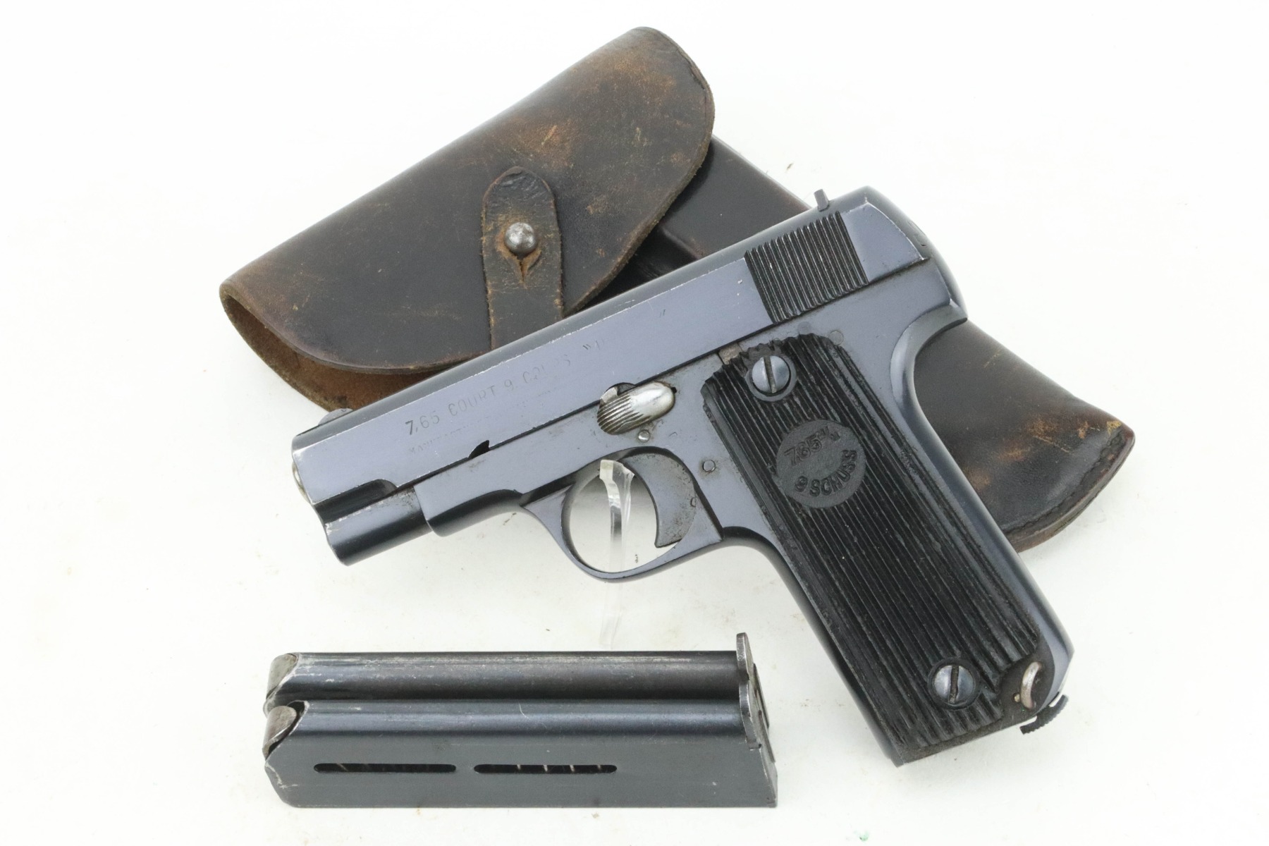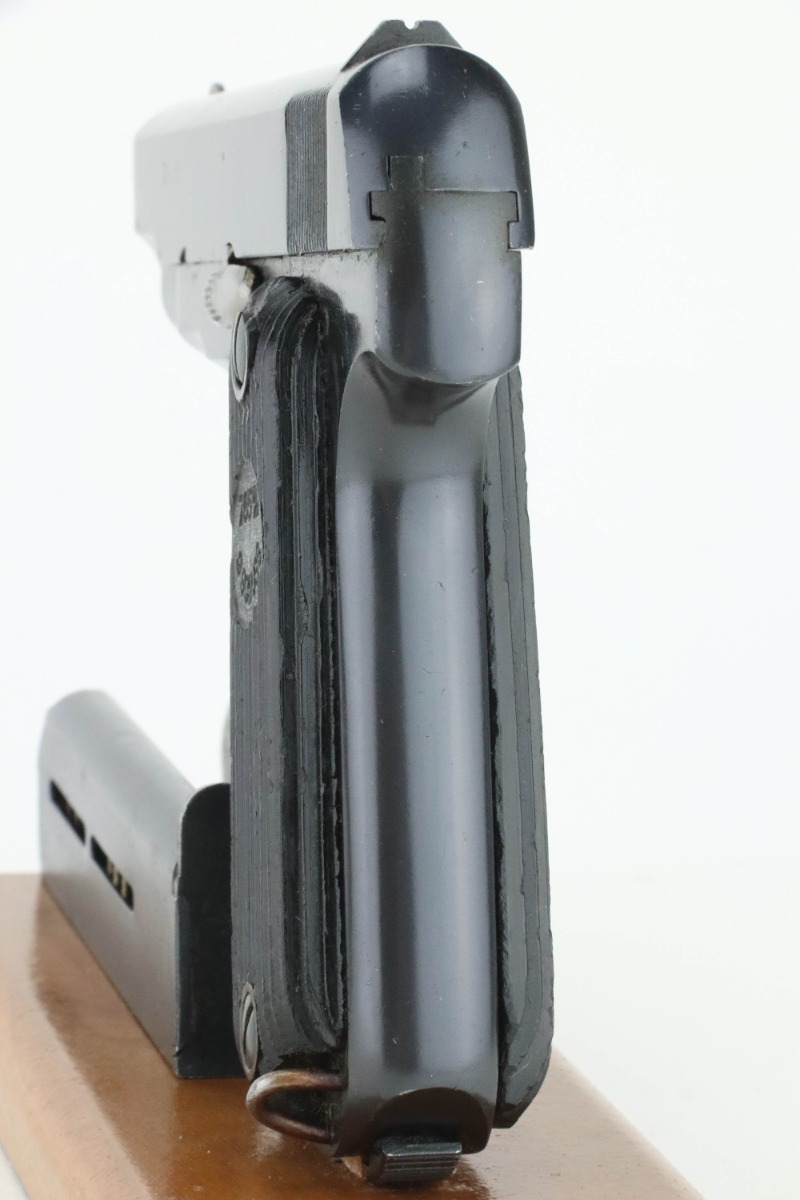 09/09/2024 – For sale is a Unique Model 17 pistol issued to the German army during WW2. The pistol is in great condition overall but we believe has been reblued some time in its past. The pistol has Eagle proofs on the back of the frame on the right side of the gun. The bore is bright with some signs of wear. The pistol comes with one spare magazine and a well worn holster.