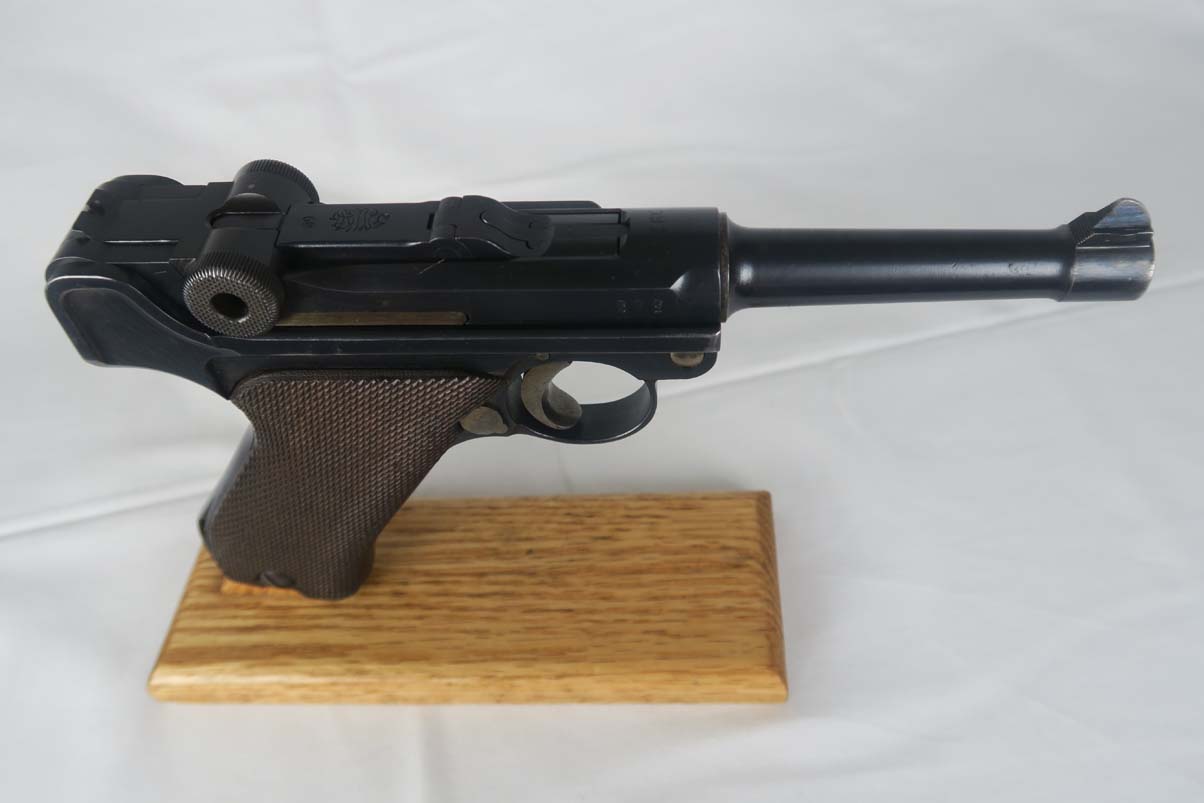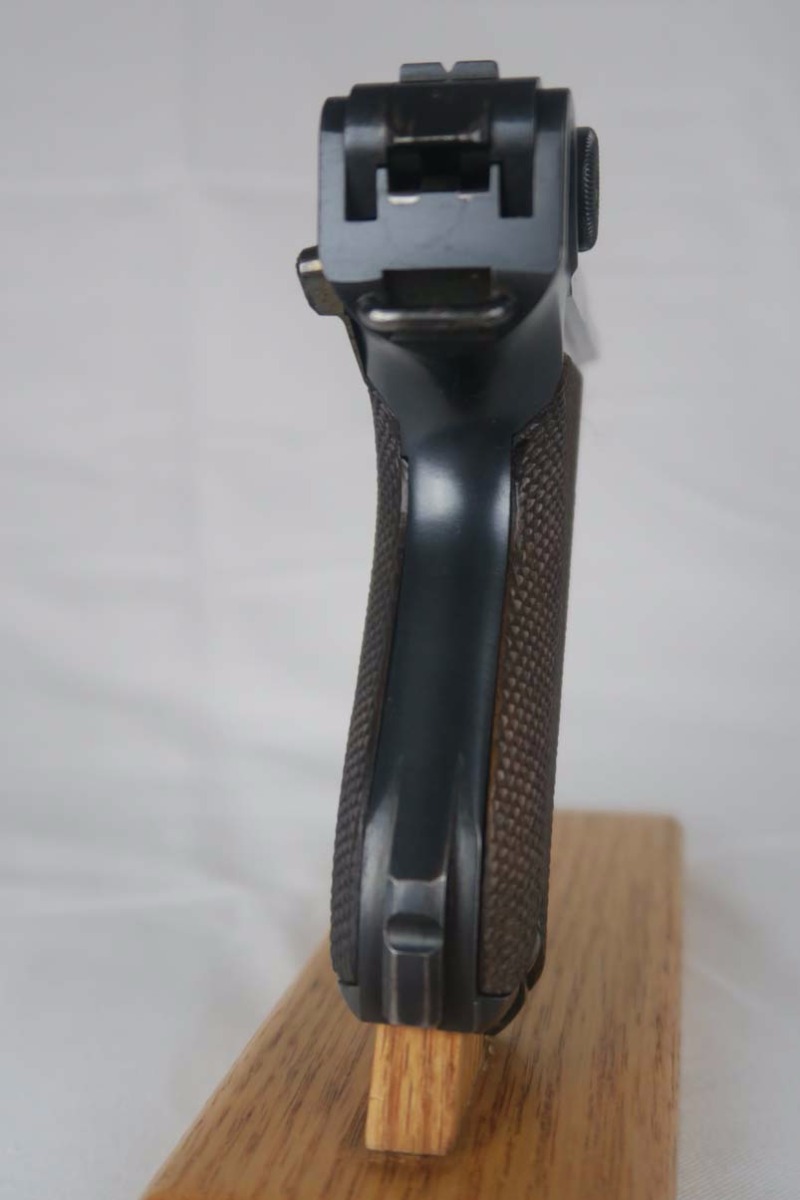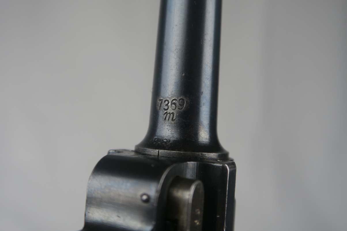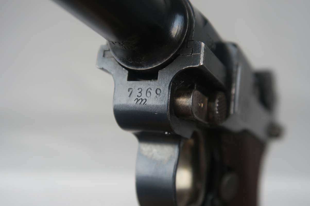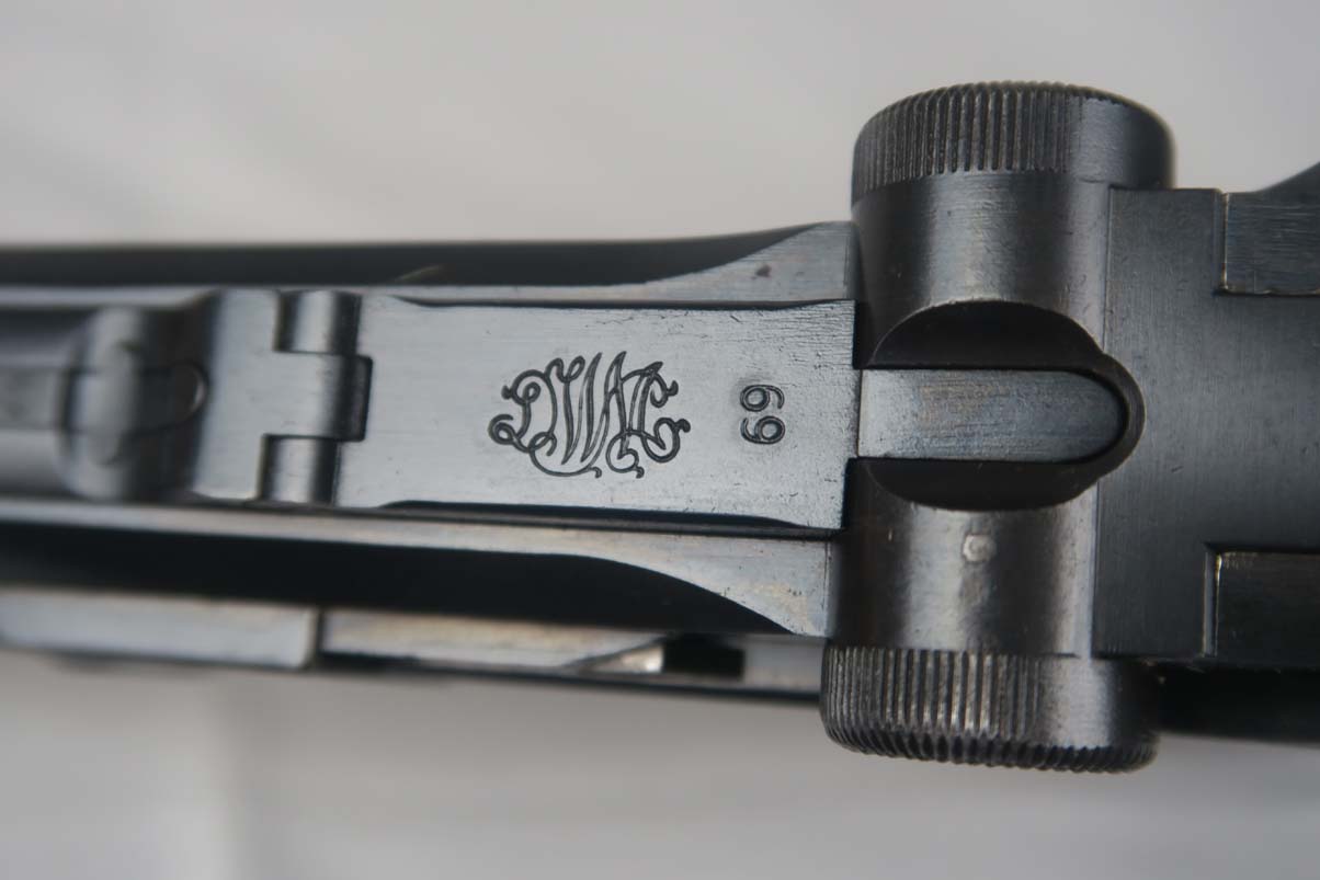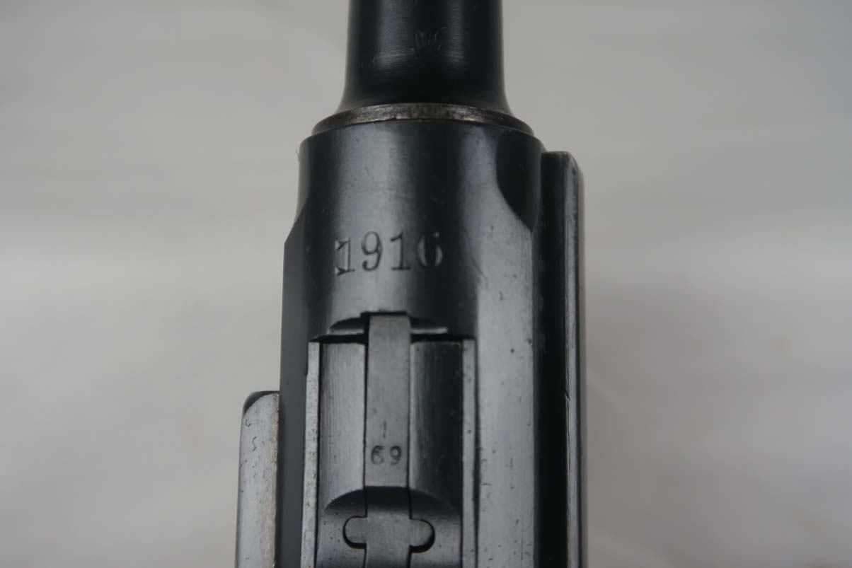 4/14/17 – This is a nice WWI-era DWM luger, with 1916 date above the chamber. It is all matching and original, with about 95% bluing. The majority of the wear is on the sideplate and left side of the muzzle, and the pistol has excellent straps. The grips are numbered and matching to the pistol, but the magazine is numbered to a different gun. The pistol still shows some of the original straw. Bore has decent rifling but is frosted. Smooth mechanical function.
