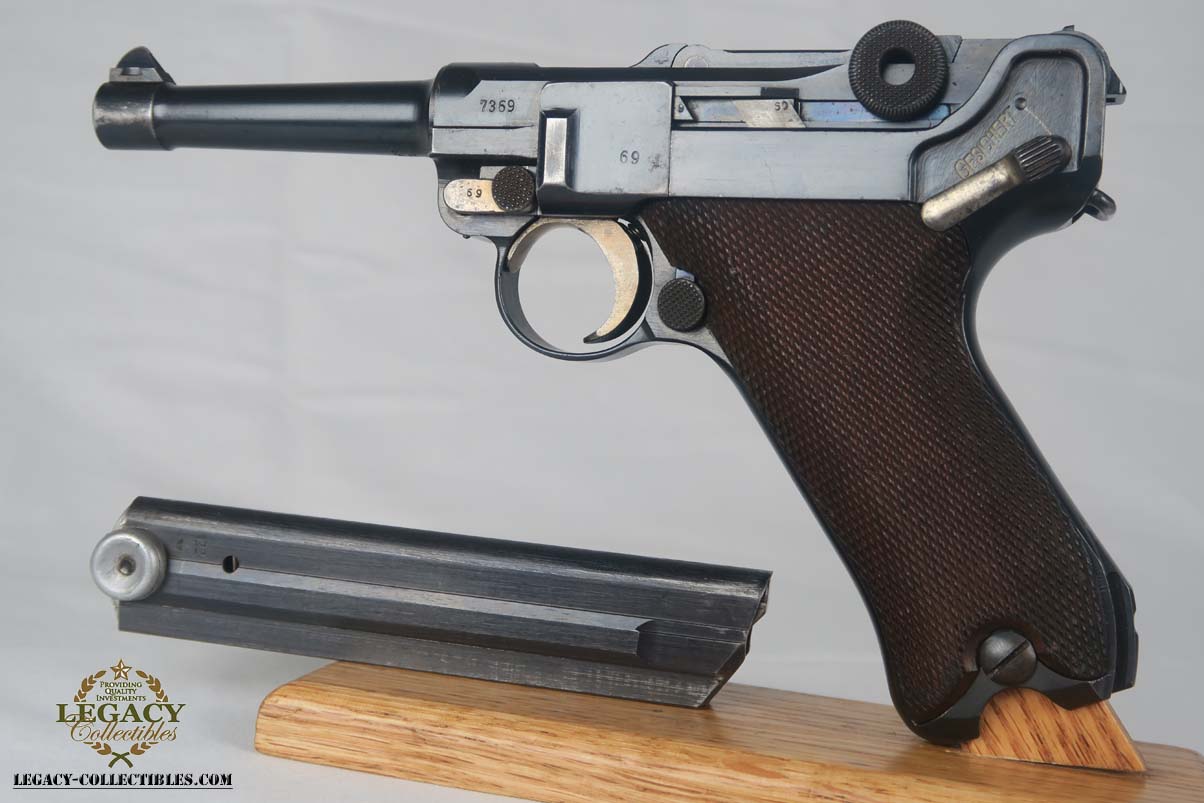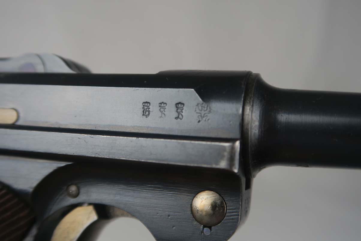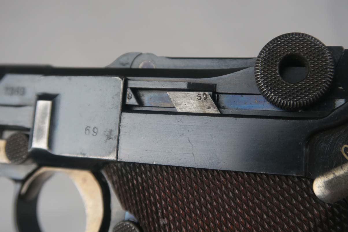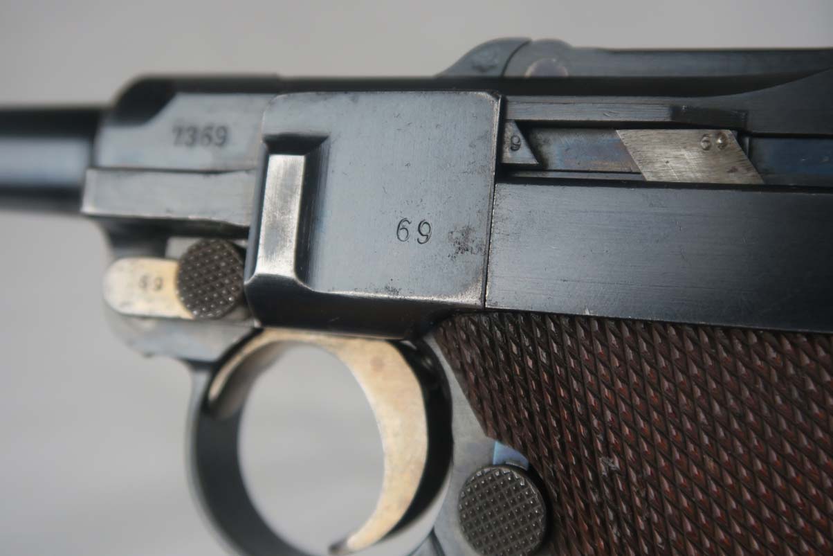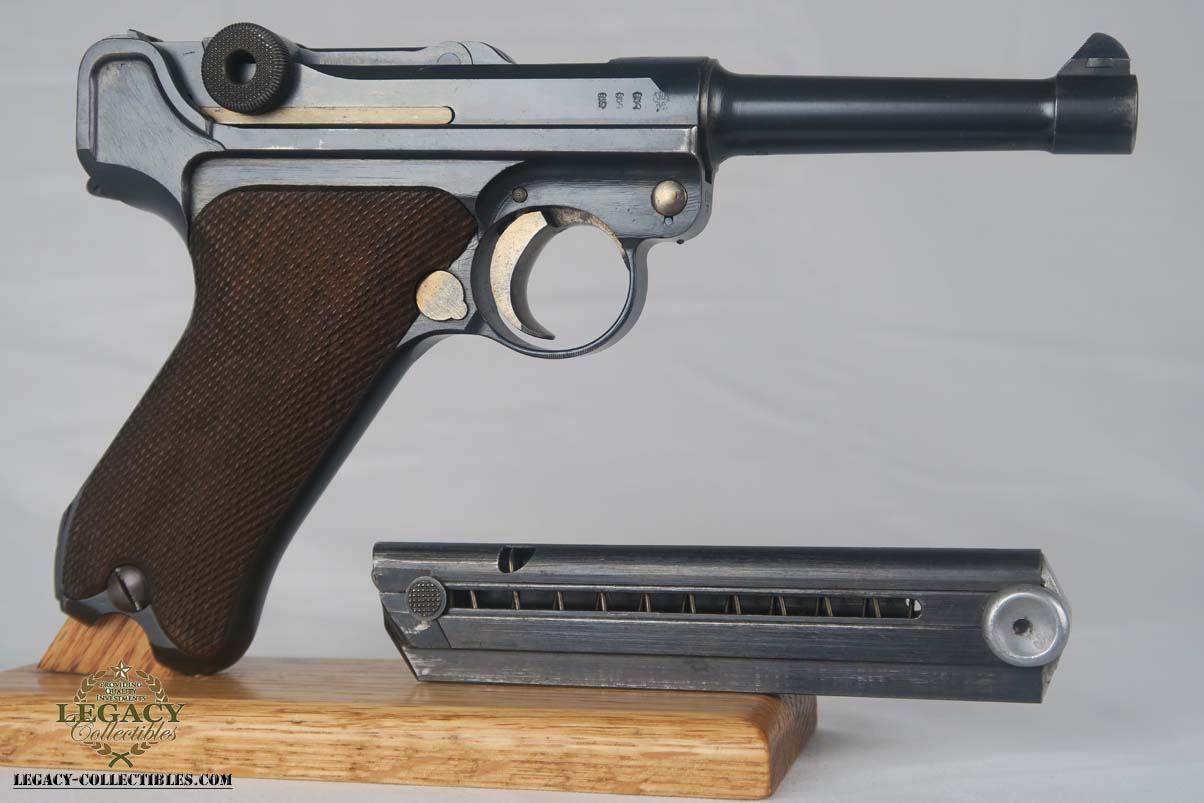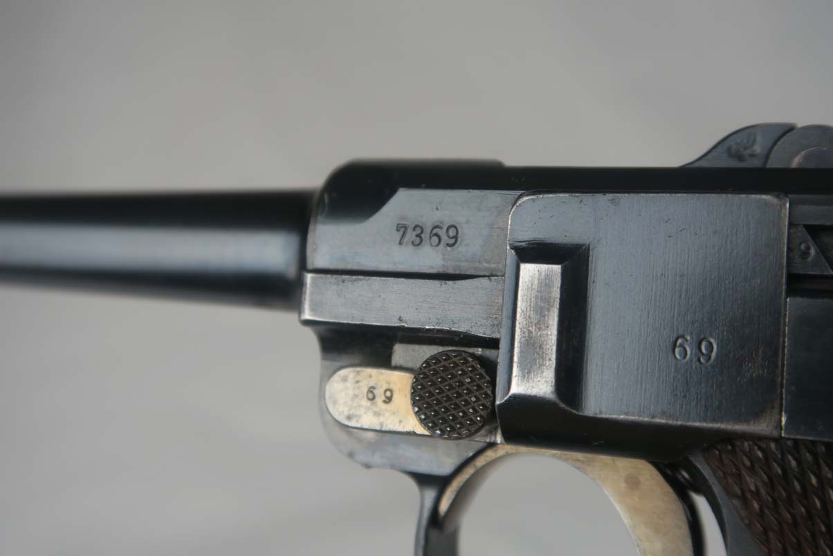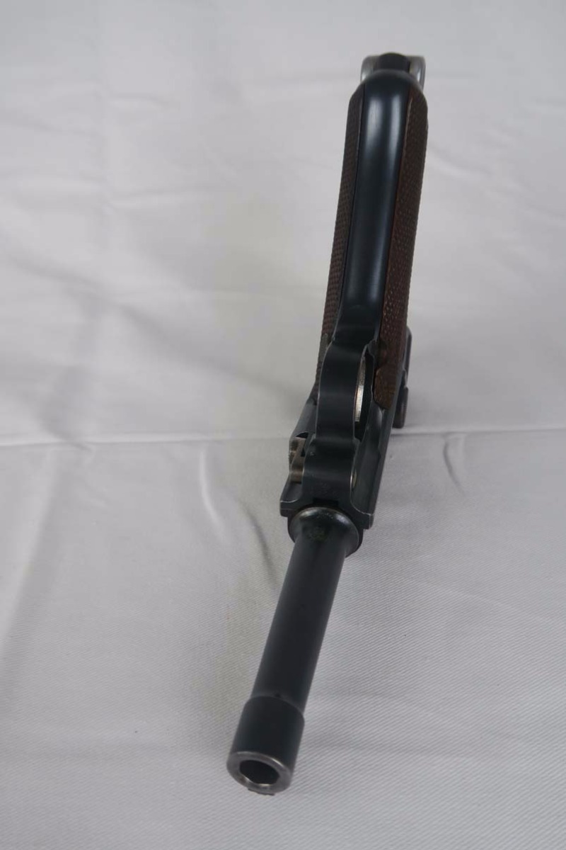 4/14/17 – This is a nice WWI-era DWM luger, with 1916 date above the chamber. It is all matching and original, with about 95% bluing. The majority of the wear is on the sideplate and left side of the muzzle, and the pistol has excellent straps. The grips are numbered and matching to the pistol, but the magazine is numbered to a different gun. The pistol still shows some of the original straw. Bore has decent rifling but is frosted. Smooth mechanical function.