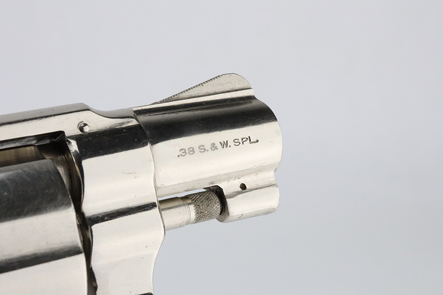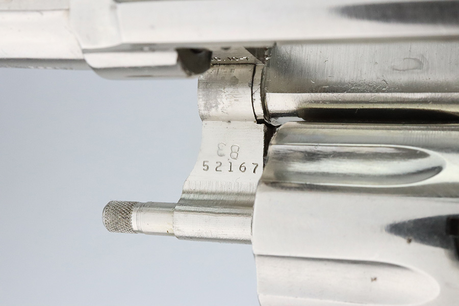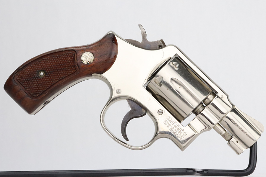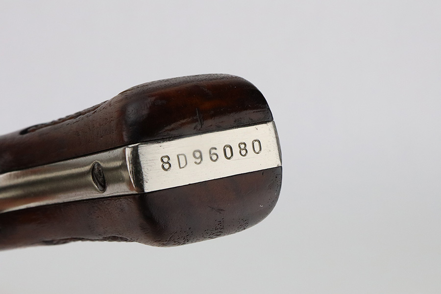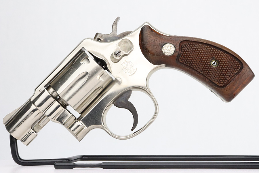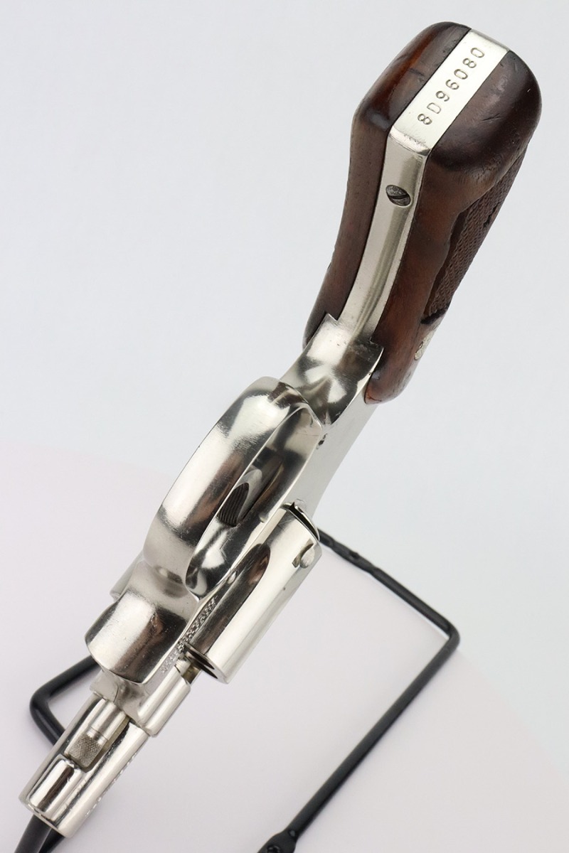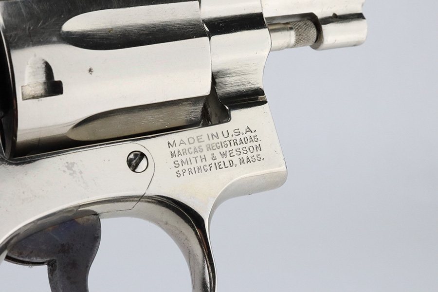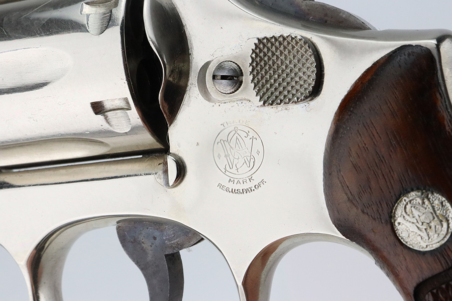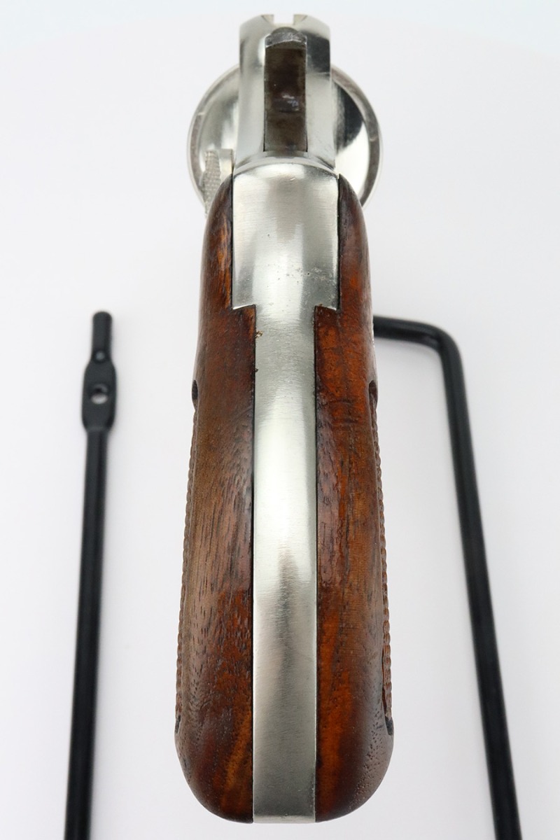 3/13/24 – This is an excellent example of a nickeled Smith & Wesson Model 10-7 Revolver from 1981. Chambered in .38 Special with a 2 inch barrel. There is virtually no actual finish loss, but there are micro-scratches in the finish throughout. Fitted with excellent hand-checkered Walnut grips. Excellent bore with strong rifling.