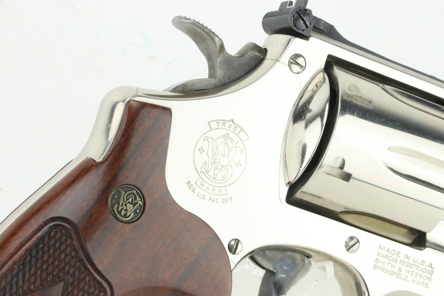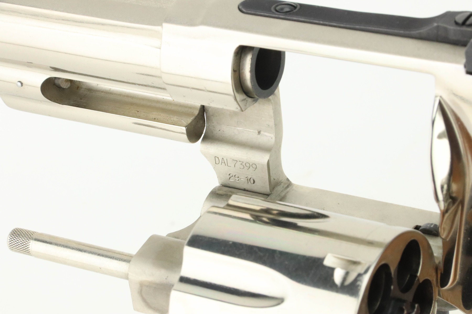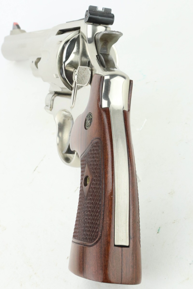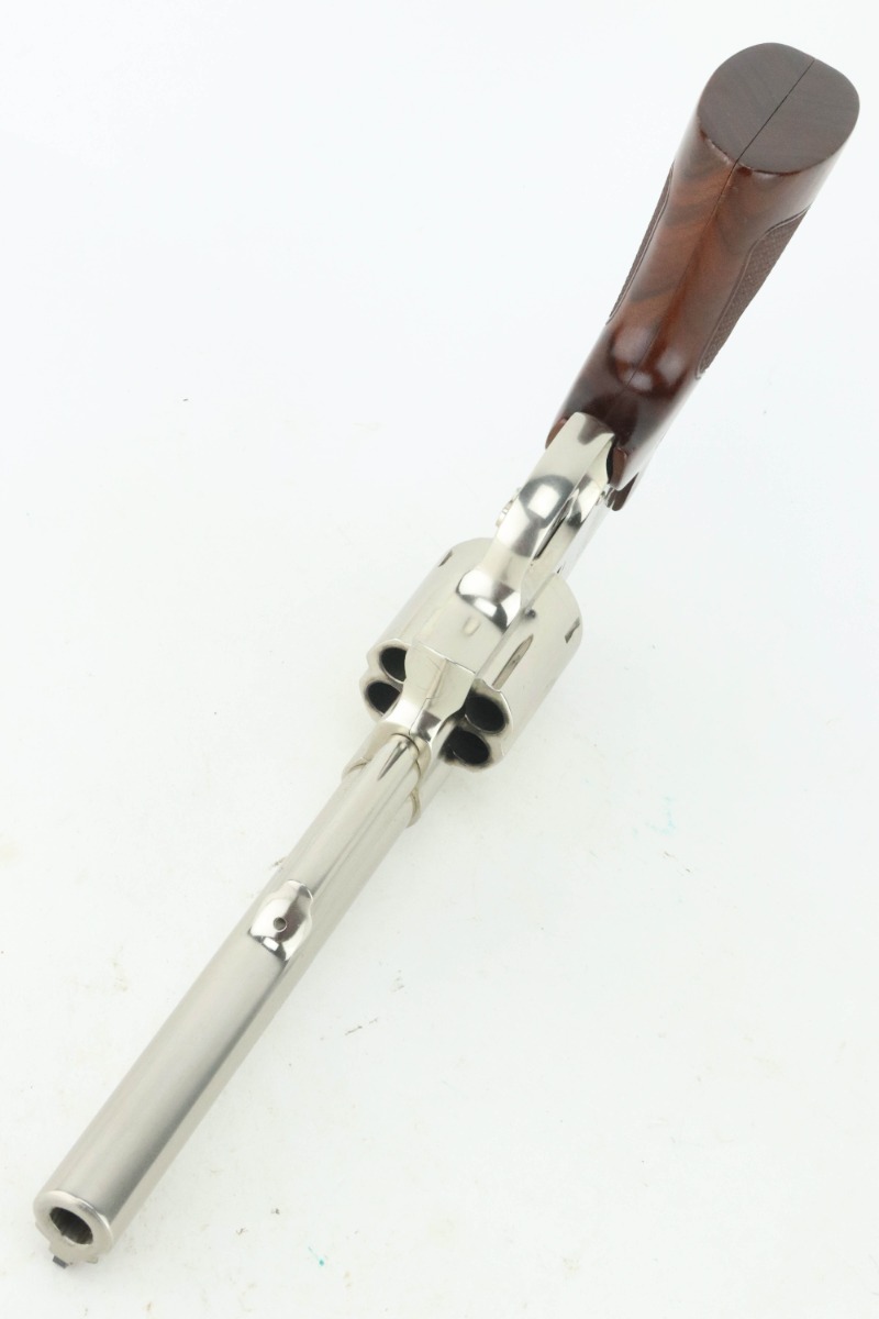 11/1/24 – This is an excellent example of a Smith & Wesson Model 29-10 Revolver. Chambered in .44 Magnum with a 6.5″ barrel. Very nice factory-nickel finish. There is not much sign of wear – just light micro-scratches in the finish here and there and a roll mark on the cylinder. Fitted with checkered wood grips. Excellent, shiny bore. Smooth action.