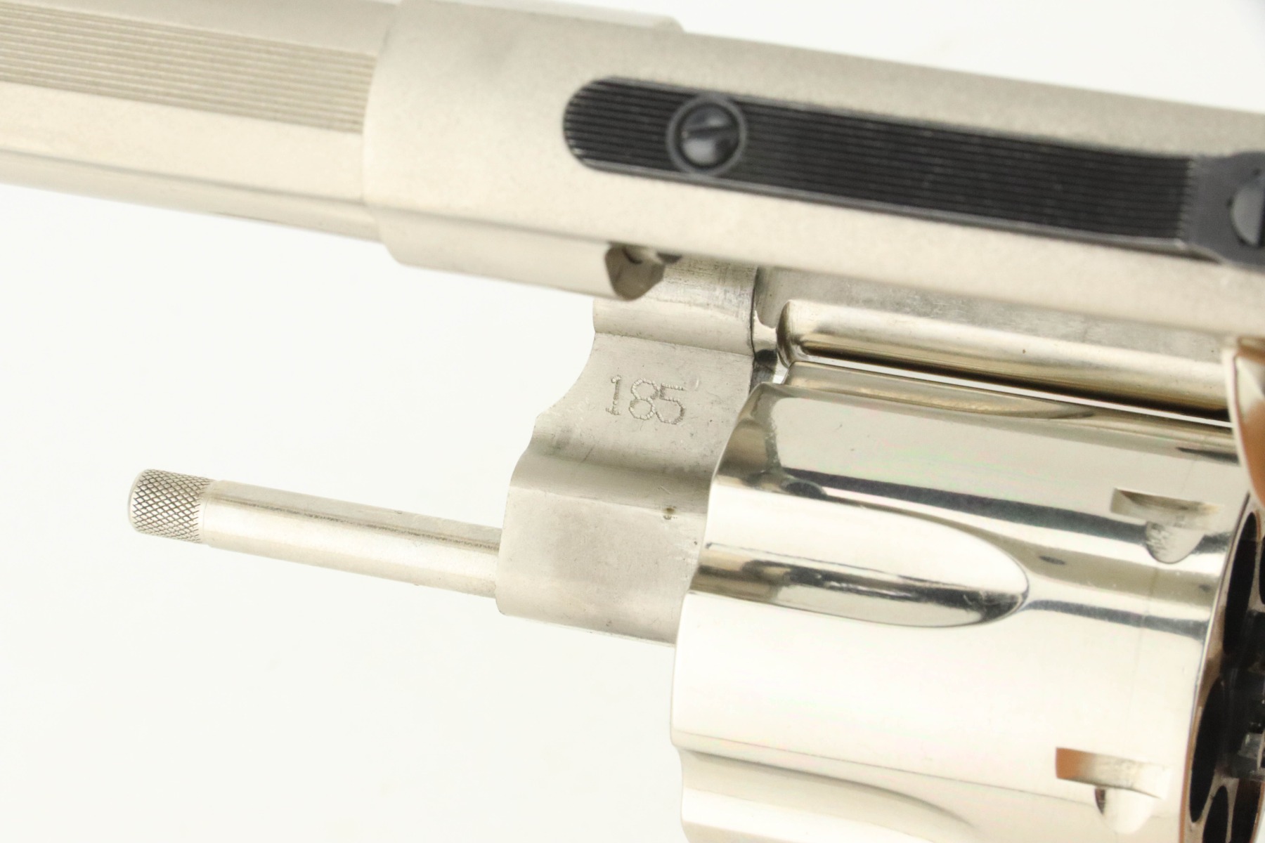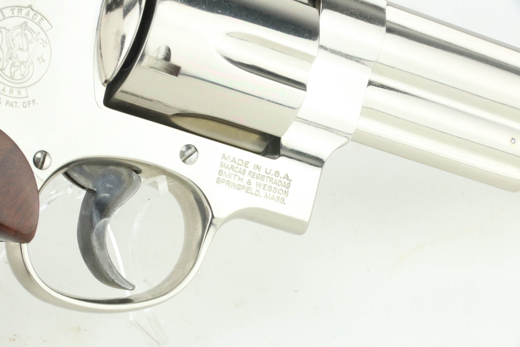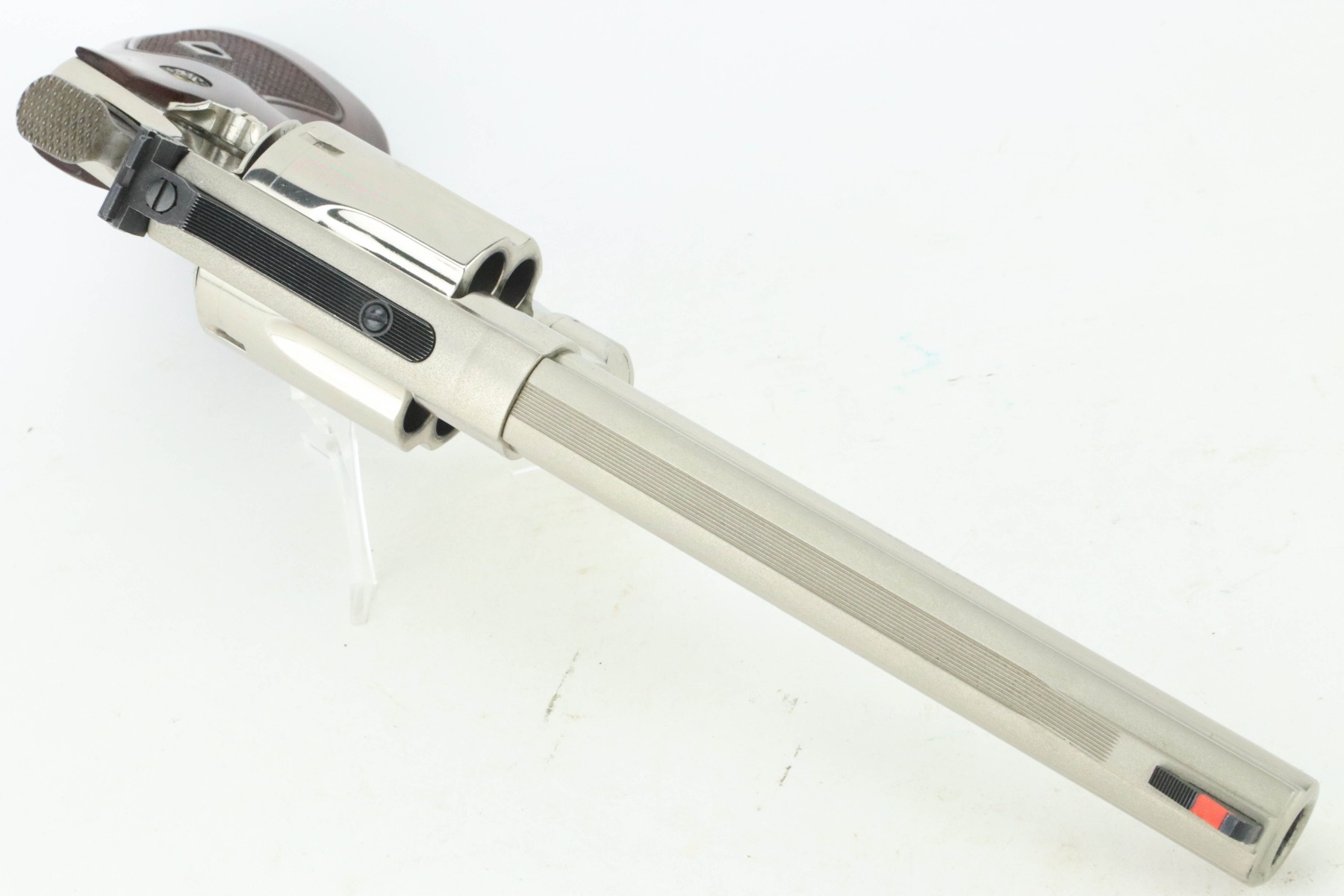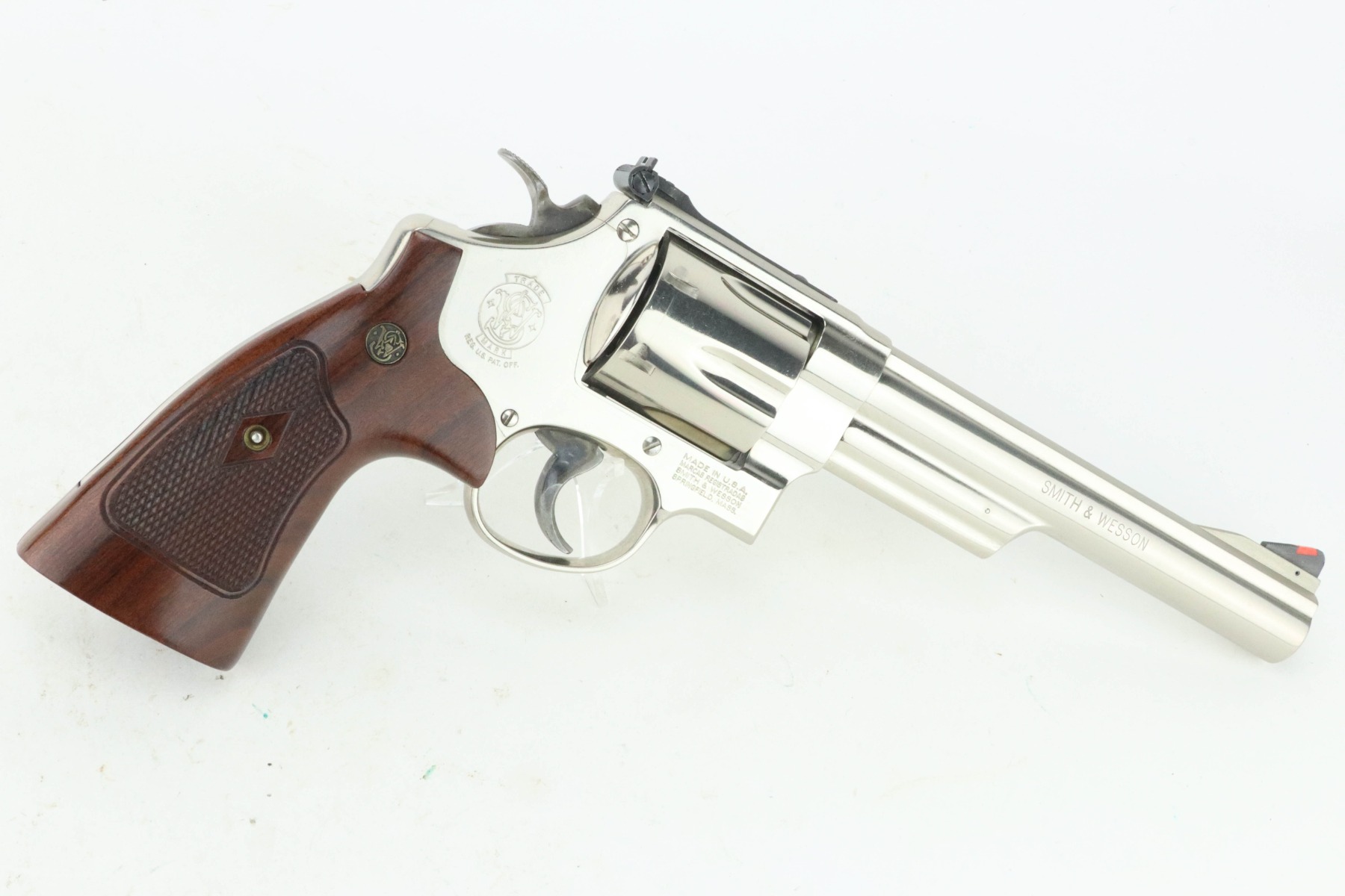 11/1/24 – This is an excellent example of a Smith & Wesson Model 29-10 Revolver. Chambered in .44 Magnum with a 6.5″ barrel. Very nice factory-nickel finish. There is not much sign of wear – just light micro-scratches in the finish here and there and a roll mark on the cylinder. Fitted with checkered wood grips. Excellent, shiny bore. Smooth action.