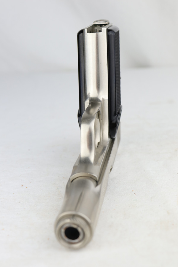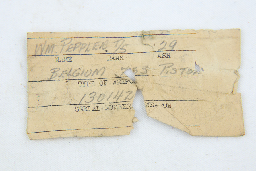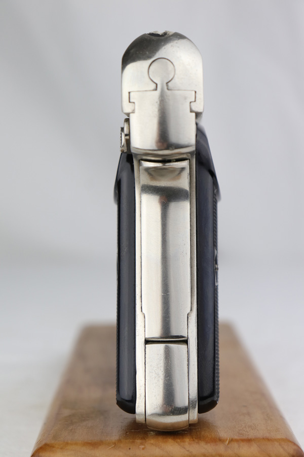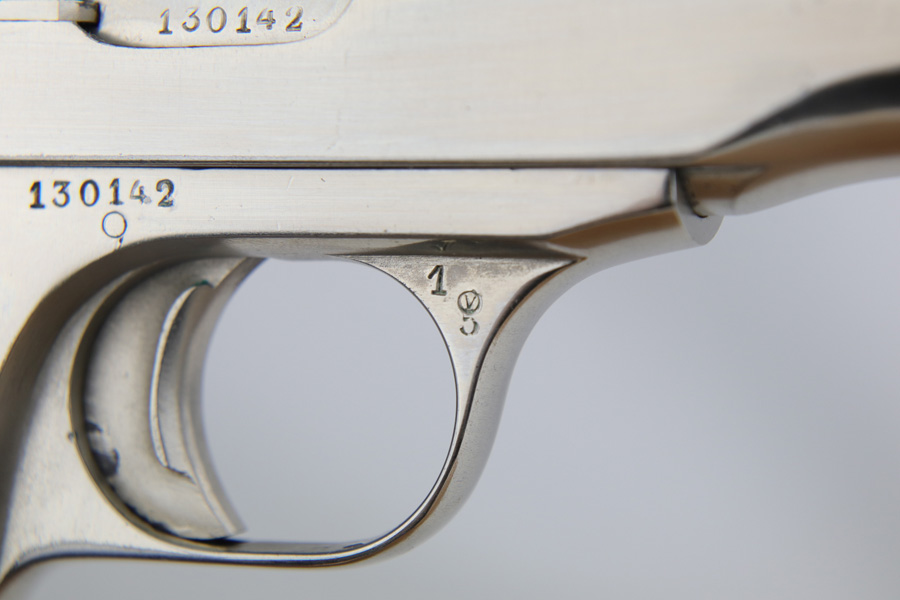 1/18/19 – This is a beautiful nickel-finish FN Browning 1910. It is accompanied by a section of the captured document with matching serial number to the gun. Overall, the gun is in excellent condition, we’d rate about 95%. There is only minor peeling in the nickel on the left side of the slide, near the lettering, and spots of peeling on the magazines. All the parts are matching. The grips are most likely very high-quality reproductions. The bore is excellent, 8/10.