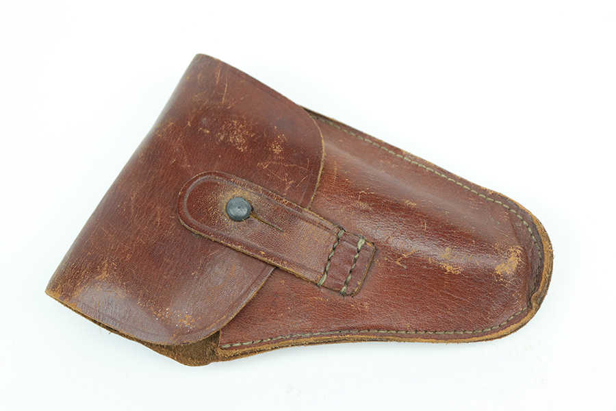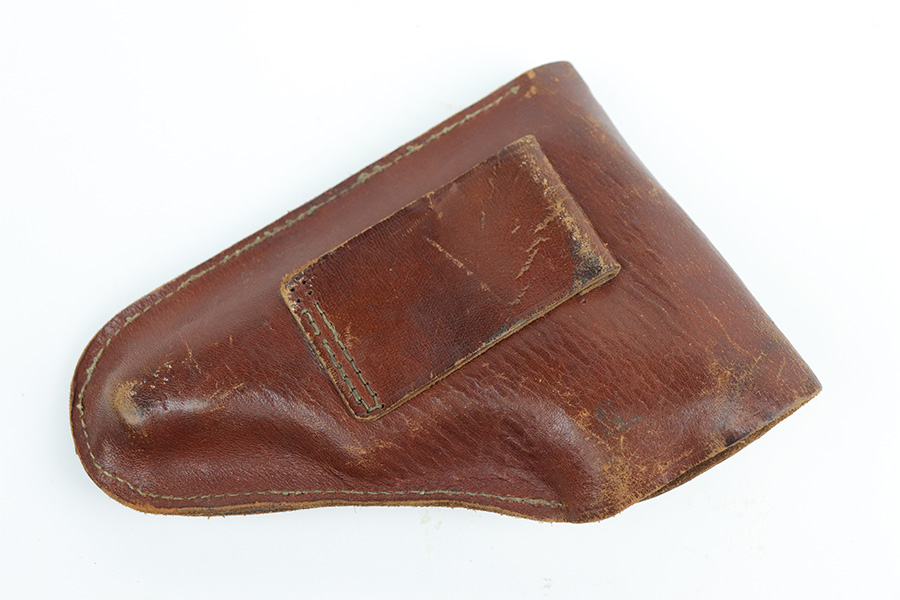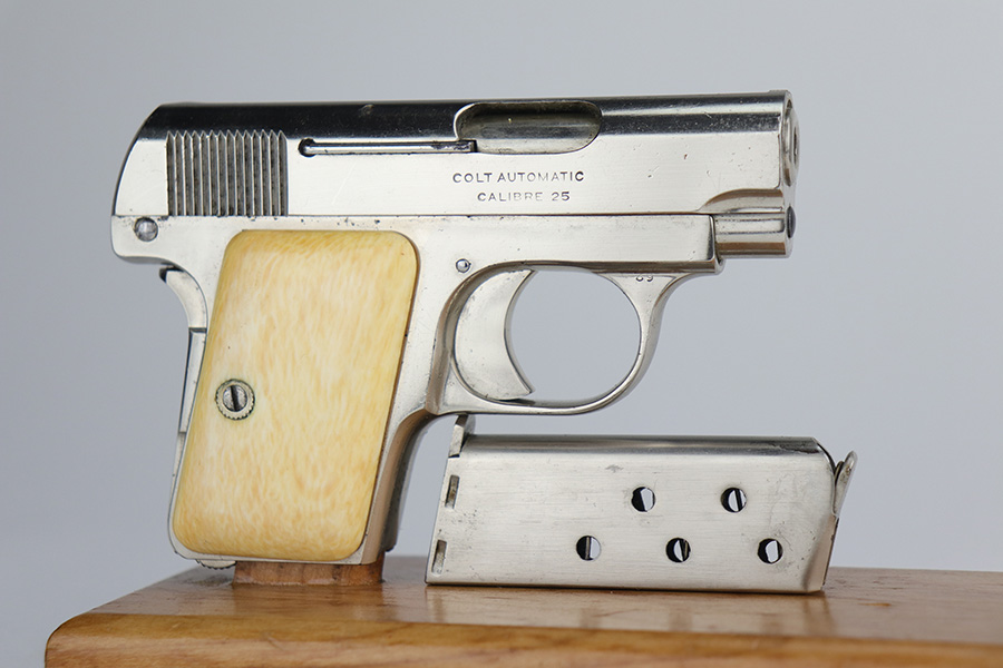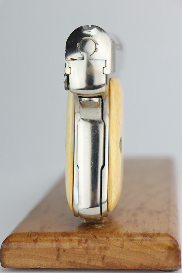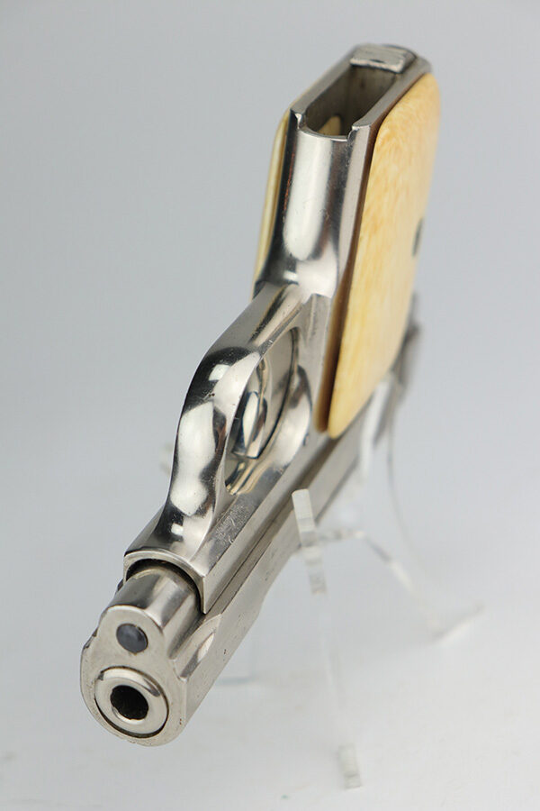 10/29/21 – This is an excellent example of Colt Model 1908 Vest Pocket pistol, chambered in .25 ACP and manufactured in 1921. It is all matching and comes as a rig with a nice period-correct tan leather holster, one proper nickel-plated magazine, and beautiful ivory grips. The gun has retained about 98% of its factory-nickeled finish. There is just some flaking in the finish on the safety lever and a few tiny dings on the tang. Tiny micro-scratches in the nickel throughout. The bore is excellent with strong rifling.