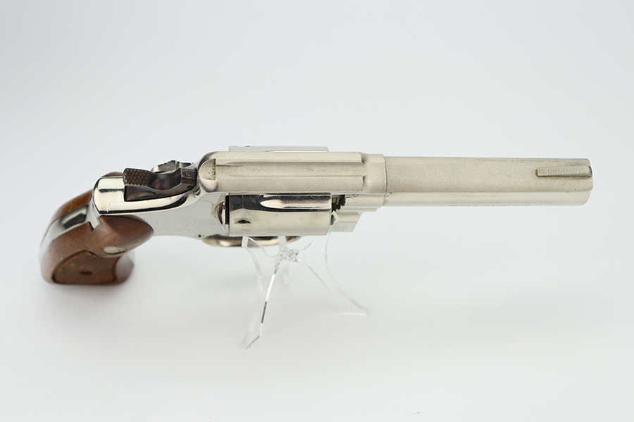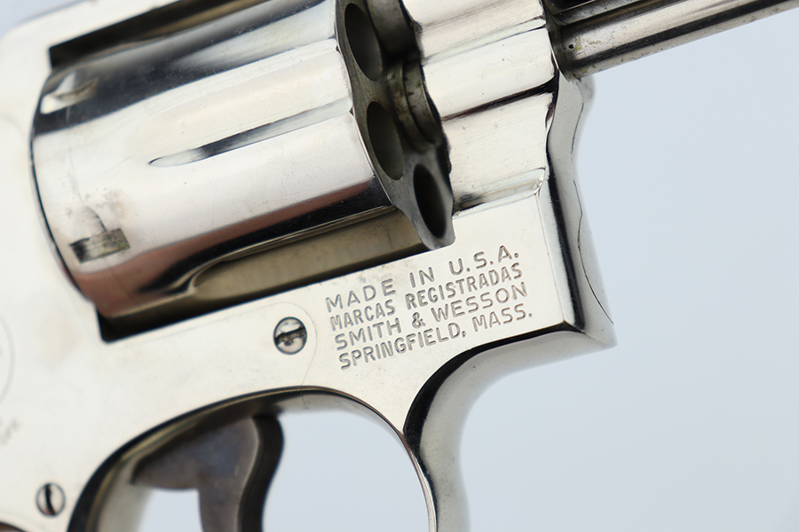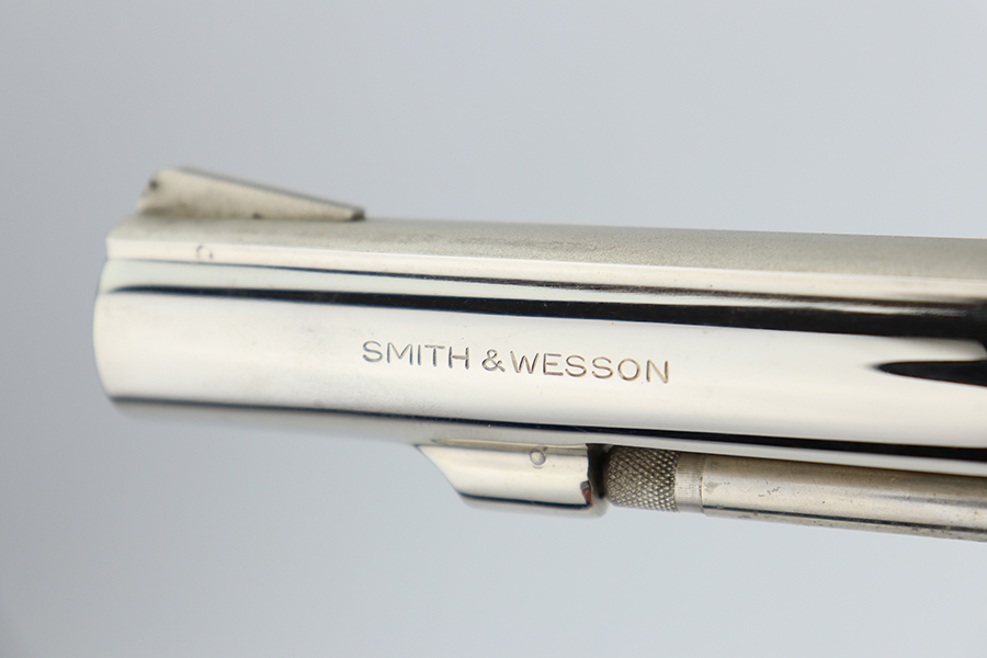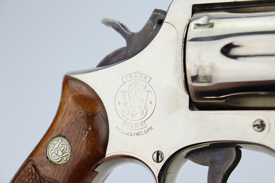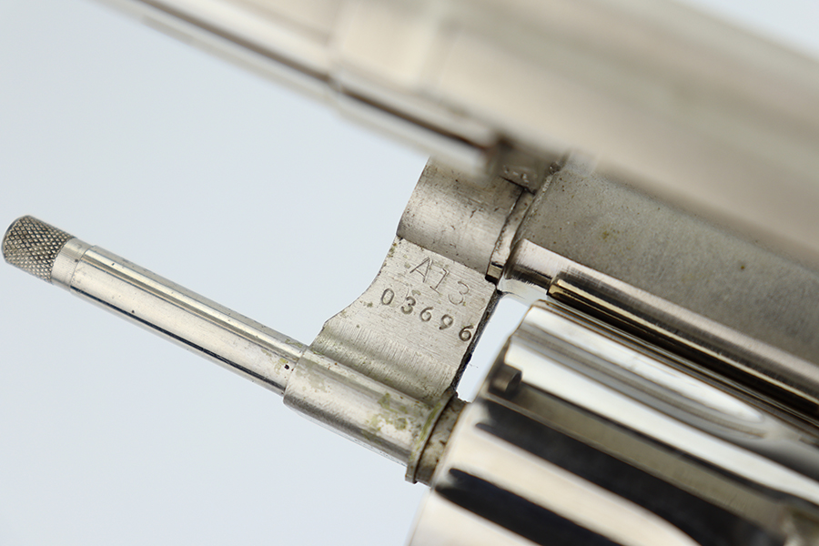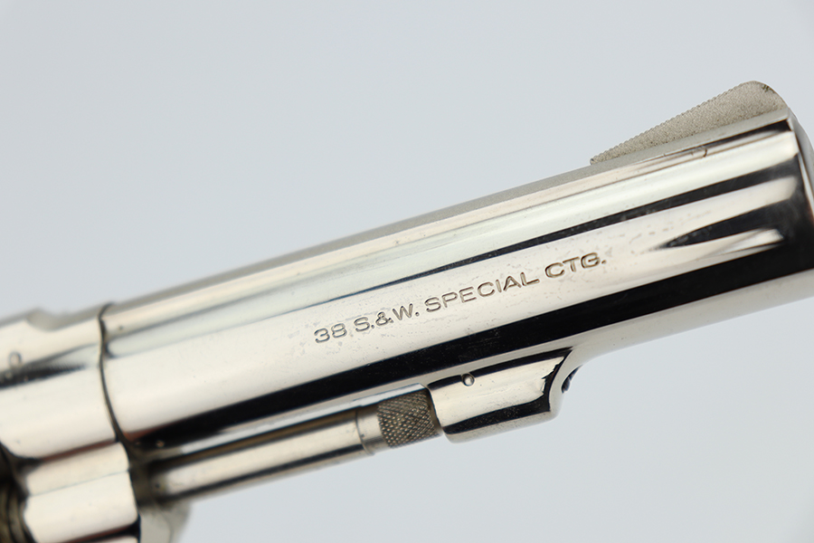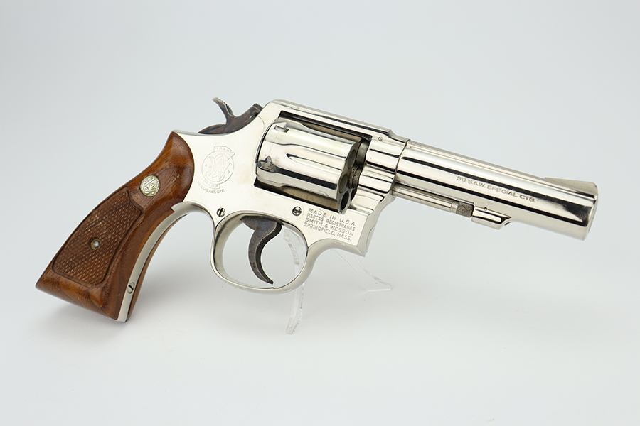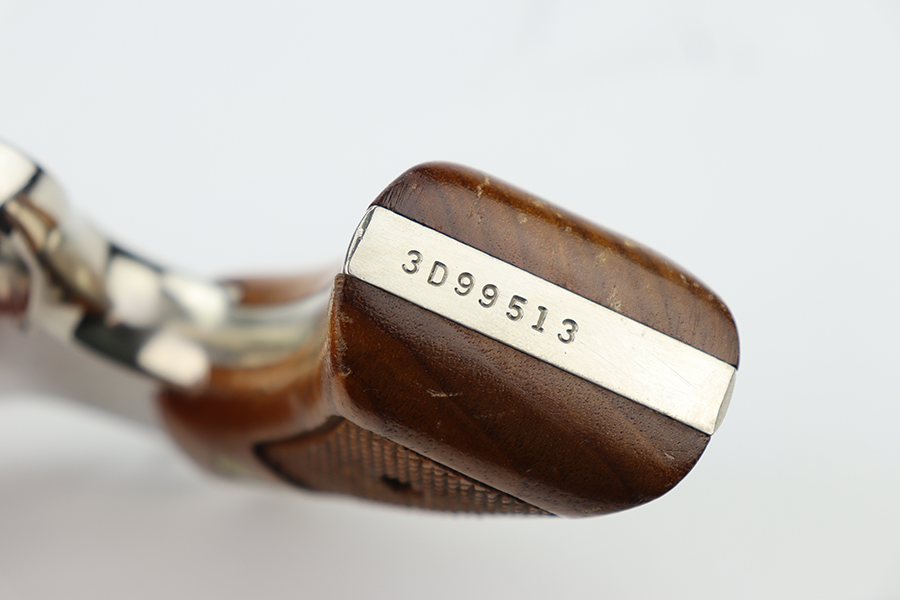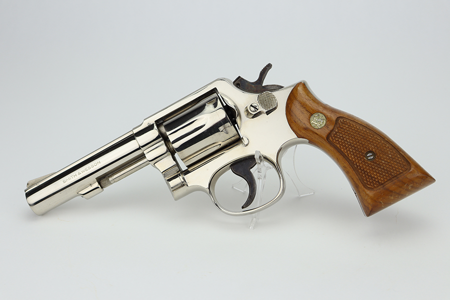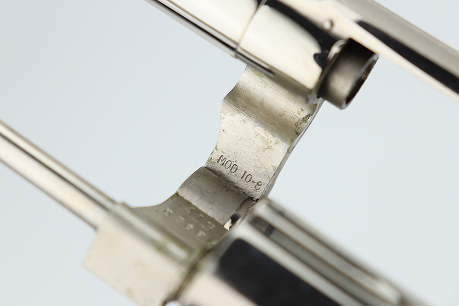 6/11/24 – This is a minty example of a Smith & Wesson Model 10-8 Revolver, manufactured around 1978. Chambered in .38 Special with 4 1/8″ heavy barrel. Excellent nickel finish with very little sign of wear, just some micro-scratches in the finish here and there. Case-hardening on the hammer and trigger. Fitted with checkered Walnut grips. Mint bore.