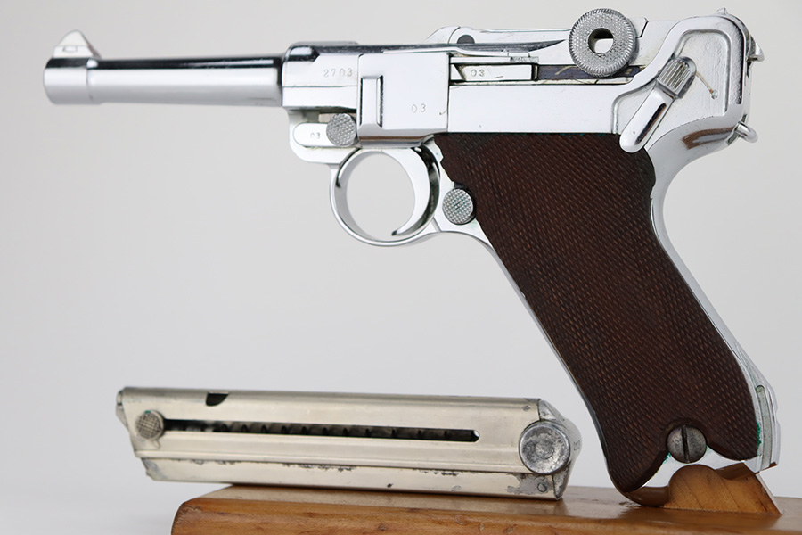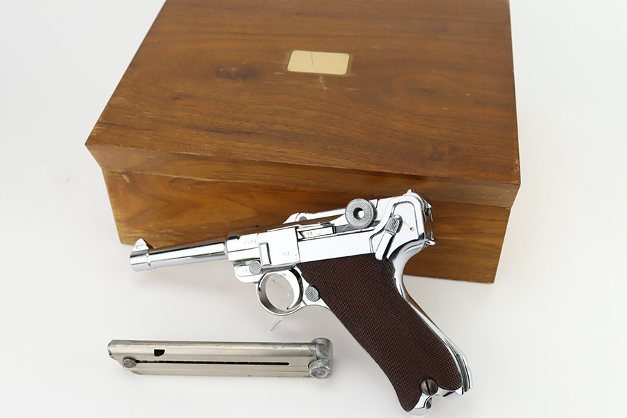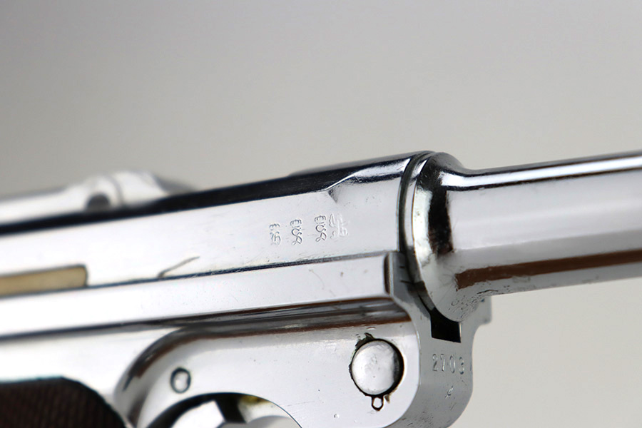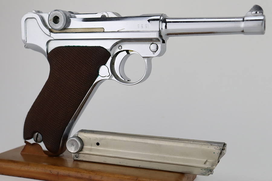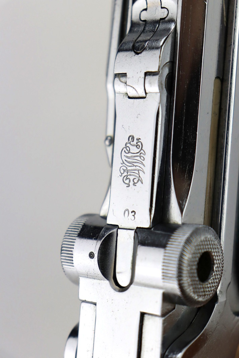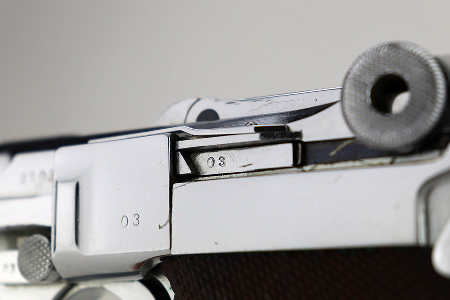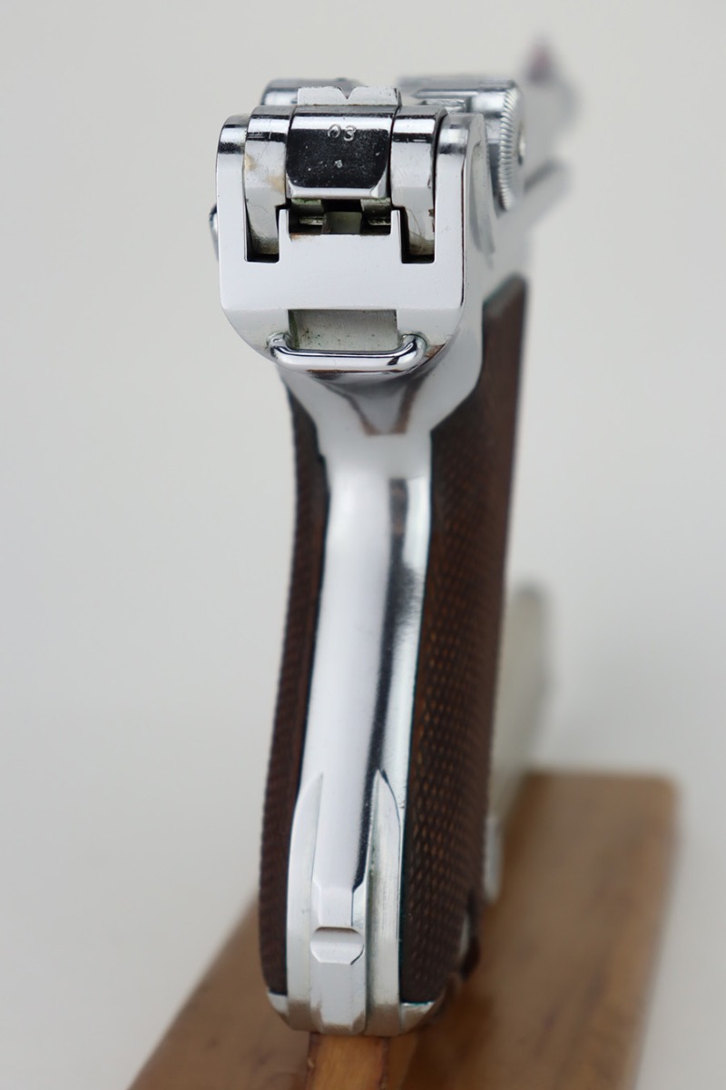 12/11/23 – This is a DWM Luger originally issued to the Imperial German police in 1915. All matching with the proper Imperial military acceptance proofs. It was later diverted to the police, as evidenced by the added police sear safety and matching-numbered police magazine. The gun has been completely nickel-plated and comes with a custom wood display case. The nickeled finish is excellent with just some areas of very light pin-pricking under the finish here and there. Fitted with minty matching-numbered wood grips. The bore has pretty good rifling, but there is pin-pricking throughout.