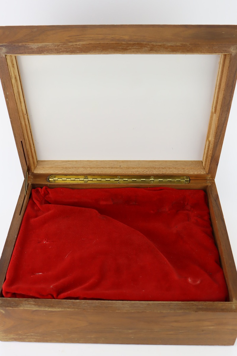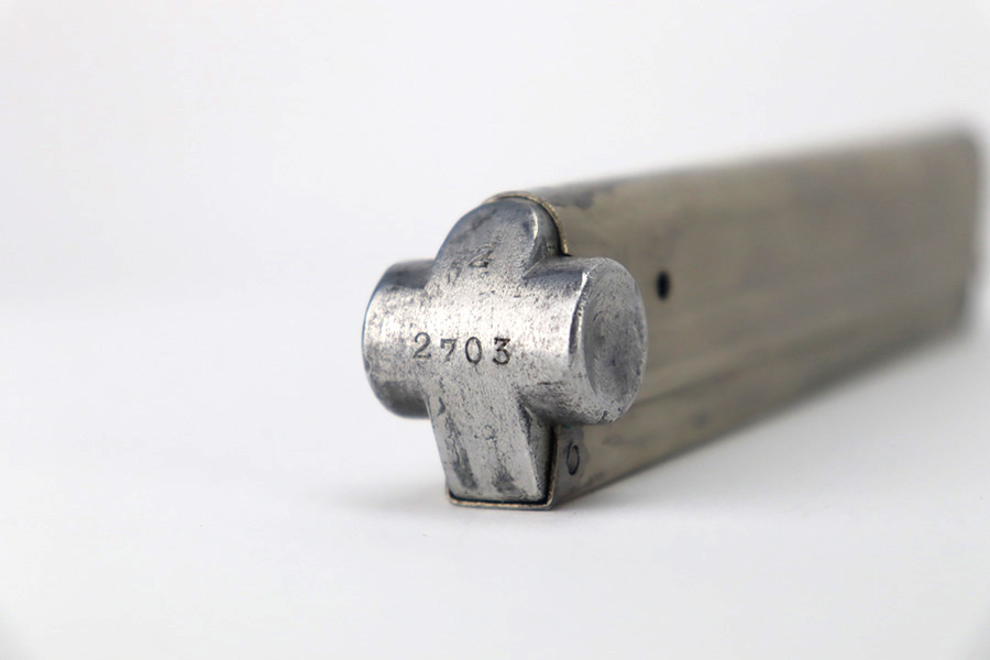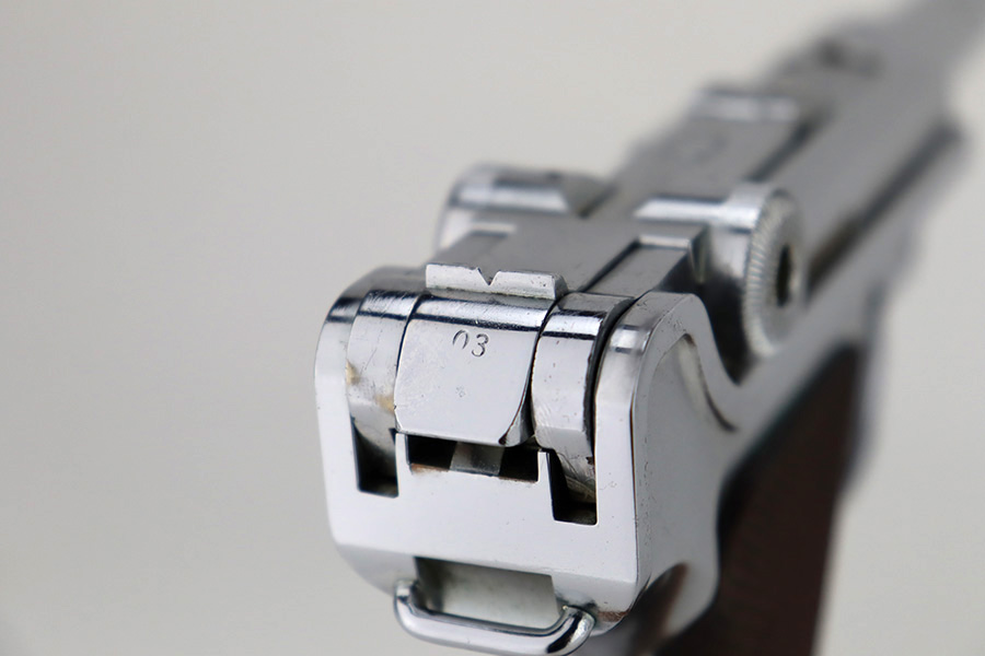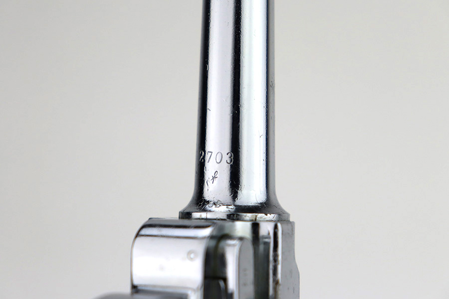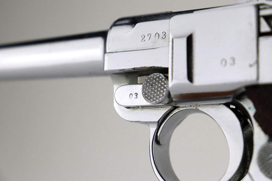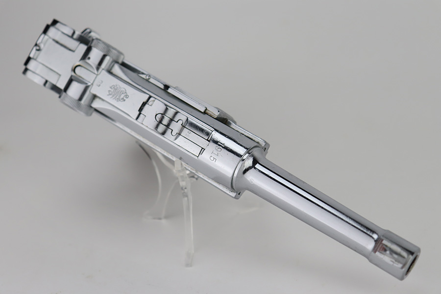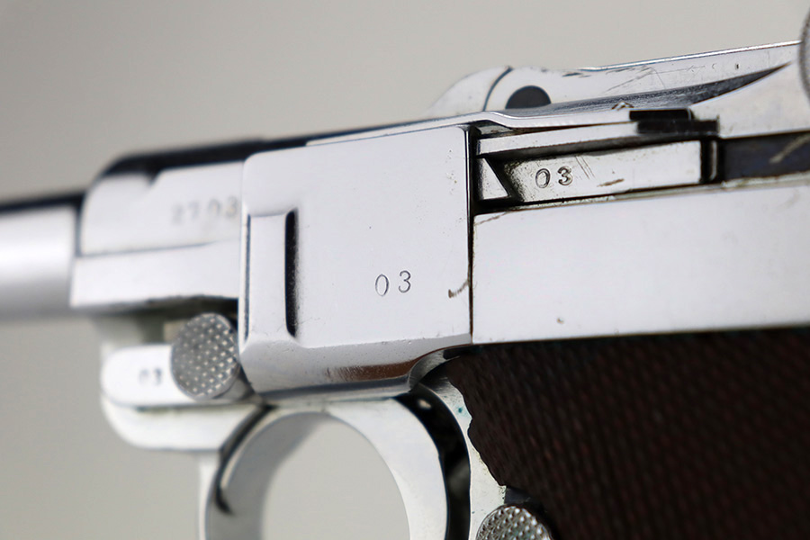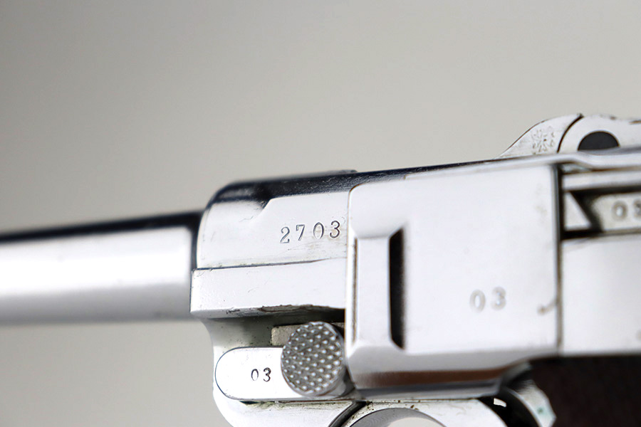 12/11/23 – This is a DWM Luger originally issued to the Imperial German police in 1915. All matching with the proper Imperial military acceptance proofs. It was later diverted to the police, as evidenced by the added police sear safety and matching-numbered police magazine. The gun has been completely nickel-plated and comes with a custom wood display case. The nickeled finish is excellent with just some areas of very light pin-pricking under the finish here and there. Fitted with minty matching-numbered wood grips. The bore has pretty good rifling, but there is pin-pricking throughout.