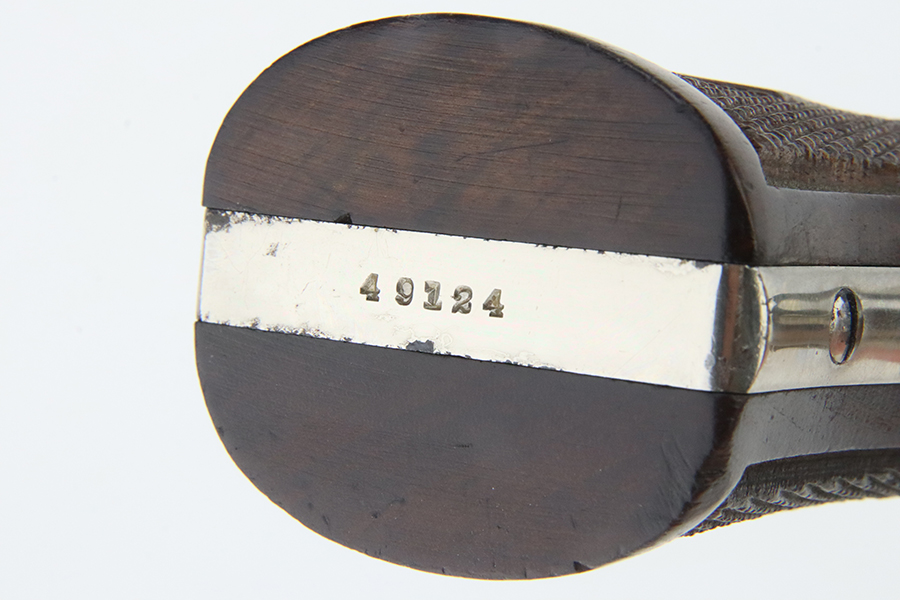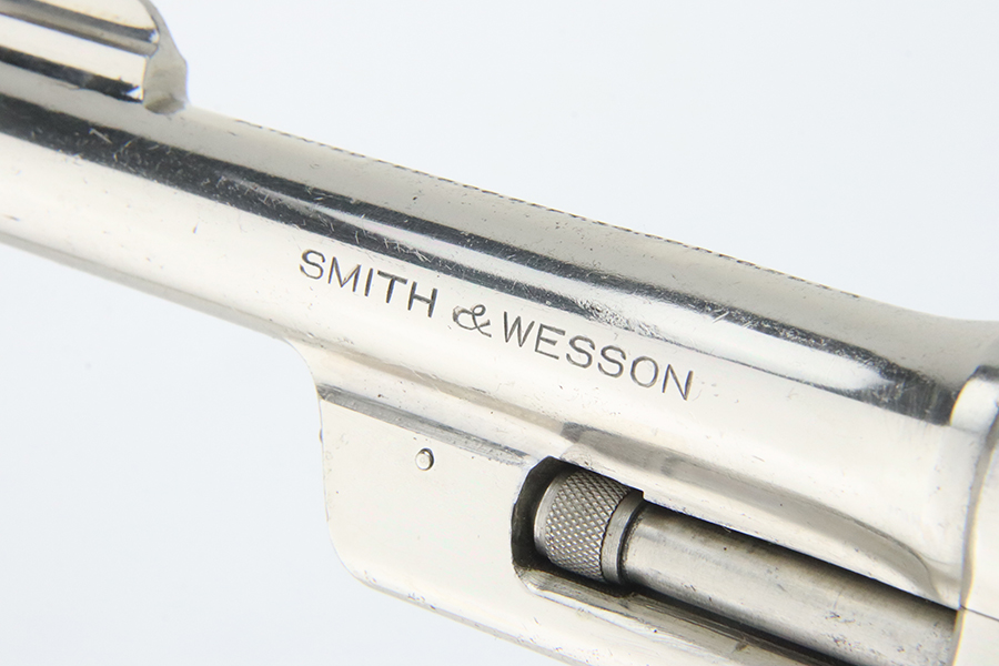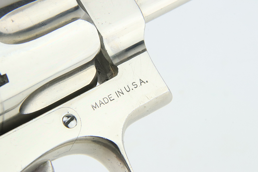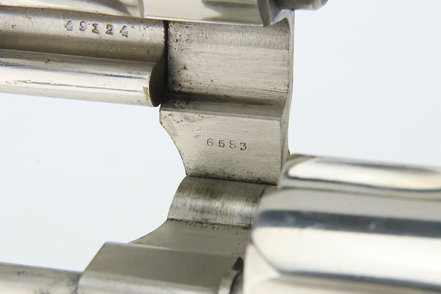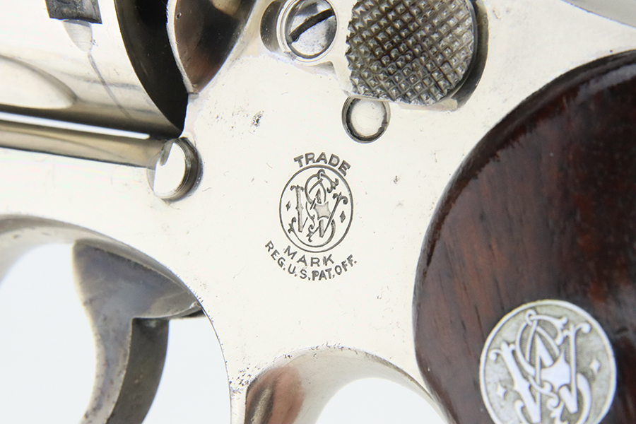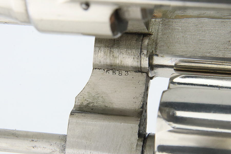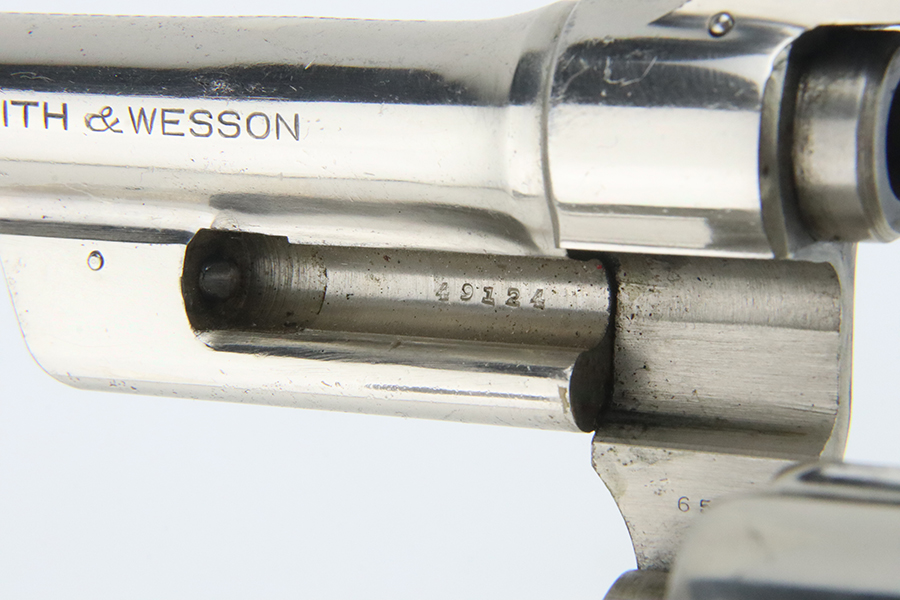 2/1/24 – This is a factory-nickeled Smith & Wesson .38/44 Heavy Duty Revolver from 1936. According to the included factory letter, it was shipped from the factory to Shapleigh Hardware Co in St Louis, MO on December 10th, 1936. It had a nickel finish, 5 inch barrel, and checkered Walnut grips. The original finish rates about 97% with light flaking around the butt of the frame and a few tiny flakes on the right side of the frame. Micro-scratches in the finish here and there. The bore is mostly shiny with strong rifling, but the barrel is noticeably bulged. Grips fit well but right grip is mismatched.