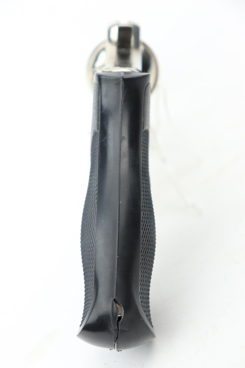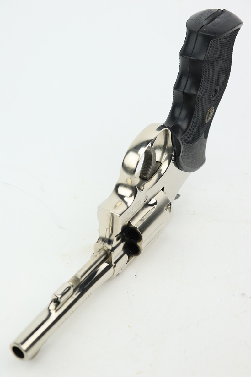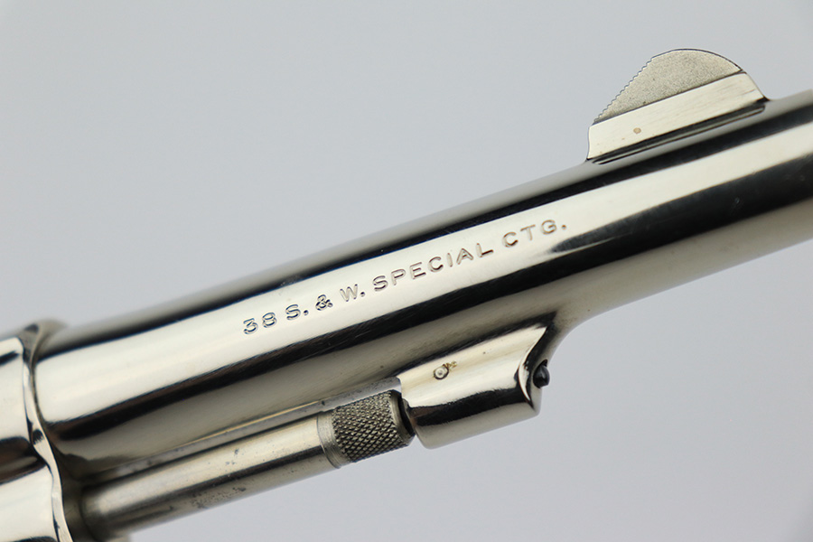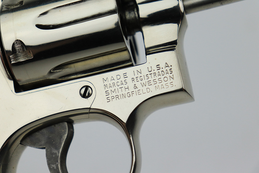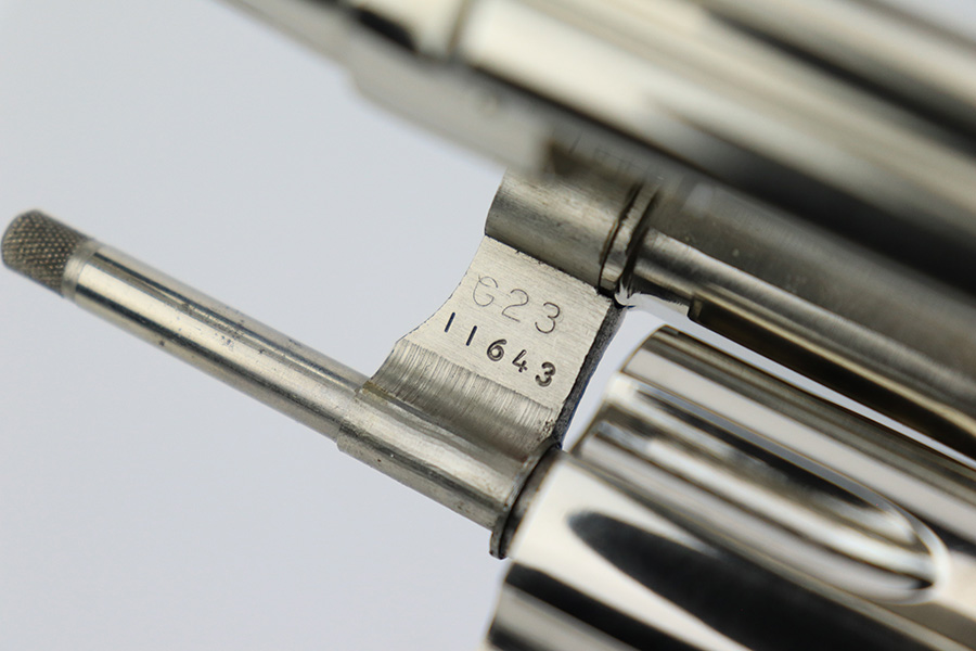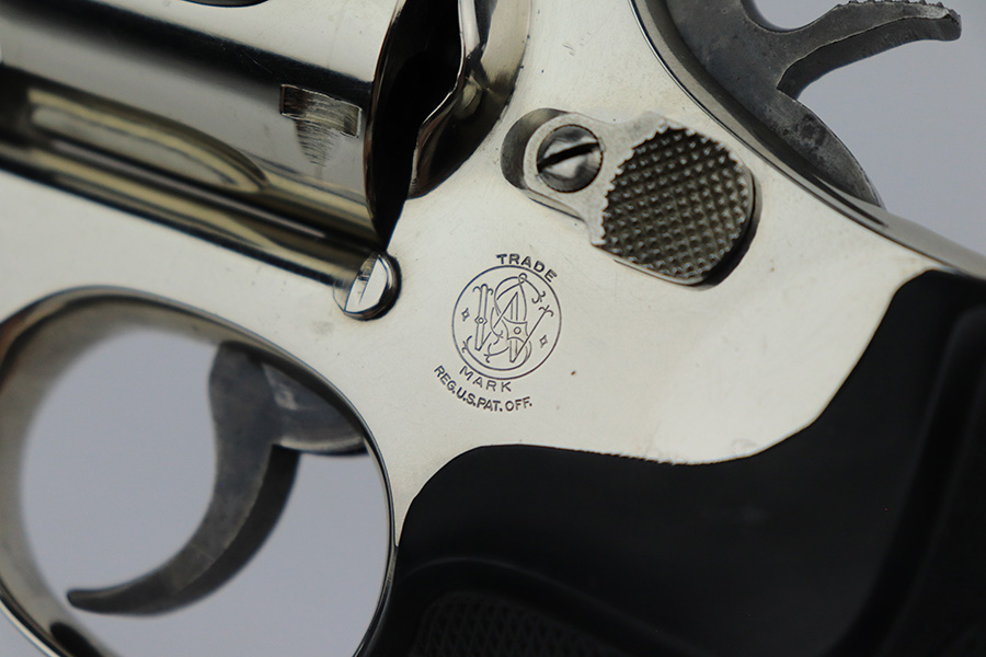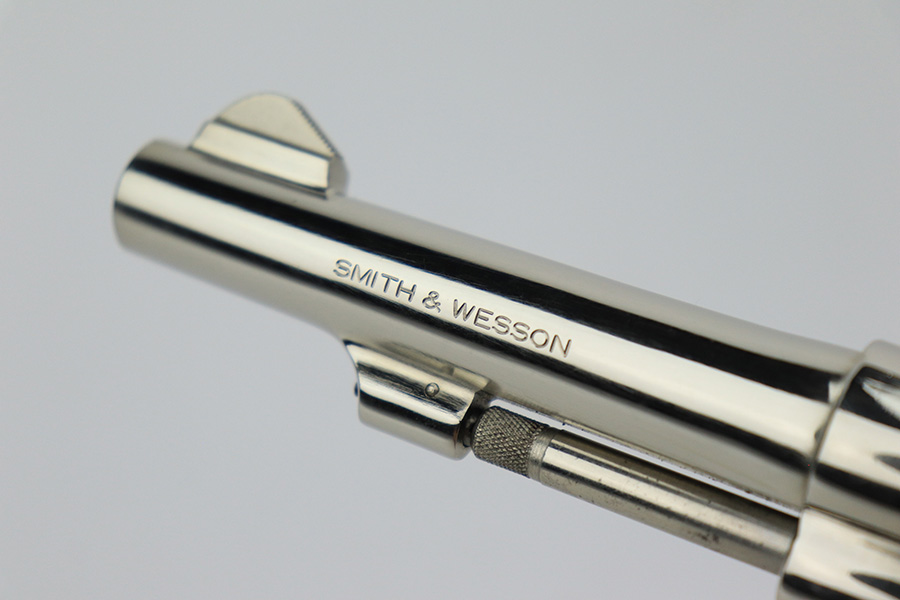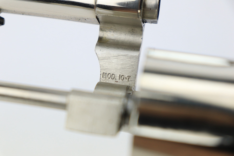 5/19/23 – This is a minty example of a Smith & Wesson Model 10-7 Revolver, manufactured in 1980 and chambered in .38 Special. 4″ barrel. The gun has a really nice nickel-plated finish and is equipped with a set of nice black rubber Pachmayr grips. There is very little sign of wear or use on the gun overall – just some micro-scratches in the finish and some tiny handling marks here and there. Very light roll mark on the cylinder. Excellent case-hardening on the hammer and trigger. The bore is like-new. The cylinder is tight, and the action is very smooth.