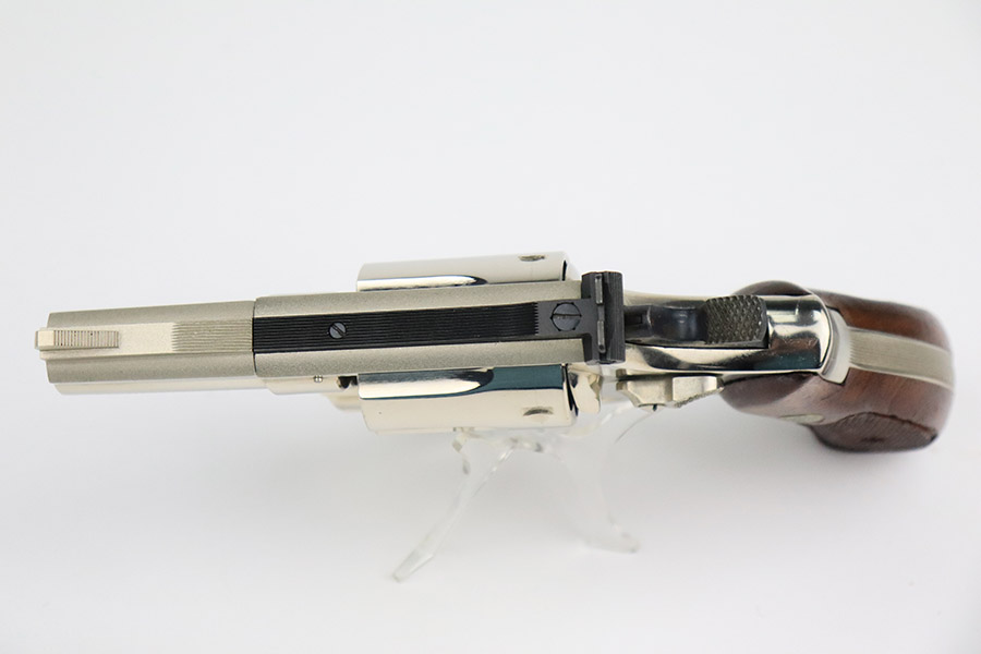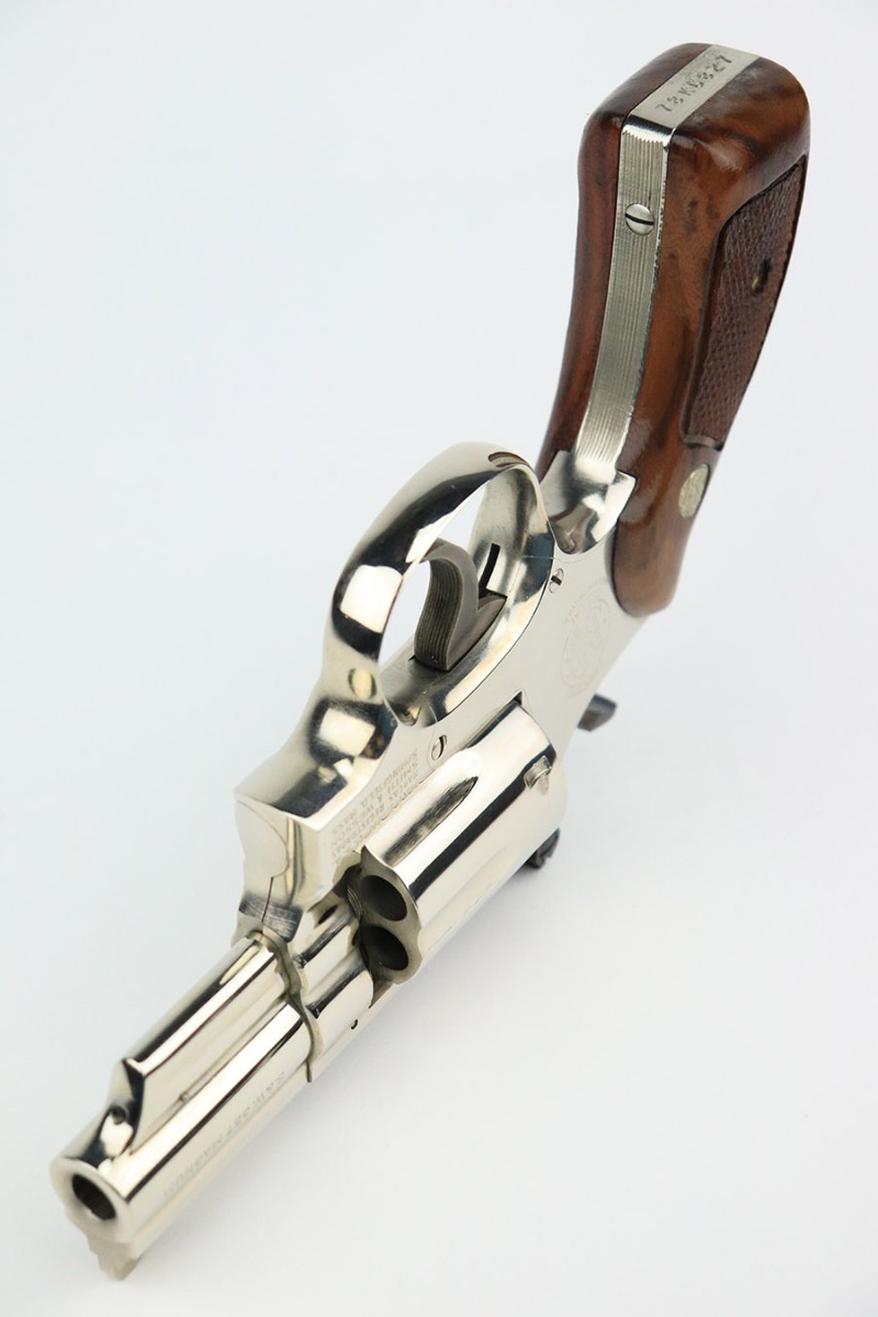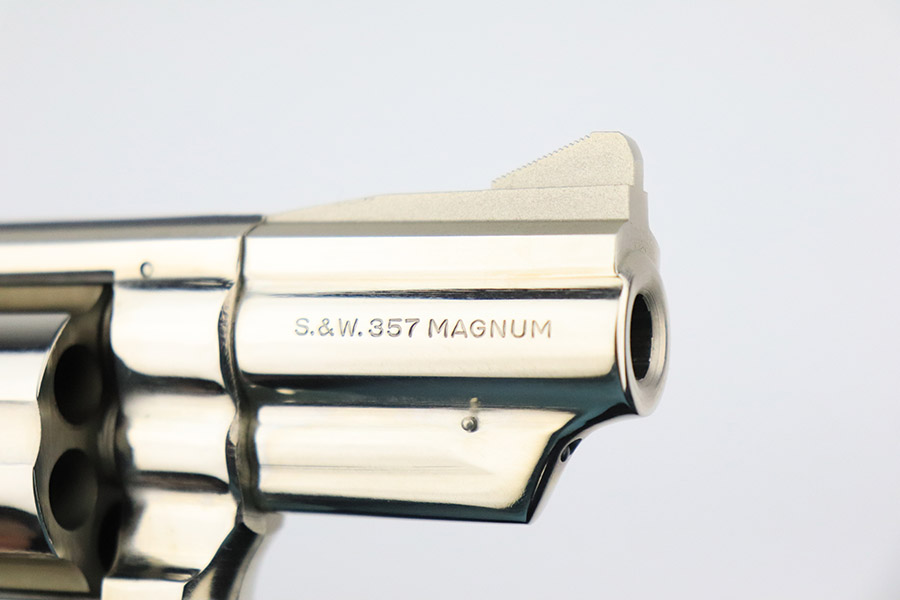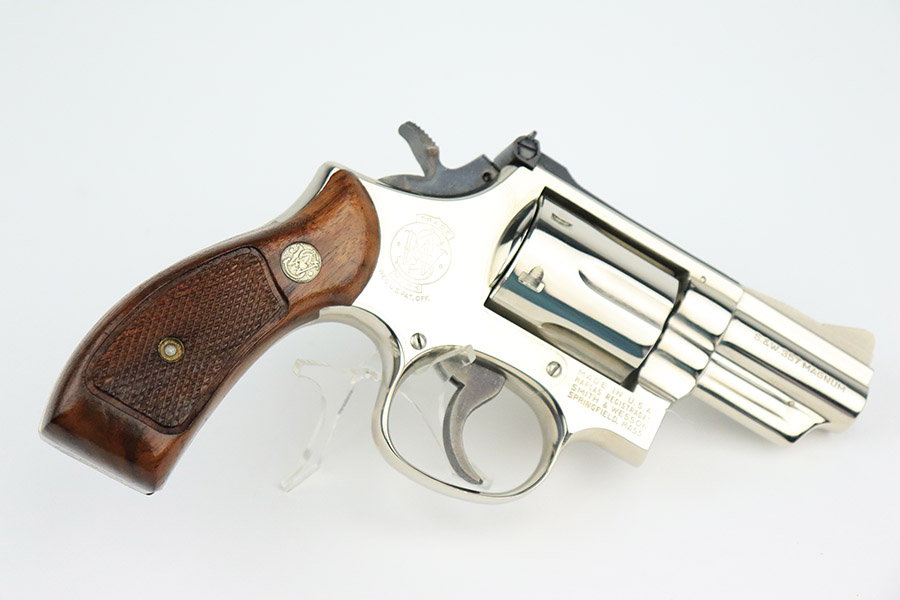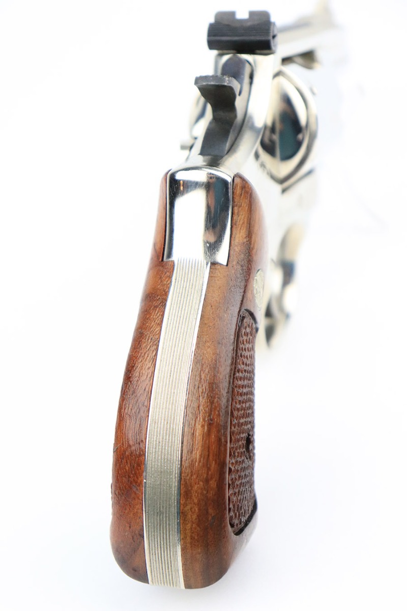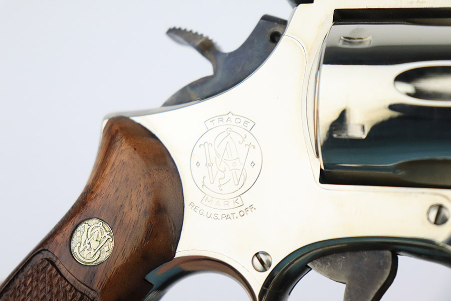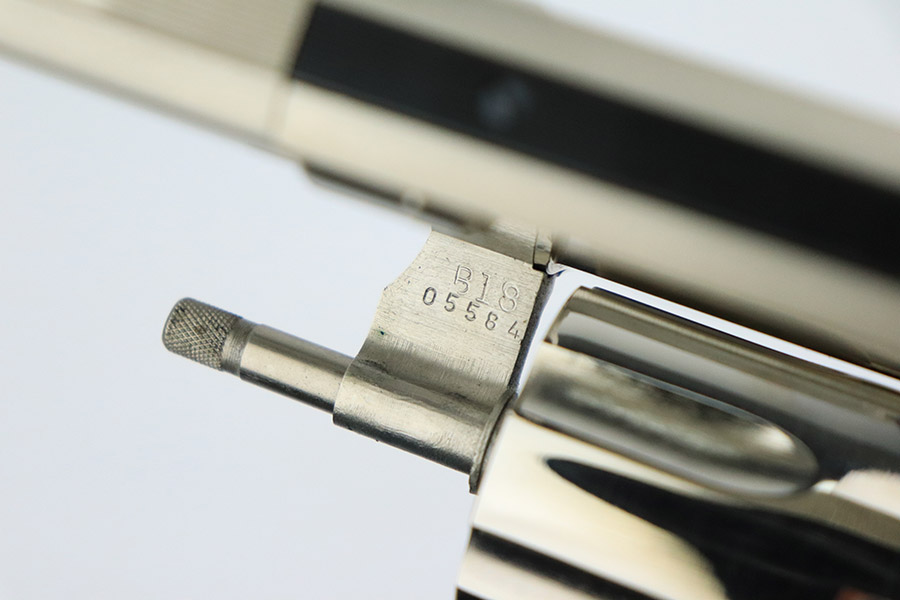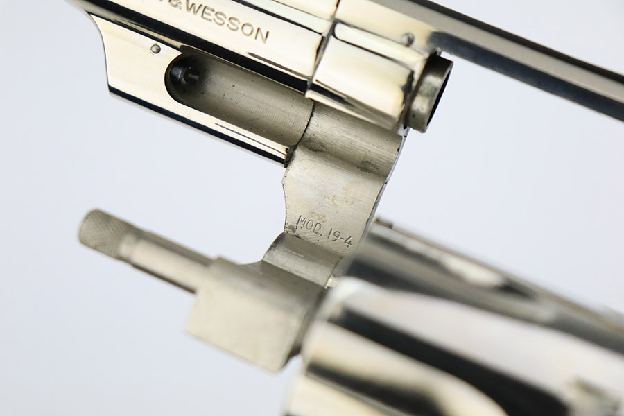 11/2/22 – This is a beautiful example of a Smith & Wesson Model 19-4, manufactured in 1980 and chambered in .357 Magnum. It has a 2.5″ barrel and a really nice nickeled finish. It is in near-mint condition, retaining essentially all of its finish. There are just a few very light handling marks here and there and a very faint roll mark on the cylinder. Excellent case-hardening on the hammer and trigger. Comes with minty hand-checkered Walnut grips. Mint bore. The cylinder is tight, and the action is smooth.