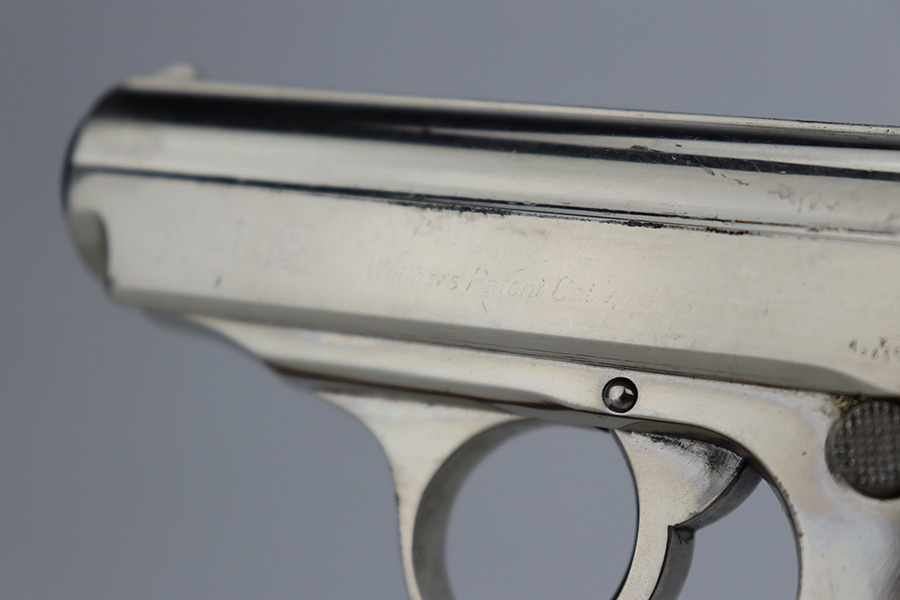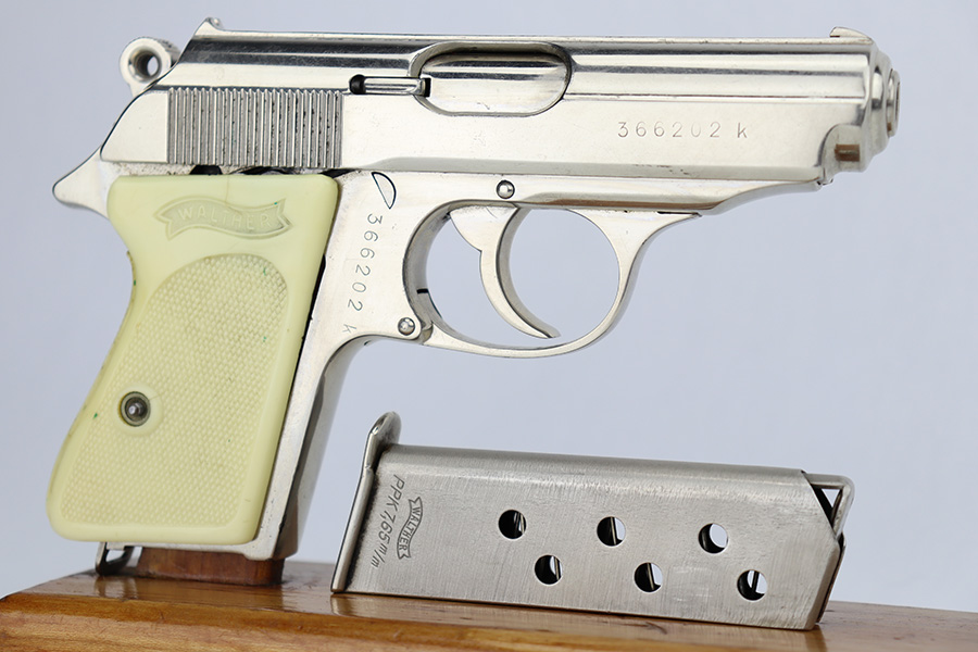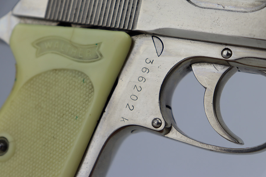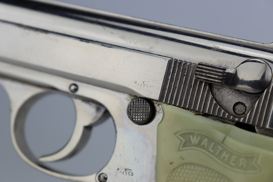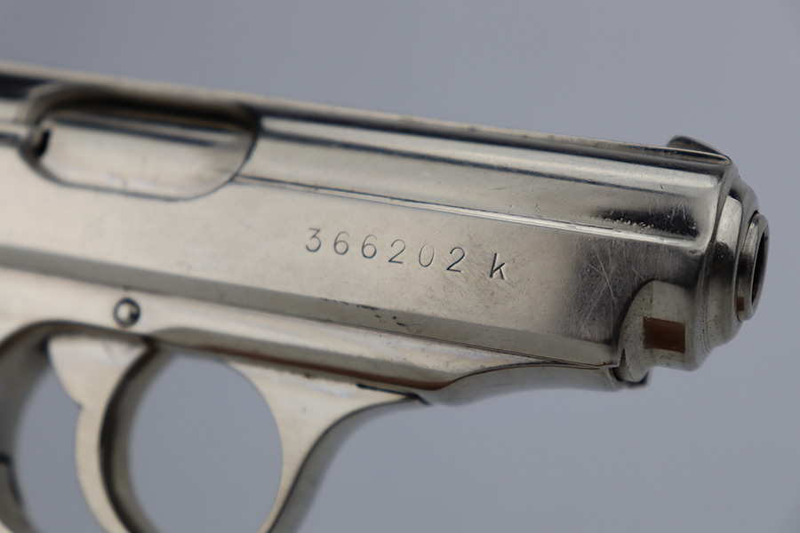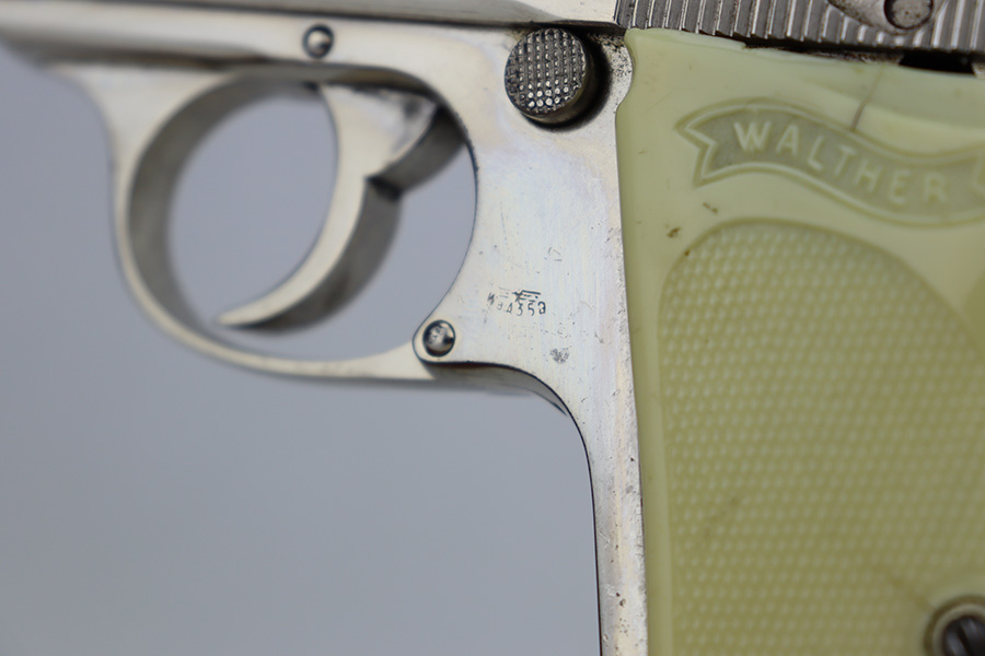 6/14/23 – This is a very nice example of a Walther PPK issued to the Nazi military in 1942. It is all matching and has the proper “Waffen 359” military acceptance proofs on the left side of the slide and frame. This one has been completely nickel-plated, this was commonly done by the GI’s who brought these treasures home. It has retained essentially all of its nickel-plating, but there are micro-scratches in the finish throughout (this is typical). Fitted with a post-war white plastic grip – a few tiny hairline cracks. Comes with a nickel-plated wartime magazine. Mint bore.