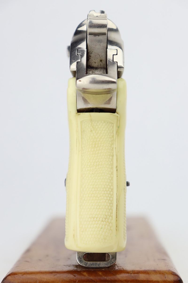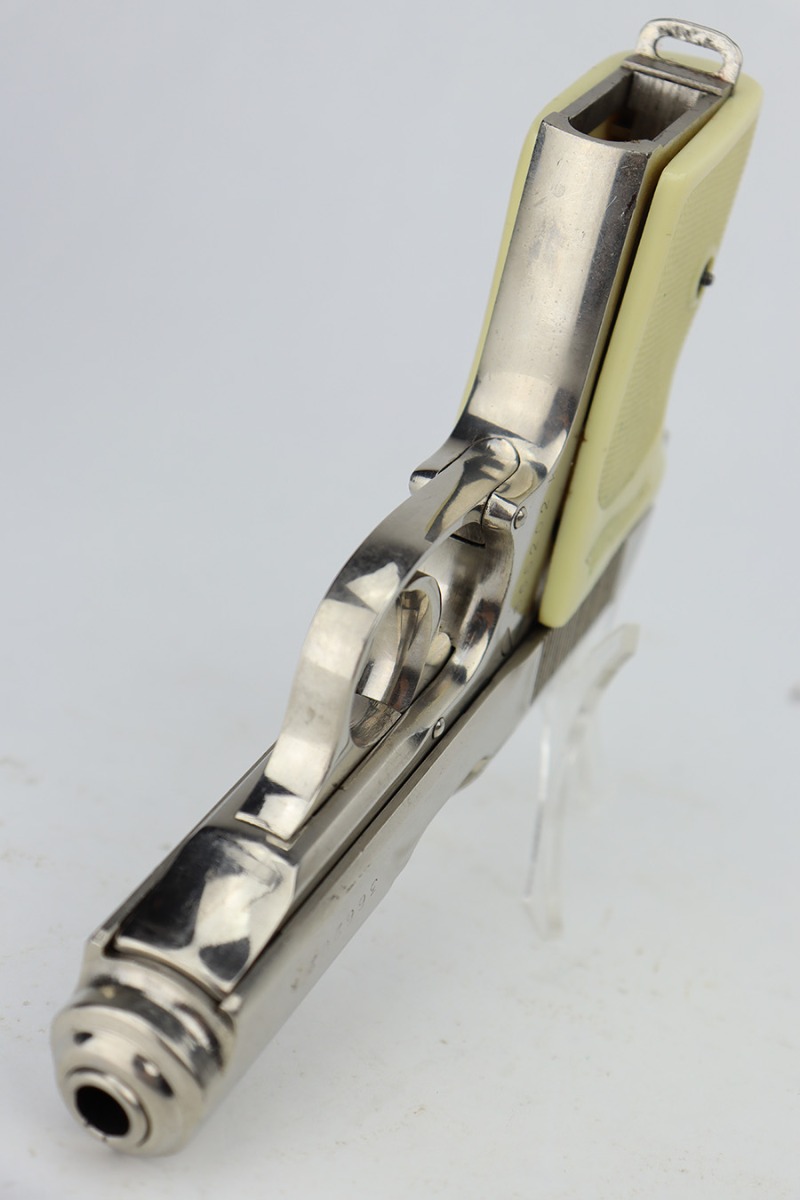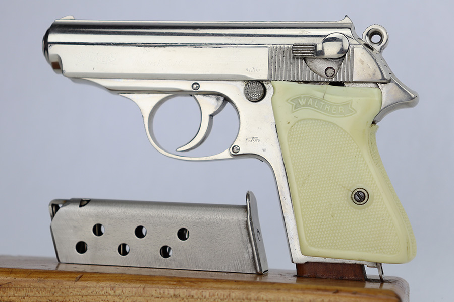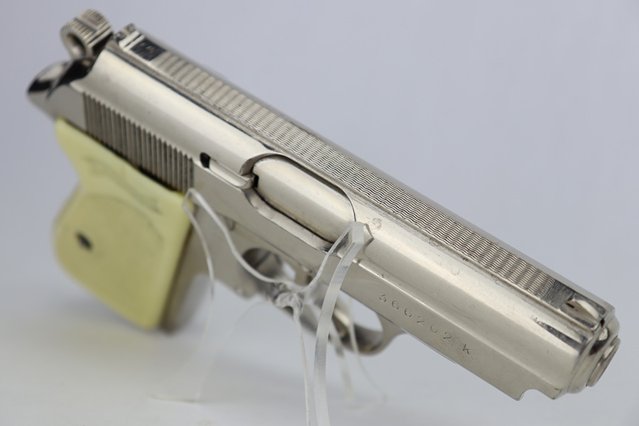 6/14/23 – This is a very nice example of a Walther PPK issued to the Nazi military in 1942. It is all matching and has the proper “Waffen 359” military acceptance proofs on the left side of the slide and frame. This one has been completely nickel-plated, this was commonly done by the GI’s who brought these treasures home. It has retained essentially all of its nickel-plating, but there are micro-scratches in the finish throughout (this is typical). Fitted with a post-war white plastic grip – a few tiny hairline cracks. Comes with a nickel-plated wartime magazine. Mint bore.