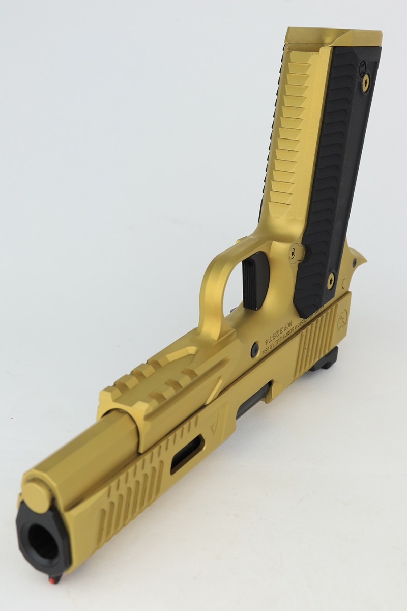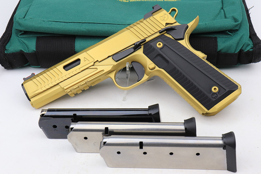 1/19/23 – This is a Nighthawk Custom 1911 Agent 2 in mint condition. Our consignor bought each of the set of Nighthawks being listed in new condition and never fired any of them, so only very minor handling wear if any wear at all. Each of the Nighthawks being offered are priced considerably under MSRP, and this one was originally $4949. This one features the Gold TiN finish with a few parts finished with black nitride. It comes with accessory rail, fiber optic front sight, Heine fixed rear sight, G10 carbon fiber grips and more. Comes with the original carry case which has two spare mags, manual, etc. From the Nighthawk website: “Meticulously crafted and designed down to the last detail, the Nighthawk Custom Agent 2 is the next evolution of collaboration between Nighthawk Custom and Agency Arms. Utilizing the “One Gun, One Gunsmith” approach, Nighthawk Custom has taken the 1911 platform to an all-new level of innovation with the same hand-crafted quality and beauty. The Agent 2 was meticulously designed down to every detail to push the boundaries of the 1911 in both form and function. Combining gunsmith craftsmanship with modern machining techniques, the resulting pistol speaks for itself. As a truly unique and stunning firearm, the Agent 2 stands as the epitome of innovation.”