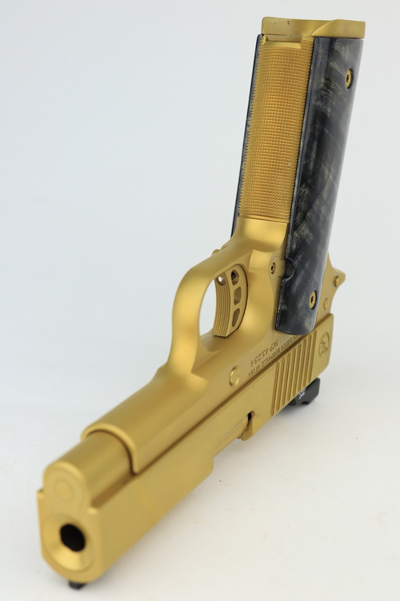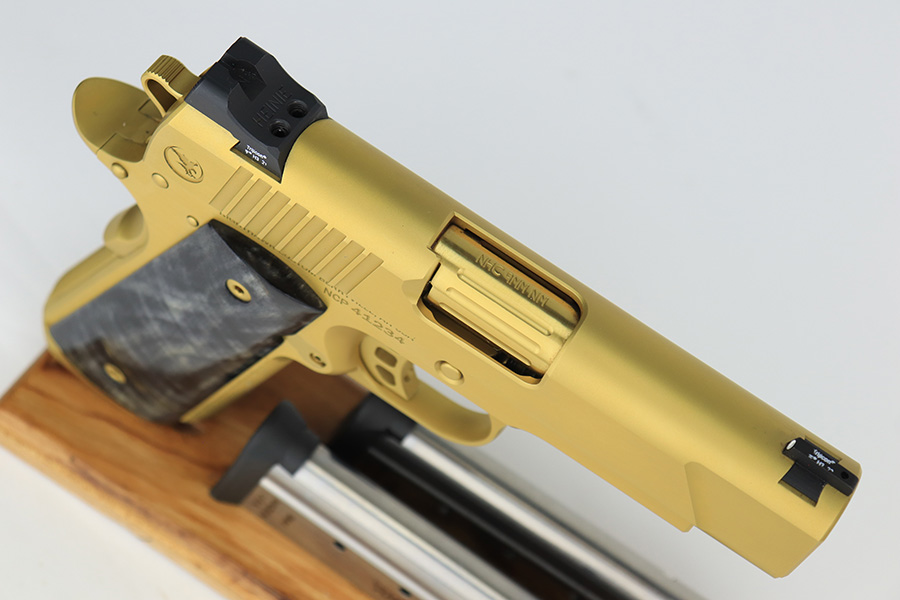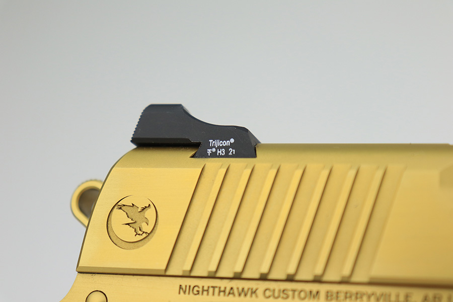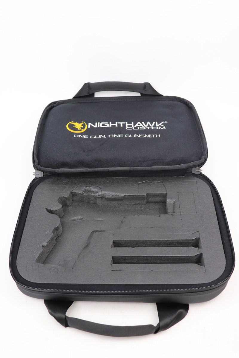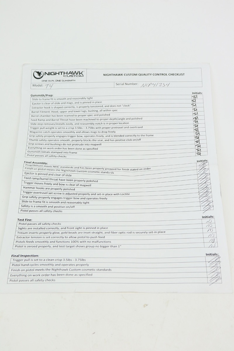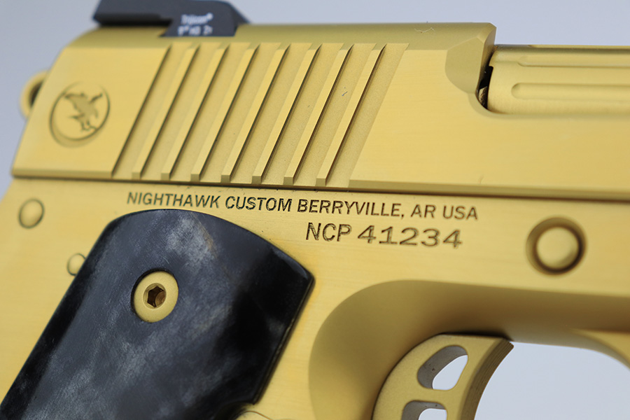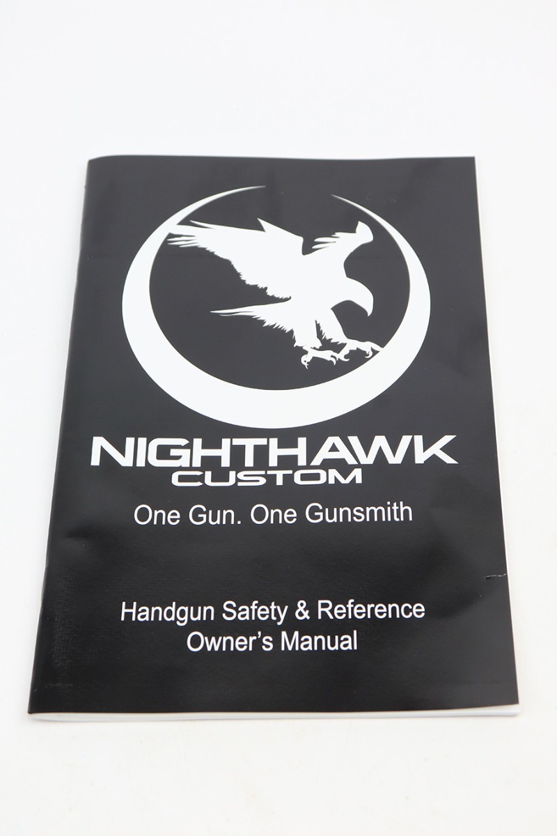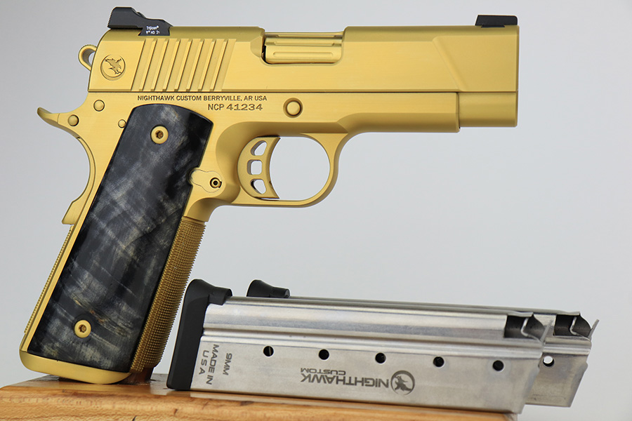 2/7/23 – This is a Nighthawk Custom 1911 T4 customer Commander model in mint condition. Our consignor bought each of the set of Nighthawks being listed in new condition and never fired any of them, so only very minor handling wear if any wear at all. Each of the Nighthawks being offered are priced considerably under MSRP, and this one had an MSRP of ~$5500. This one features the fully upgrade gold TiN finish throughout with fluted barrel hood, extended magwell and moonhawk engraving on slide. Comes with the original carry case which has a spare mag, manual, etc. This one also features custom upgraded grips but we have had trouble identifying which exact variation they are. From the Nighthawk website: “Designed for concealed carry, the T4 may be the best of both worlds when it comes to muzzle controllability and magazine capacity in a 1911 carry pistol. The T4 contains some of the most evolutionary features offered by the company. The T4 resembles the popular T3, but on a 3.8”-barrel platform. Reliability was the most important consideration when plans for the new pistol began, hence the 3.8″ Nighthawk Custom match grade barrel over the more popular, but less reliable, 3.5″ or shorter barrel. Additionally, the Nighthawk Everlast Recoil System was modified to fit into the smaller T4 frame, thus reducing felt recoil and decreasing recovery time between shots. The frame is thinned just like Nighthawk Custom’s popular Lady Hawk. The proprietary barrel is crowned and recessed with the slide. On the outside, the front of the slide has cuts designed to reduce weight. They taper in towards the crowned barrel, giving a unique look to the T4 like no other handgun produced by Nighthawk Custom. Grips are like the T3 and are thinned for less bulk.”