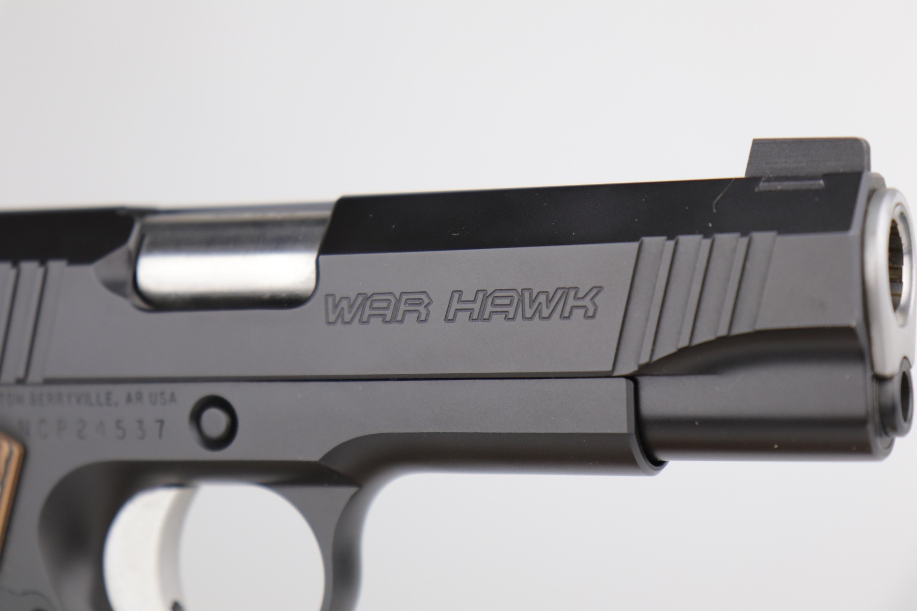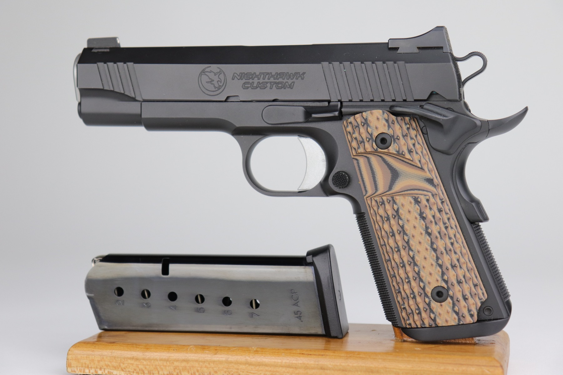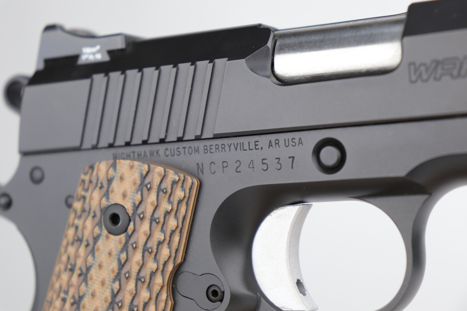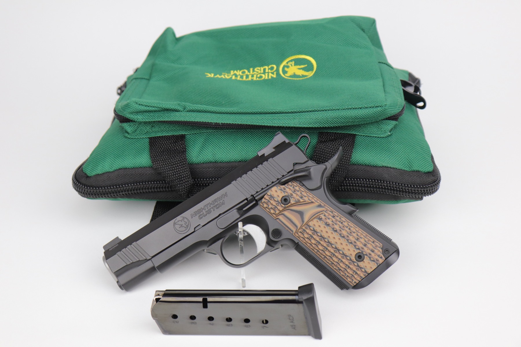 12/10/20 – This is a mint, like-new Nighthawk Custom War Hawk Compact Pistol, chambered in .45 ACP. 4.25″ barrel. It comes with the original soft range case, two 7-rd magazines, paperwork (including owners manual), tools, gun oil, and original test fire shell. The gun is fully functional and there are no apparent signs of wear. Mint bore. Here is a description from the website: In conjunction with the design of the full size War Hawk® Recon and War Hawk® Government, we developed a carry gun built to Nighthawk’s exacting standards, the War Hawk® Compact. This model has many of the same features as the full size model. The slide has the same unique multi-faceted slide top and top serrations that come to an arrow point as the full size model. The Compact model also incorporates the EVERLAST™ Recoil System that allows shooters to go over 10,000 rounds without a recoil spring change. This model is the first model to include our brand new, fully machined Officer size, one piece mainspring housing /magwell. This model comes standard with Heinie Slant Pro night rear sight and a Tritium front sight well as a solid aluminum match-grade trigger. The War Hawk Compact is not only a beautiful gun, but a great choice for a daily carry weapon.