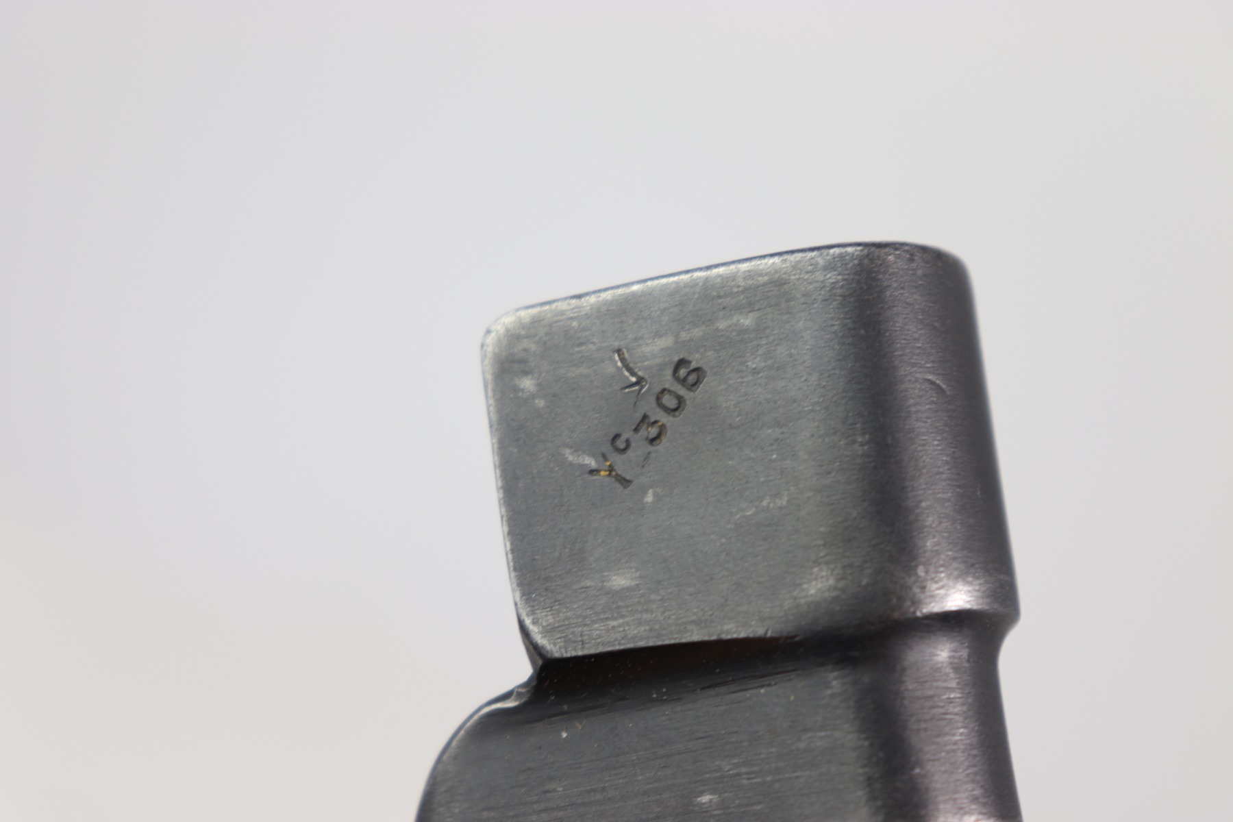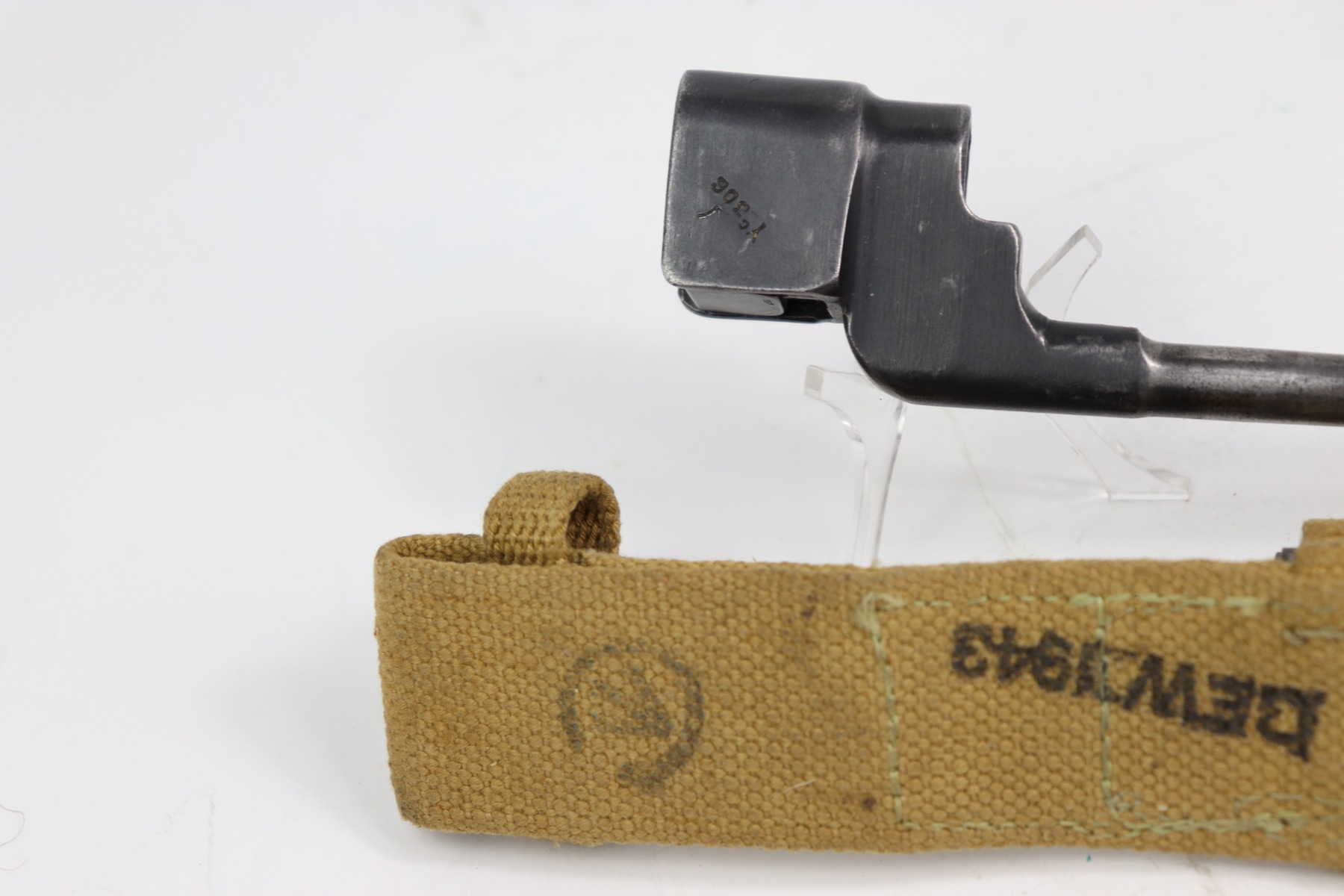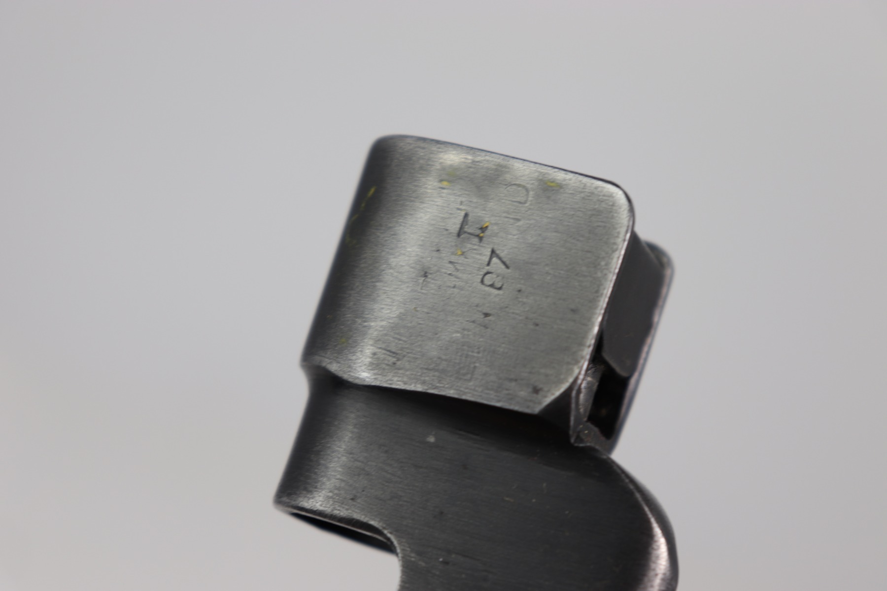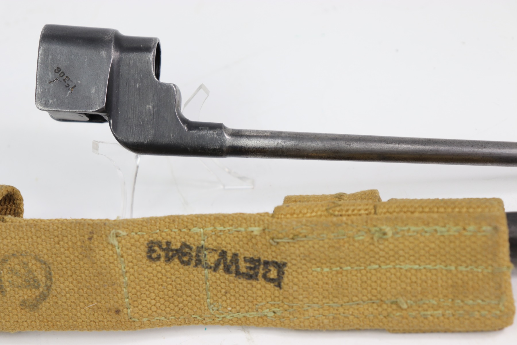 9/17/24 – This is an original Enfield No. 4 Mk II bayonet. The bayonet is in great condition with some faint / buffed out markings on the base. The spiked blade is in excellent condition. Comes with an original metal scabbard and canvas frog that’s ink stamped and dated 1943 as shown in photo’s.