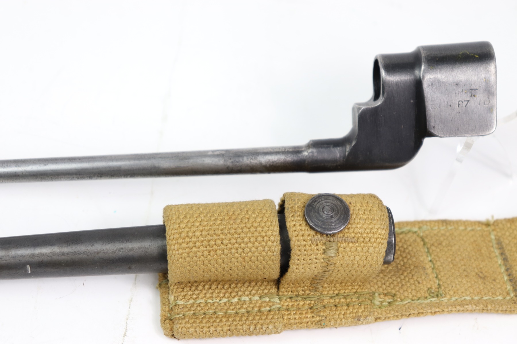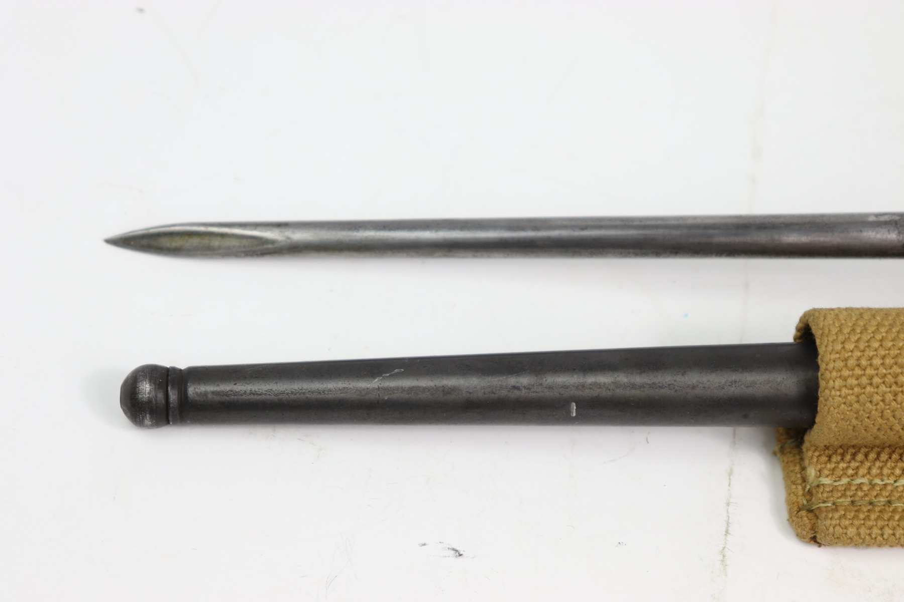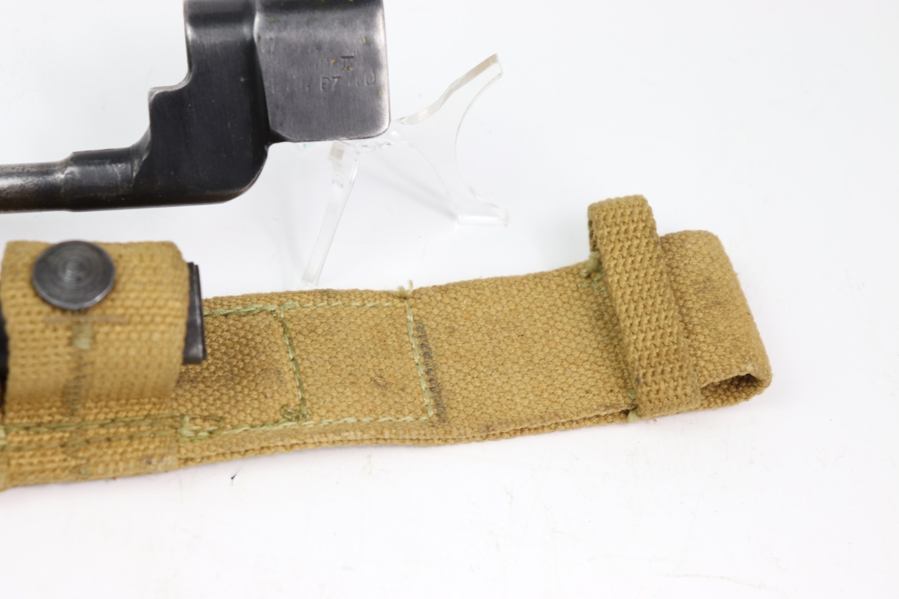 9/17/24 – This is an original Enfield No. 4 Mk II bayonet. The bayonet is in great condition with some faint / buffed out markings on the base. The spiked blade is in excellent condition. Comes with an original metal scabbard and canvas frog that’s ink stamped and dated 1943 as shown in photo’s.