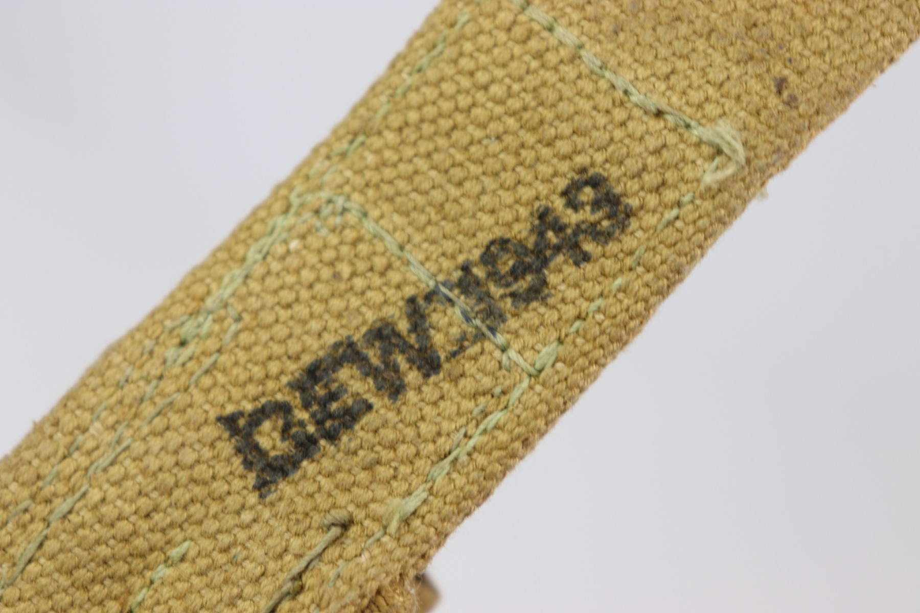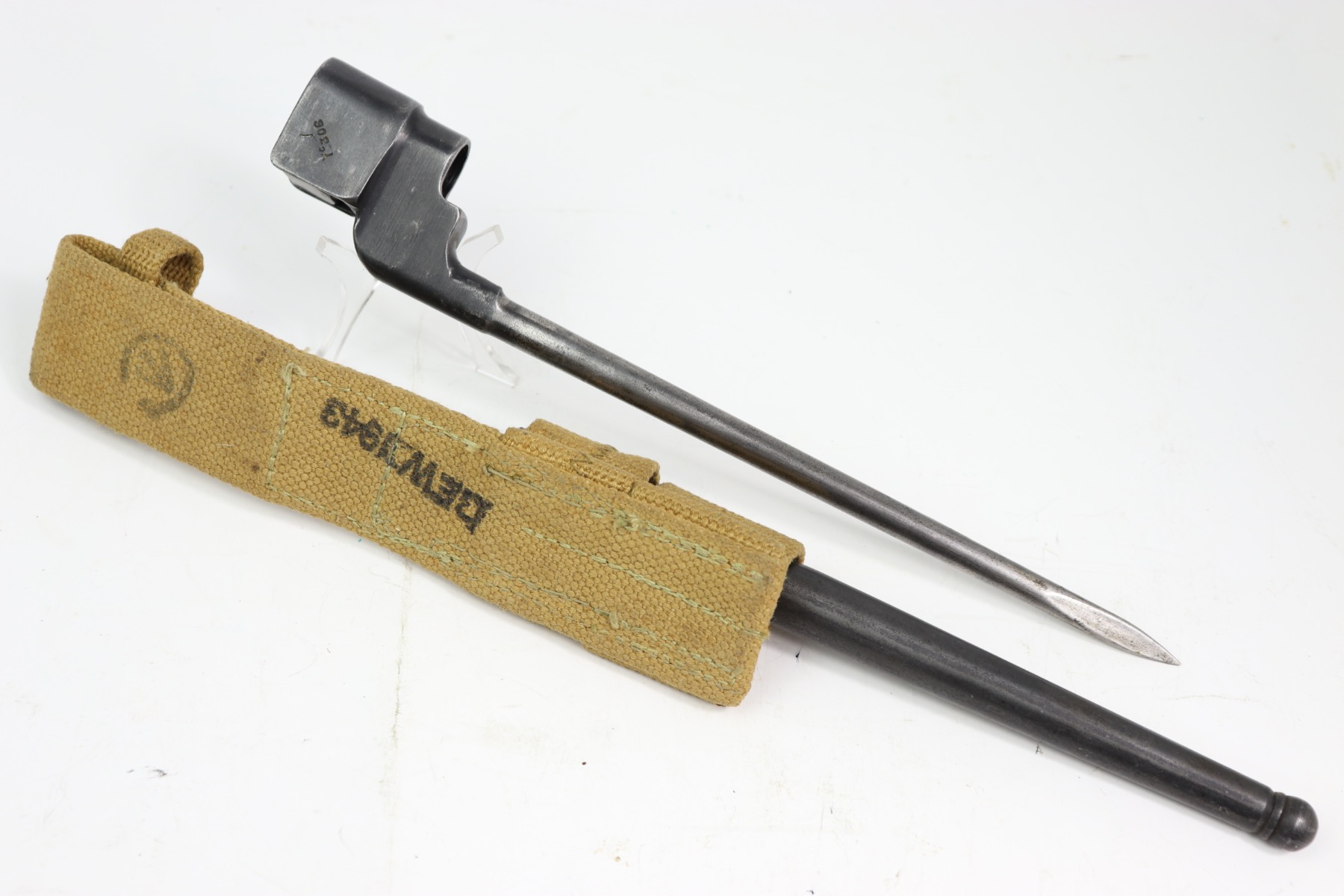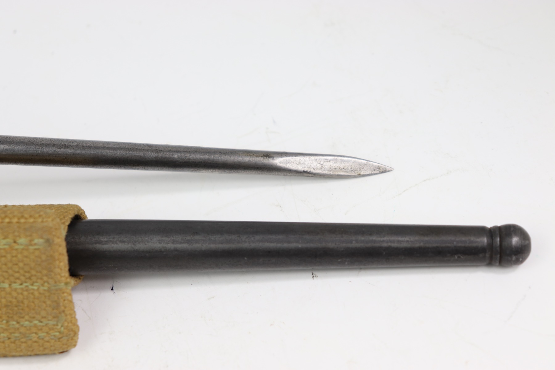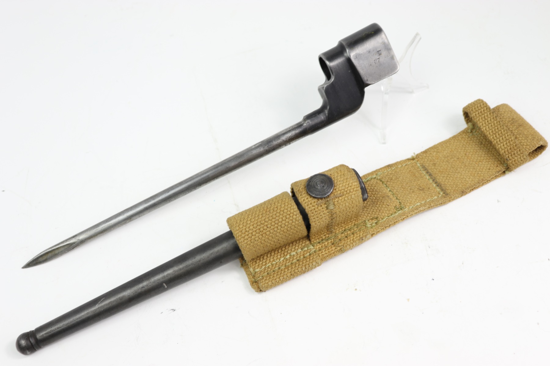 9/17/24 – This is an original Enfield No. 4 Mk II bayonet. The bayonet is in great condition with some faint / buffed out markings on the base. The spiked blade is in excellent condition. Comes with an original metal scabbard and canvas frog that’s ink stamped and dated 1943 as shown in photo’s.
