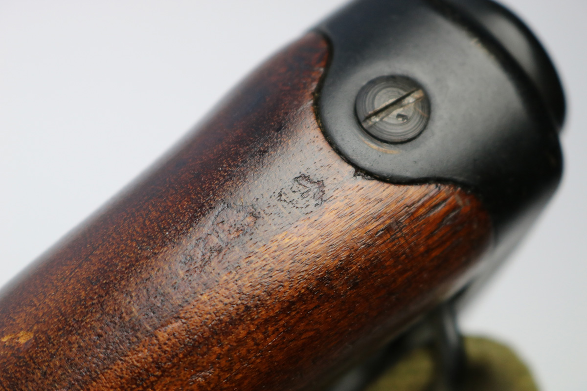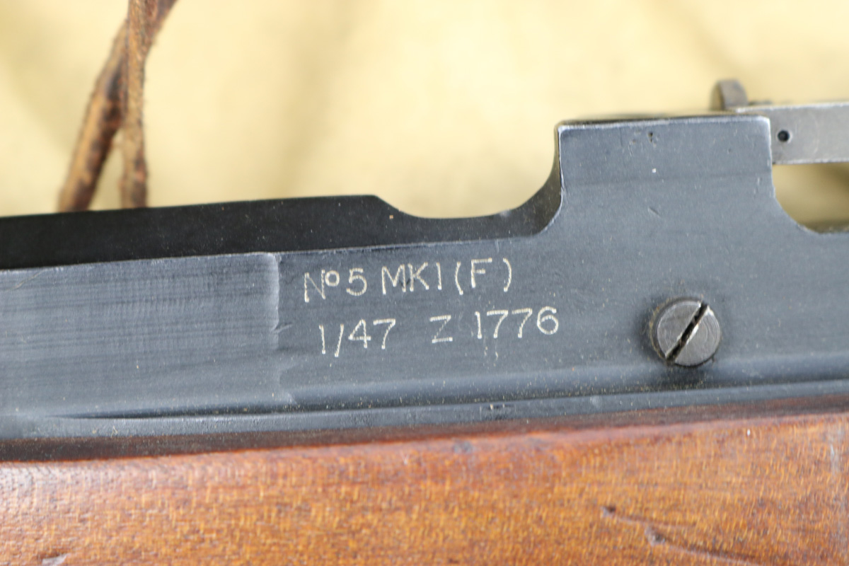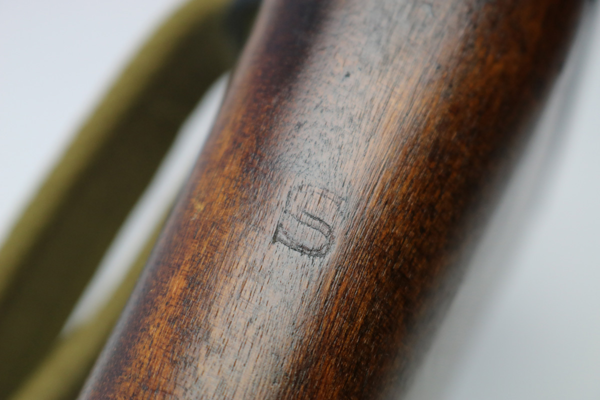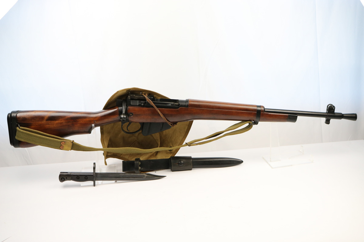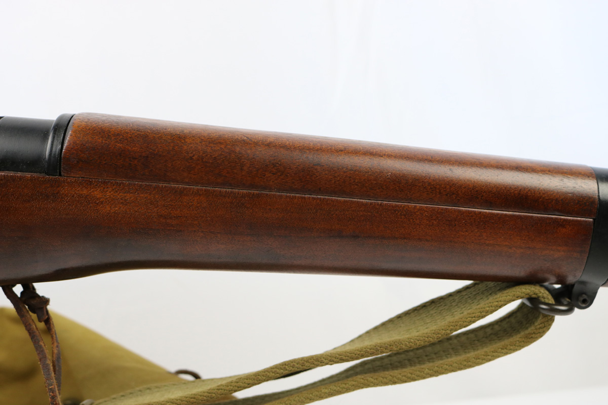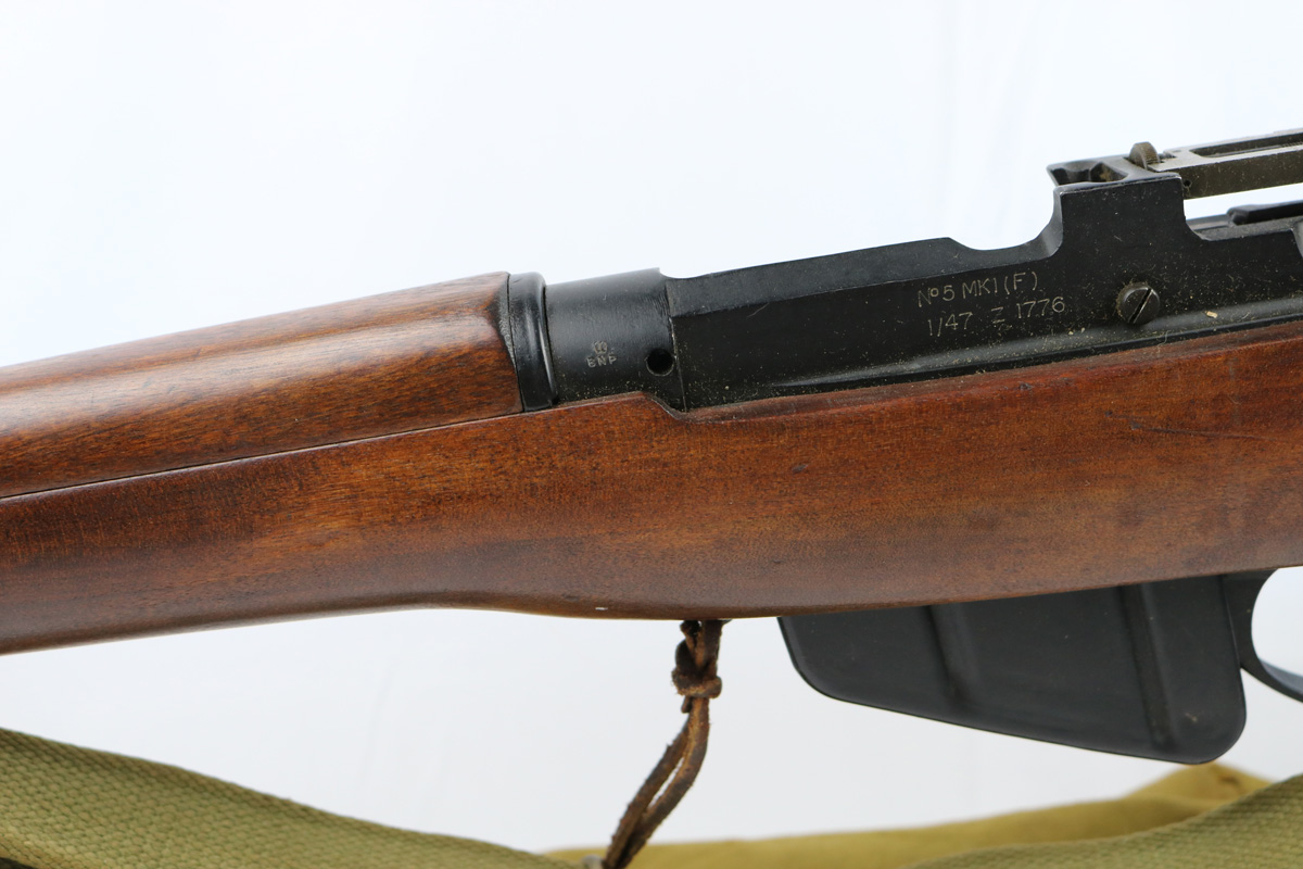 6/14/18 – This is an original 1947 production Enfield No. 5 MK I Jungle Carbine. Comes complete with an original bayonet with scabbard & leather frog. Also has a sling and canvas bag (see photos). The receiver is stamped “F” for the Royal Ordnance Factory, and dated 7/47 (1947). This is the shorter and lighter version of the No.4 MK I. with a shortened forend and handguard. The finish on this rifle is excellent. The stock has no notable flaws, besides a few small indents on the underside of the stock. Some speculate this is a “kill count”. The action is smooth and the black finish is excellent. The bore has strong rifling and very clean with minimal signs of use.