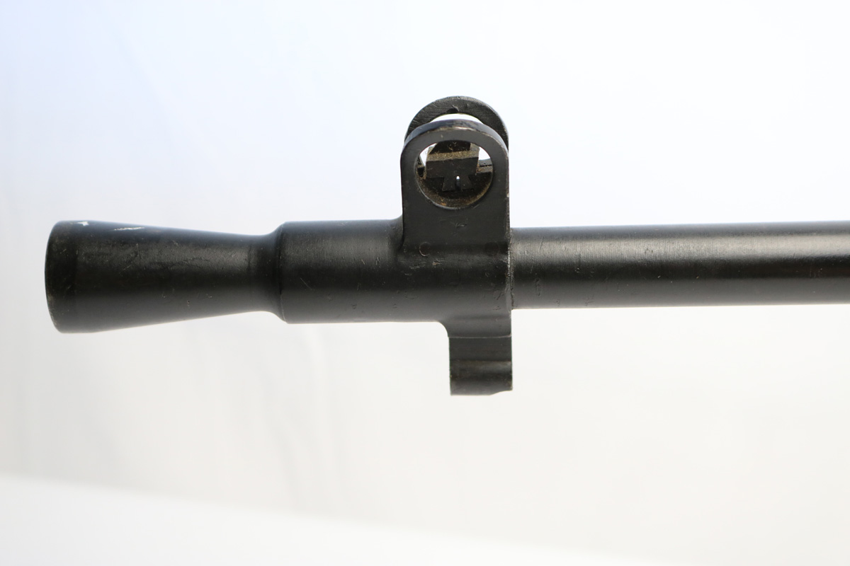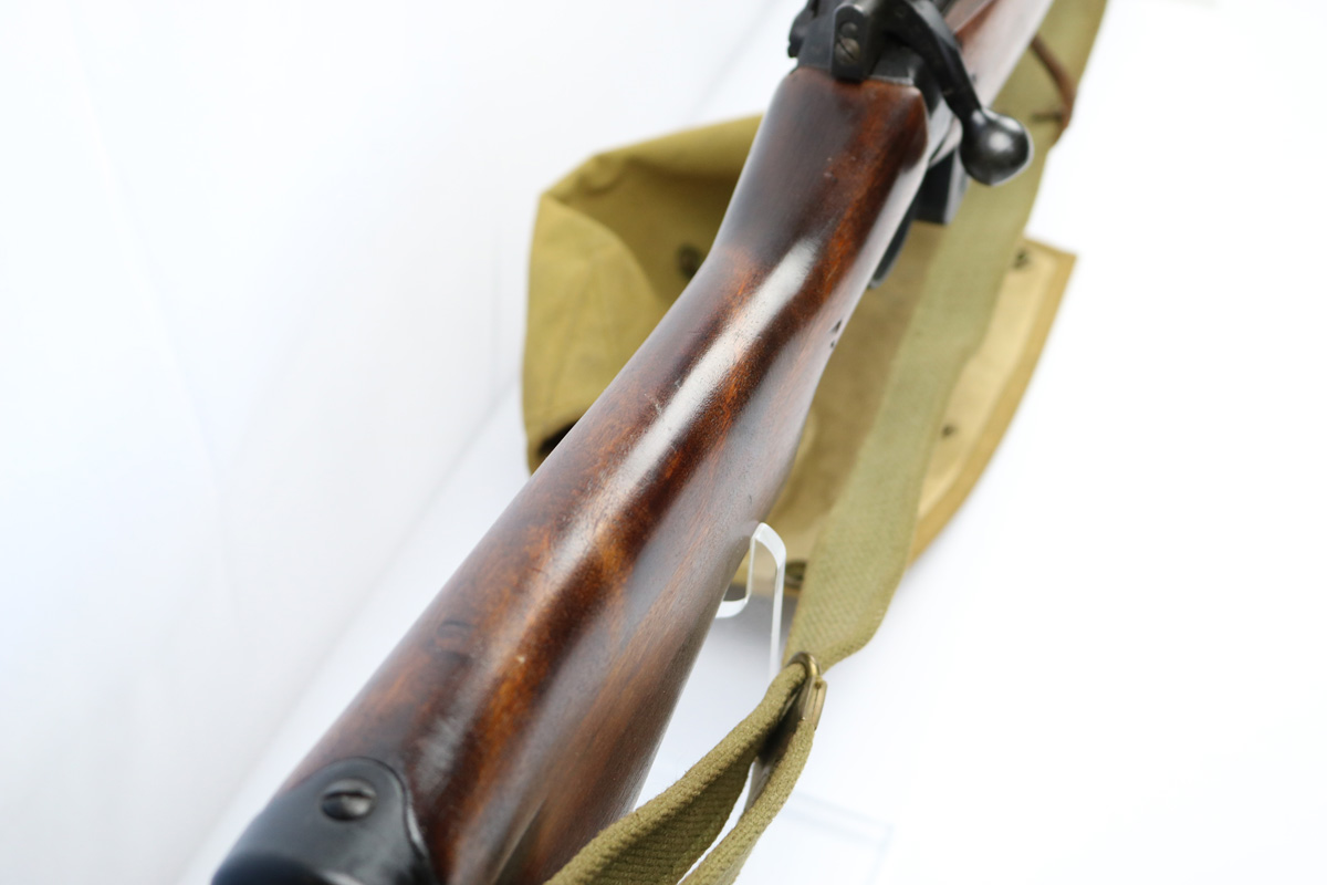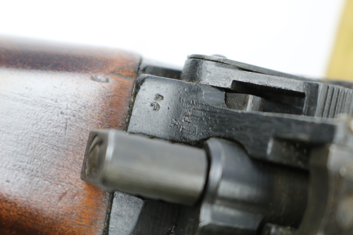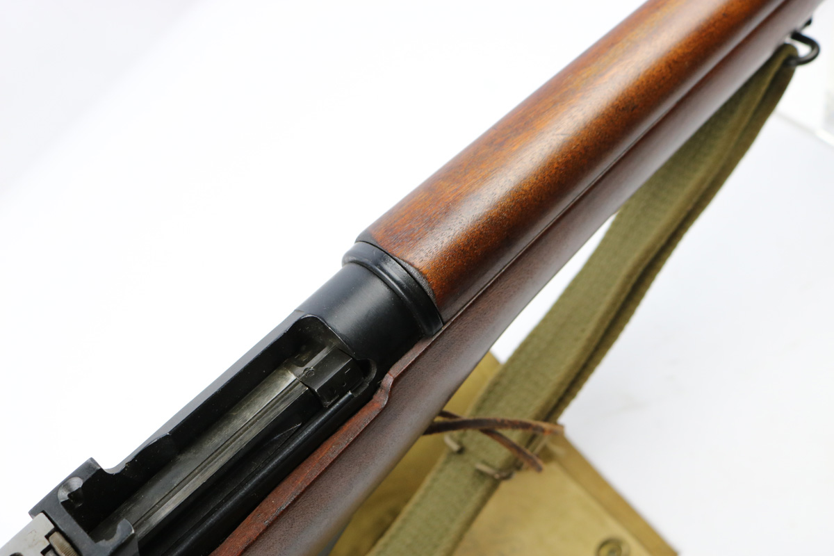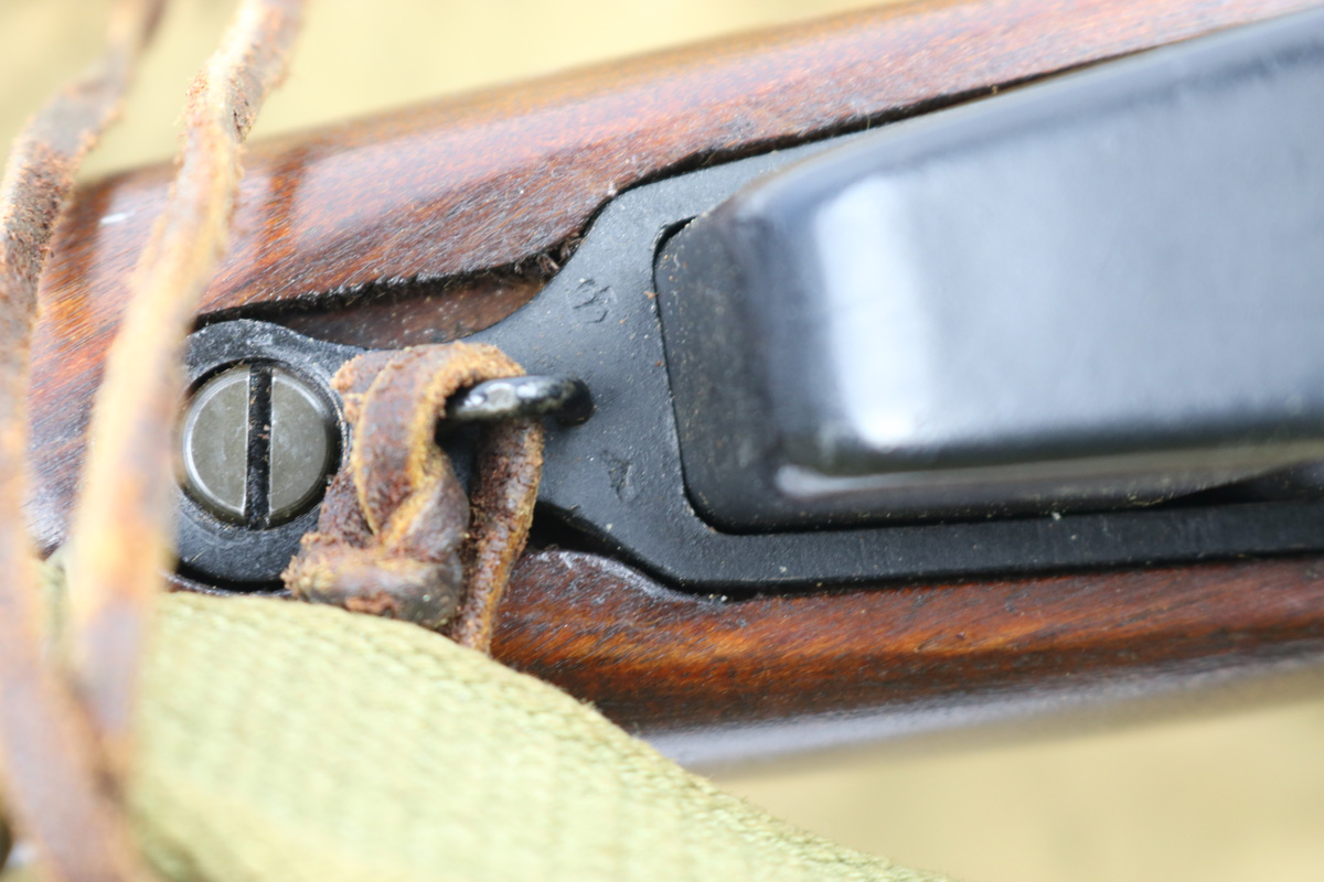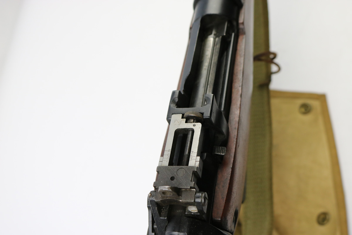6/14/18 – This is an original 1947 production Enfield No. 5 MK I Jungle Carbine. Comes complete with an original bayonet with scabbard & leather frog. Also has a sling and canvas bag (see photos). The receiver is stamped “F” for the Royal Ordnance Factory, and dated 7/47 (1947). This is the shorter and lighter version of the No.4 MK I. with a shortened forend and handguard. The finish on this rifle is excellent. The stock has no notable flaws, besides a few small indents on the underside of the stock. Some speculate this is a “kill count”. The action is smooth and the black finish is excellent. The bore has strong rifling and very clean with minimal signs of use.